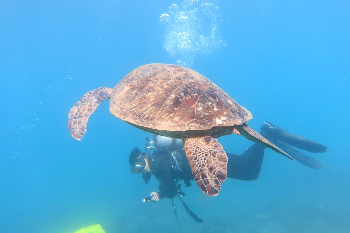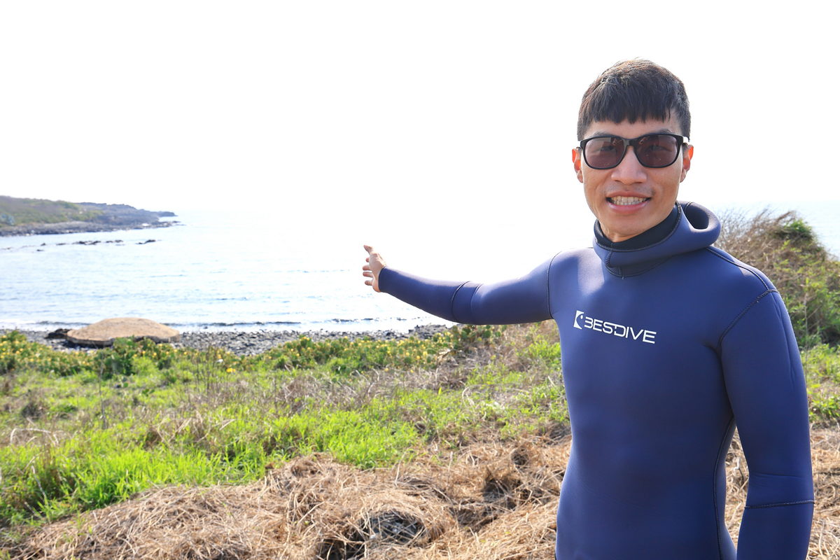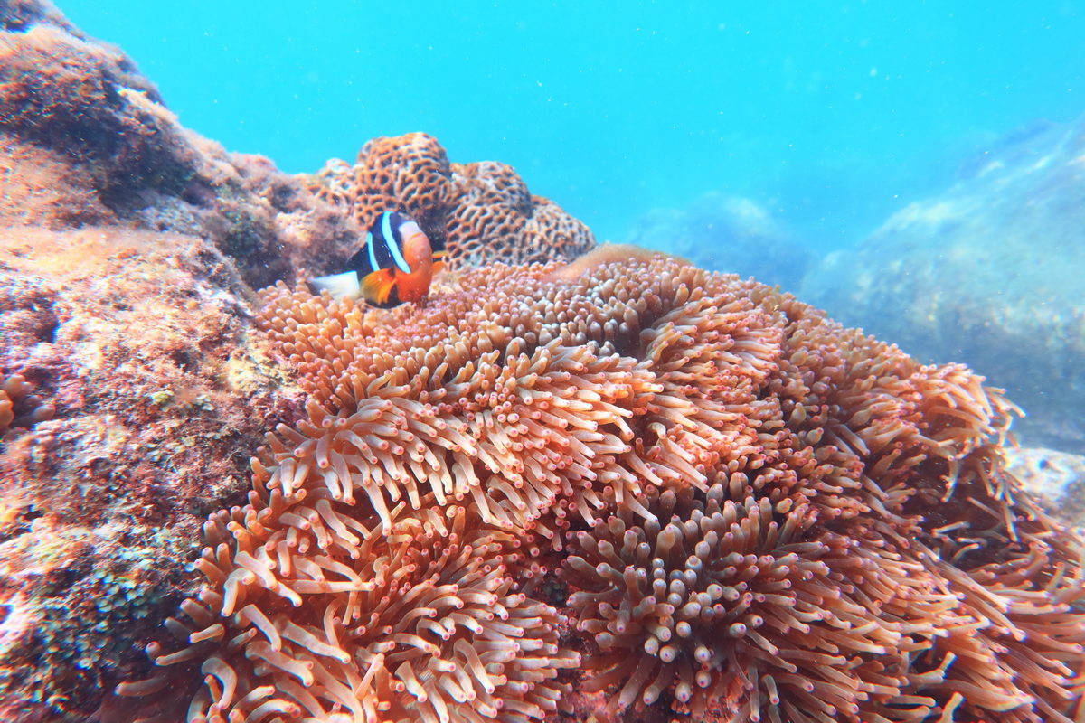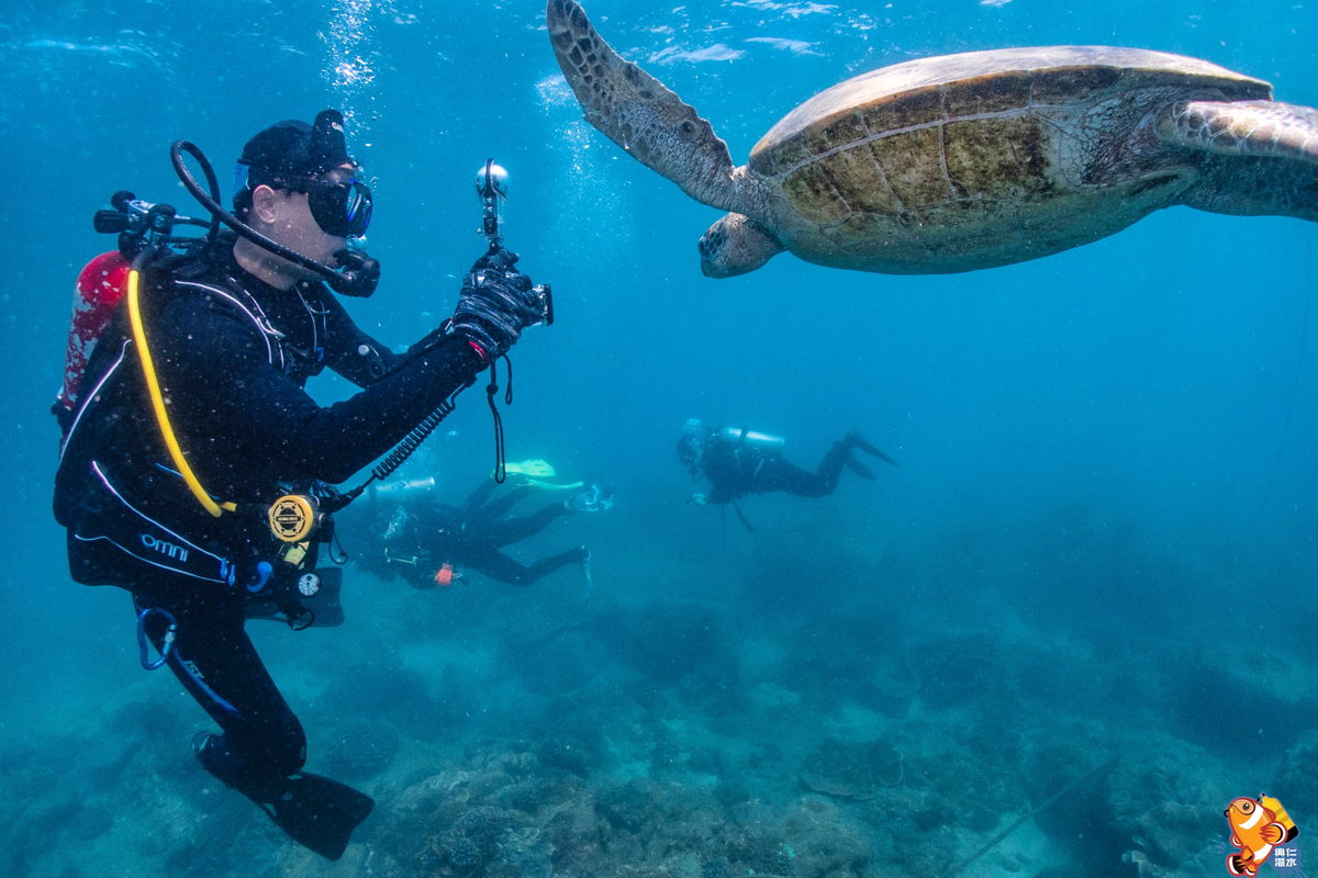 第2支潛水,我們轉往鄰近的山水漁港,順著玄武岩的岸邊走向海面,下潛後,不只珊瑚群,更多了相當療癒的小丑魚與海葵共生於此的生態,而這次潛水中,更還看到隱身於珊瑚的玳瑁石斑,其中最令人驚喜的是,此行不僅看到兩隻身形龐大的綠蠵龜在此悠游,其中一隻還相當親人的在我身邊環繞著,相當可愛呢!