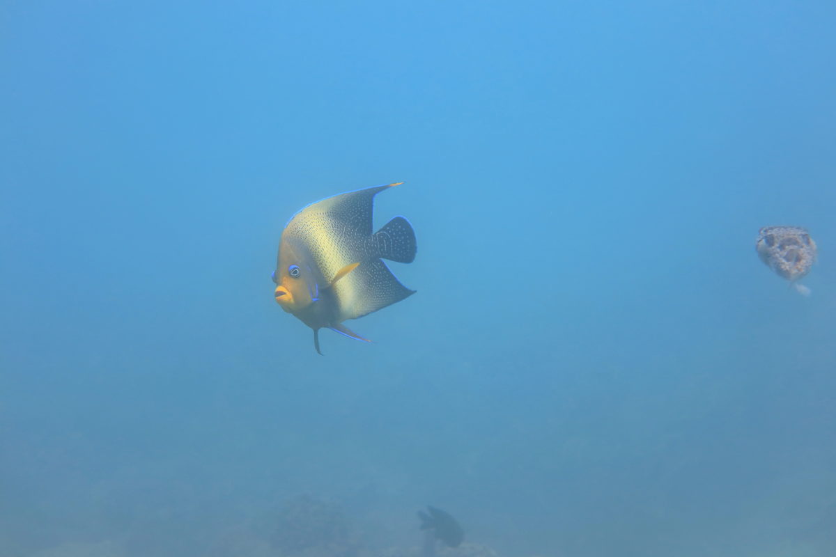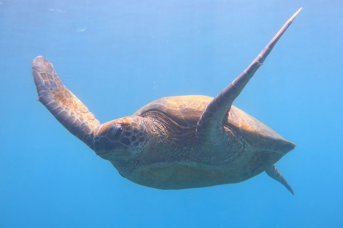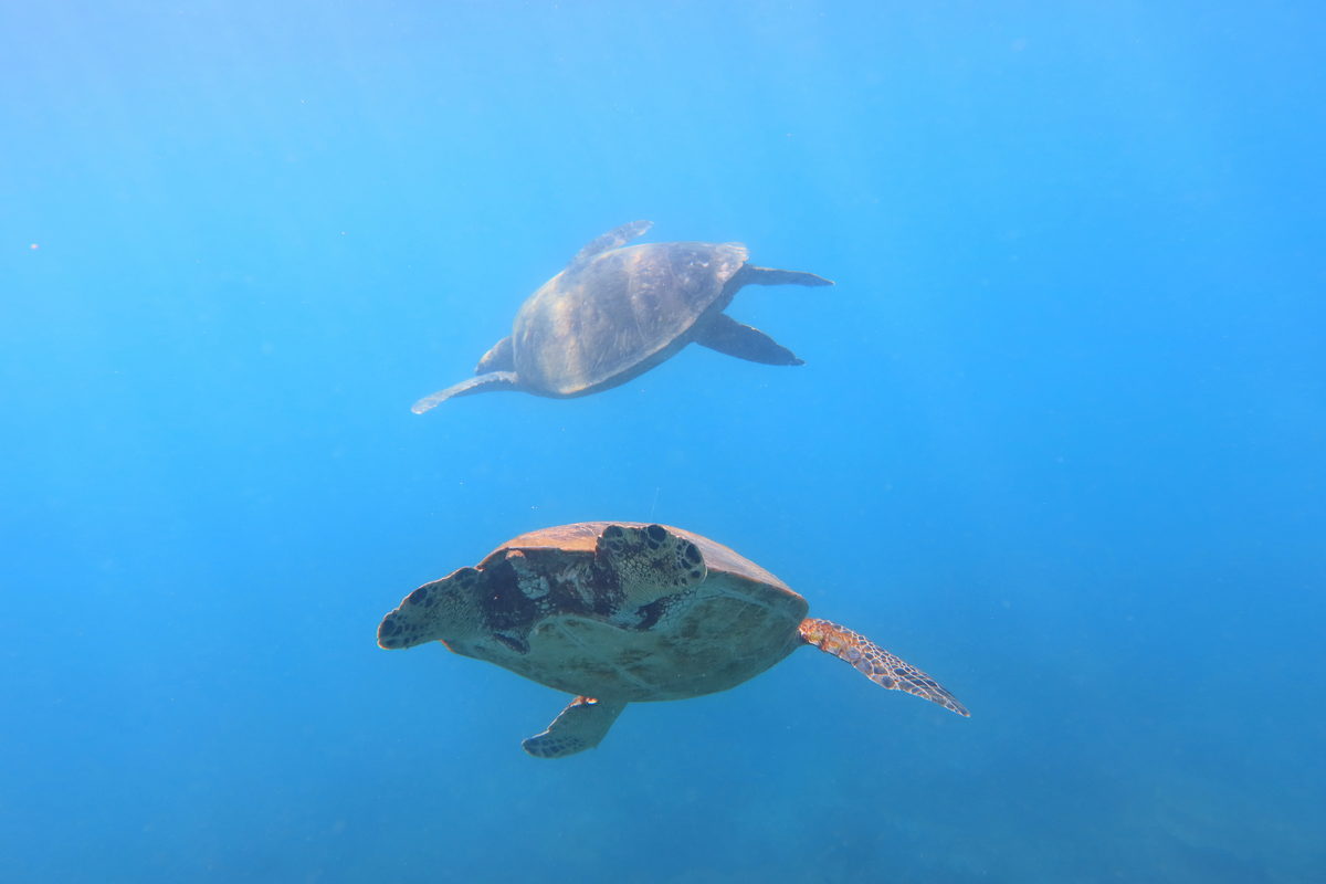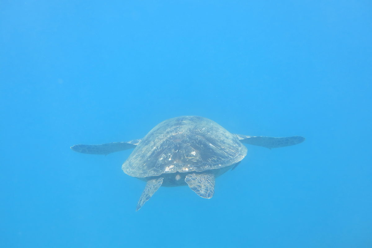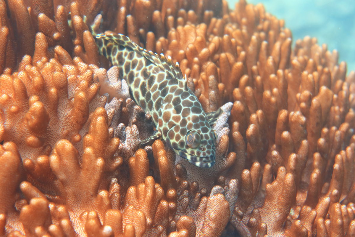 第2支潛水,我們轉往鄰近的山水漁港,順著玄武岩的岸邊走向海面,下潛後,不只珊瑚群,更多了相當療癒的小丑魚與海葵共生於此的生態,而這次潛水中,更還看到隱身於珊瑚的玳瑁石斑,其中最令人驚喜的是,此行不僅看到兩隻身形龐大的綠蠵龜在此悠游,其中一隻還相當親人的在我身邊環繞著,相當可愛呢!