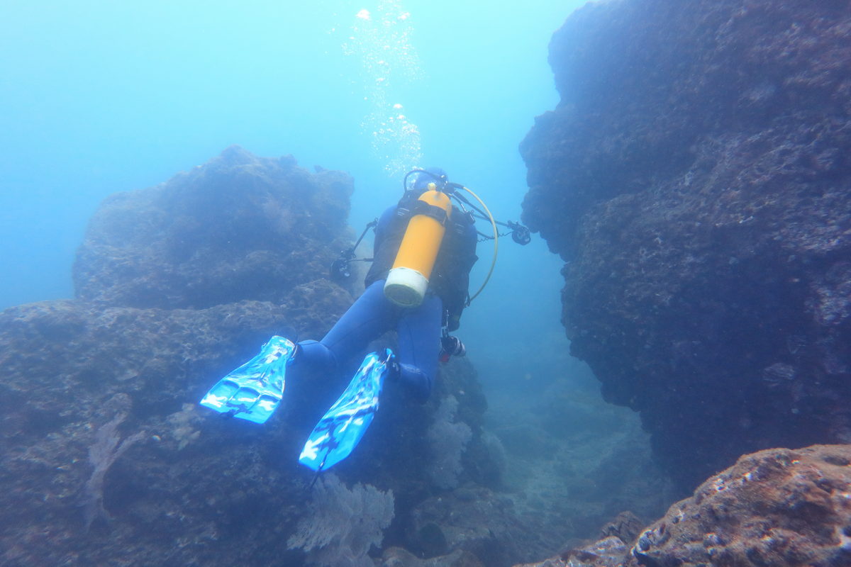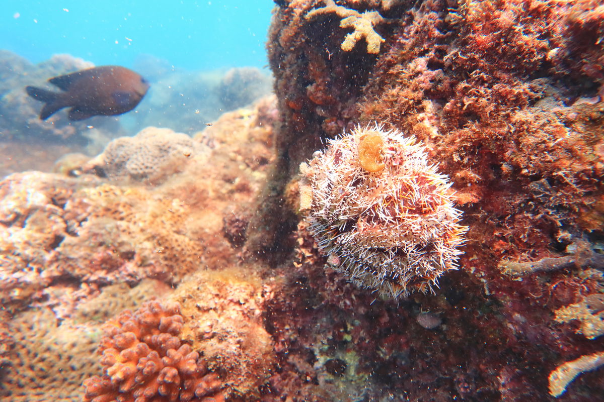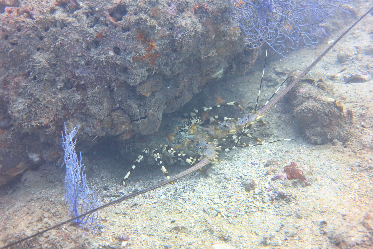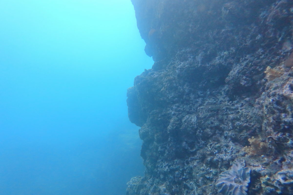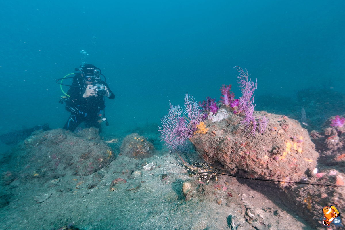 稍事休息後,下午的第3支潛水我們來到小斷層這處潛點,隨著阿宗教練一同下潛,穿過沙地後,眼前即是相當巨大的表孔珊瑚與豔麗的五線笛鯛們在其中來回穿梭,同時像是紫色花椰菜的棘穗軟珊瑚、河豚、獅子魚隨著微微的海流一同飄盪其中,更是有種寧靜的療癒感,在這一次潛水旅行中,更令我驚豔的是一隻超大的龍蝦於洞窟探出頭來,絲毫不怕人的氣勢,搭配著旁邊小巧可愛海扇所形成的強烈對比,同時潛至此行水下22.7m的最大深度時,隨著岩壁抬頭仰望水面,此時高聳筆直的岩盤更是令人感到震撼,最後回到水下5m執行3分鐘安全停留時準備浮上水面時,看著腳下岩石表面像是融化一般的有著一道道刻痕,同時海膽在其中躲藏著,上岸詢問阿宗教練這樣的地形特色後,才知道這些刻痕即是這些叫做梅氏長海膽將岩石所分泌的酸液侵蝕岩石而成,看著梅氏長海膽藏身其中的樣貌,再想到發音就是“沒事藏海膽”的念法,實在令人感到會心一笑。