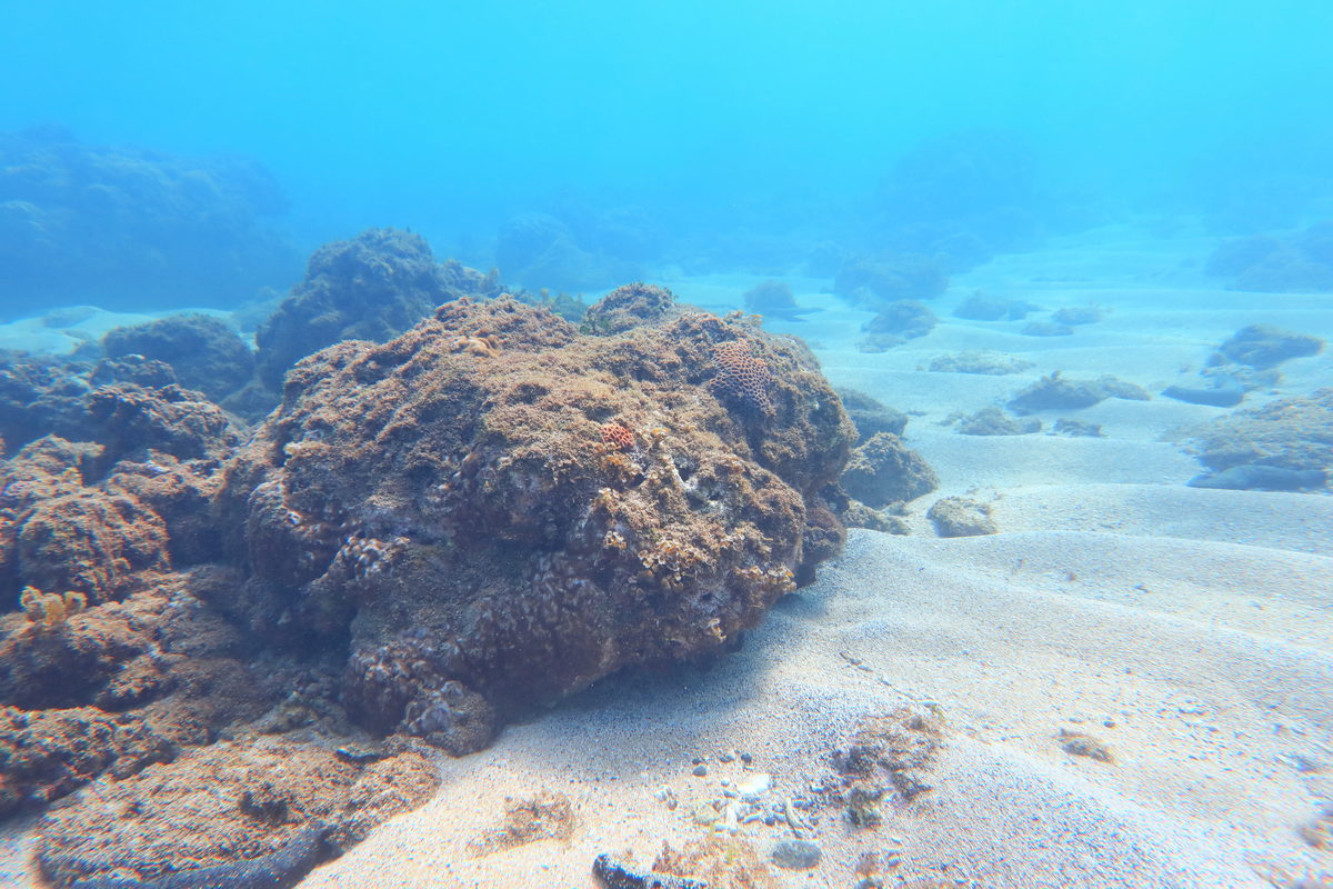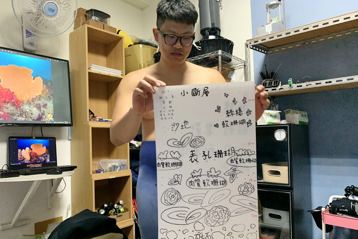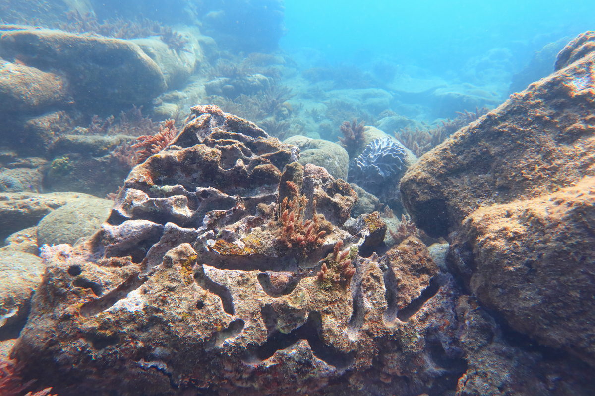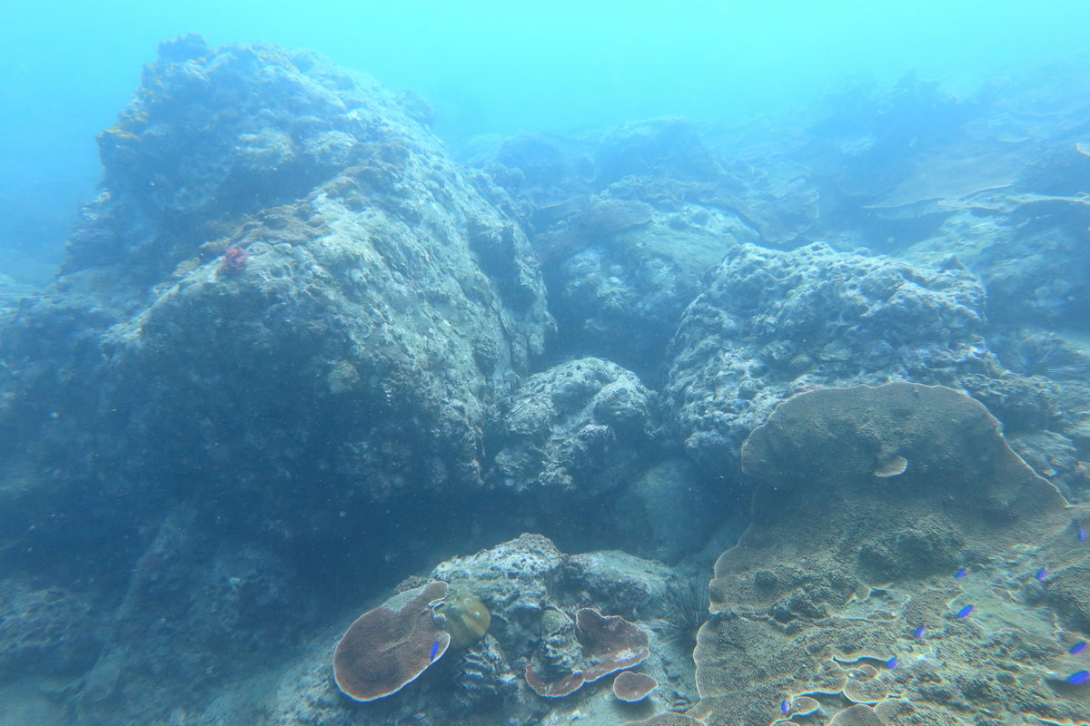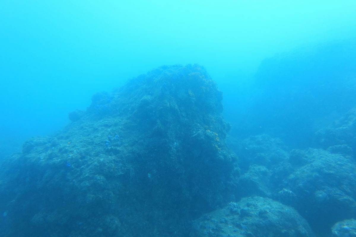 稍事休息後,下午的第3支潛水我們來到小斷層這處潛點,隨著阿宗教練一同下潛,穿過沙地後,眼前即是相當巨大的表孔珊瑚與豔麗的五線笛鯛們在其中來回穿梭,同時像是紫色花椰菜的棘穗軟珊瑚、河豚、獅子魚隨著微微的海流一同飄盪其中,更是有種寧靜的療癒感,在這一次潛水旅行中,更令我驚豔的是一隻超大的龍蝦於洞窟探出頭來,絲毫不怕人的氣勢,搭配著旁邊小巧可愛海扇所形成的強烈對比,同時潛至此行水下22.7m的最大深度時,隨著岩壁抬頭仰望水面,此時高聳筆直的岩盤更是令人感到震撼,最後回到水下5m執行3分鐘安全停留時準備浮上水面時,看著腳下岩石表面像是融化一般的有著一道道刻痕,同時海膽在其中躲藏著,上岸詢問阿宗教練這樣的地形特色後,才知道這些刻痕即是這些叫做梅氏長海膽將岩石所分泌的酸液侵蝕岩石而成,看著梅氏長海膽藏身其中的樣貌,再想到發音就是“沒事藏海膽”的念法,實在令人感到會心一笑。