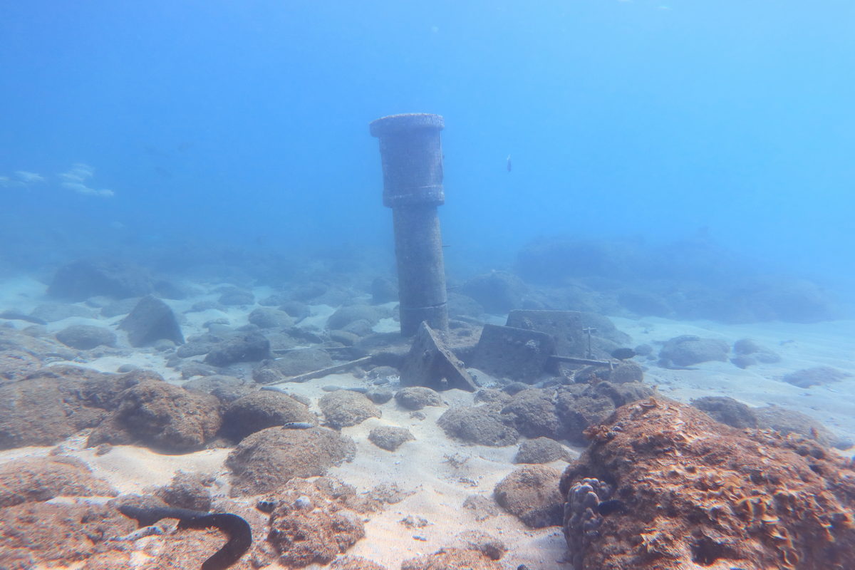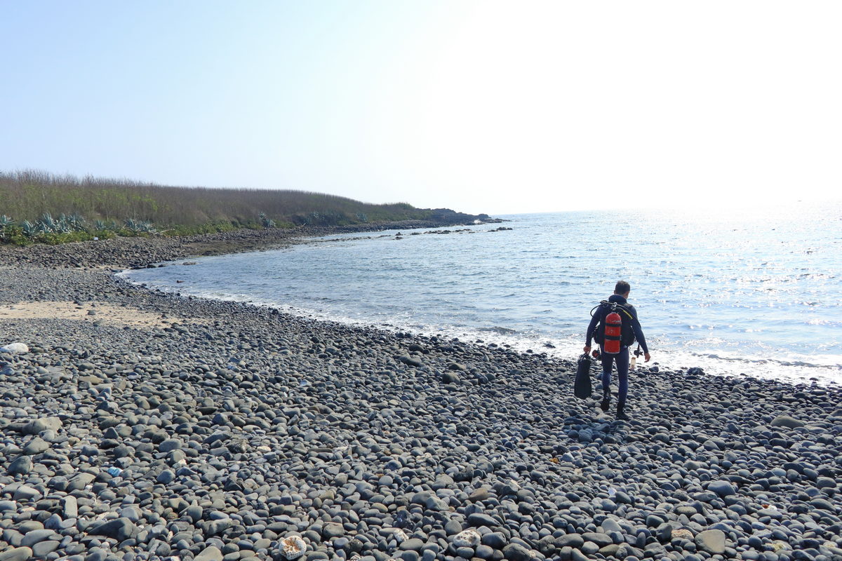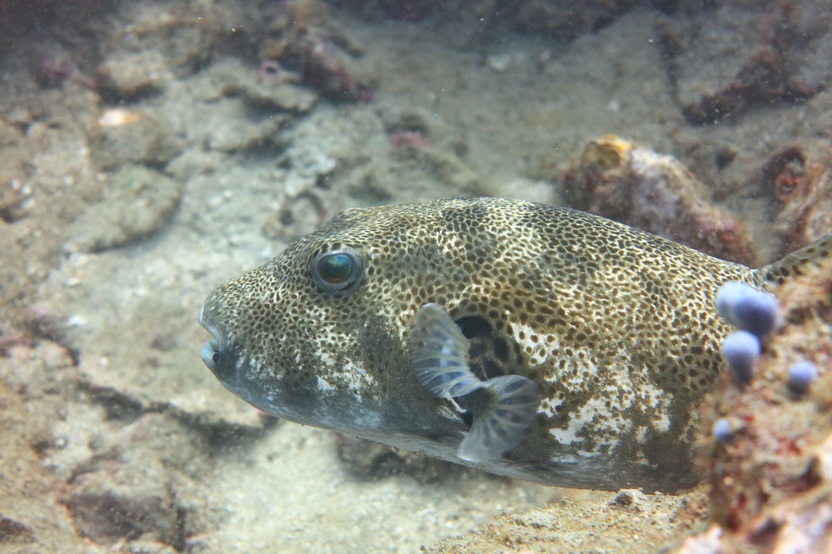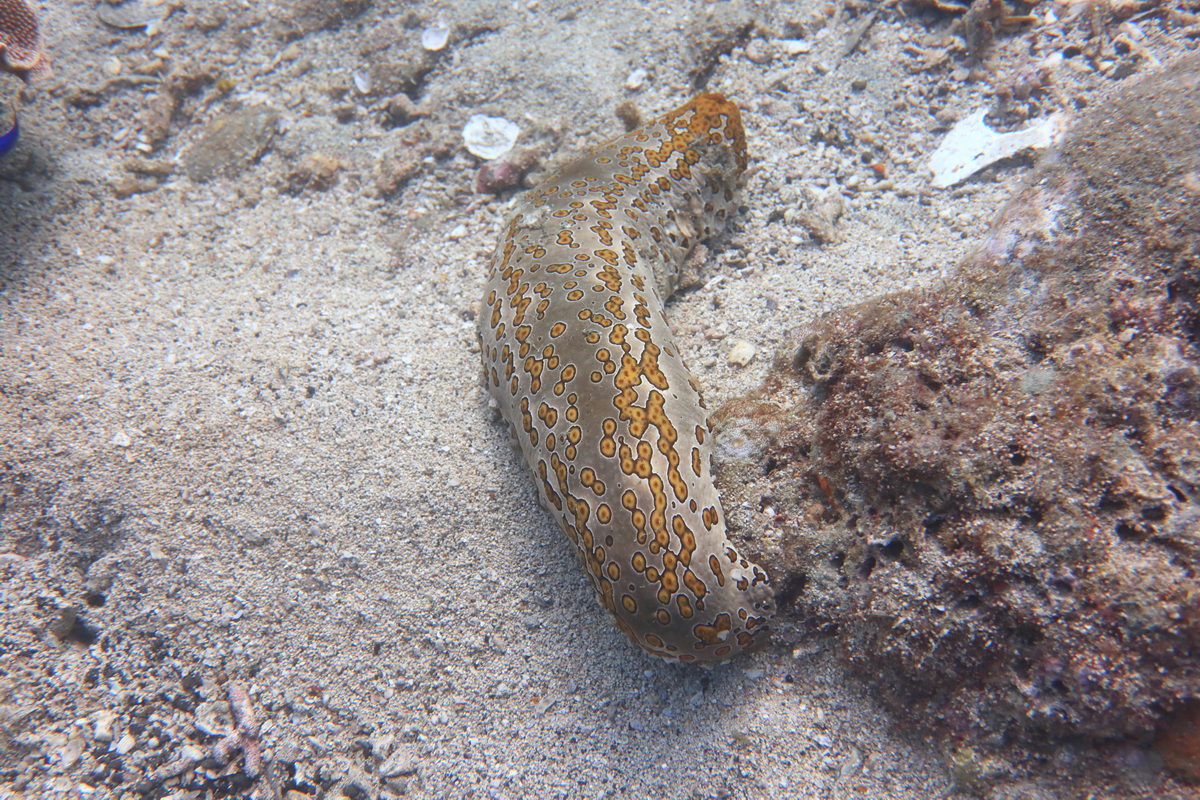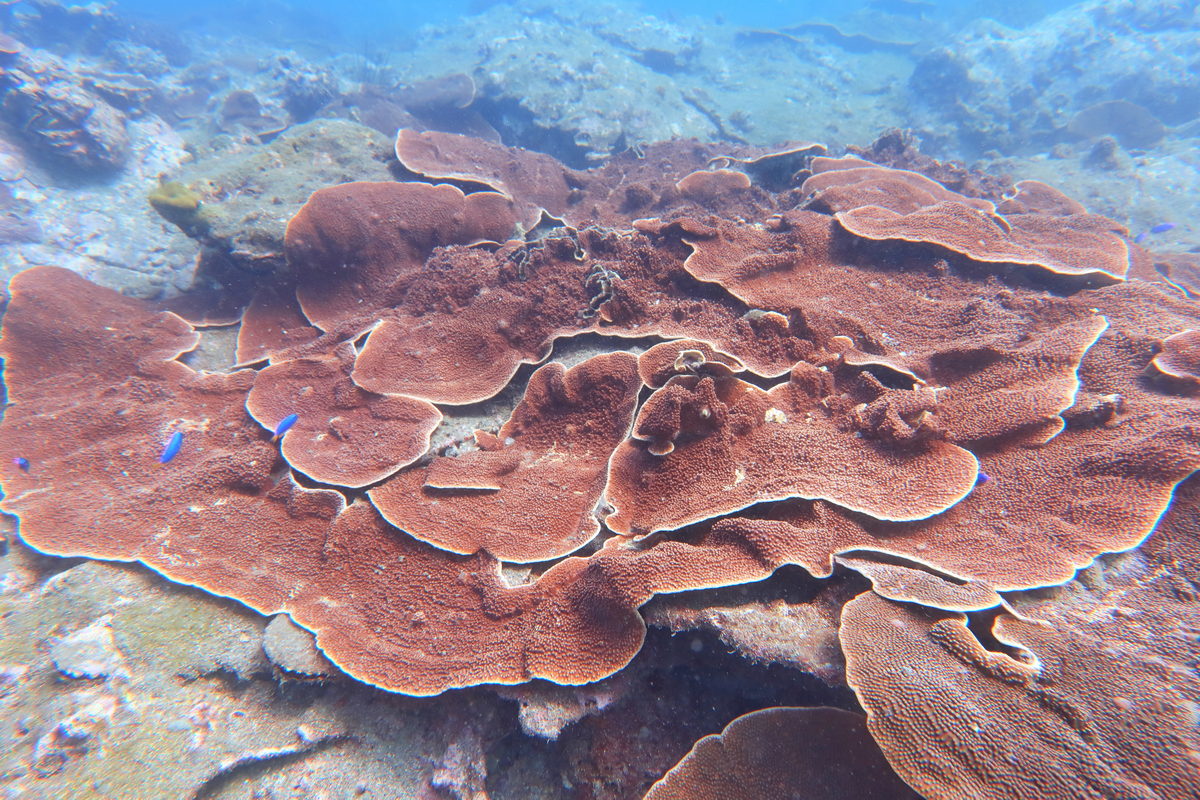 稍事休息後,下午的第3支潛水我們來到小斷層這處潛點,隨著阿宗教練一同下潛,穿過沙地後,眼前即是相當巨大的表孔珊瑚與豔麗的五線笛鯛們在其中來回穿梭,同時像是紫色花椰菜的棘穗軟珊瑚、河豚、獅子魚隨著微微的海流一同飄盪其中,更是有種寧靜的療癒感,在這一次潛水旅行中,更令我驚豔的是一隻超大的龍蝦於洞窟探出頭來,絲毫不怕人的氣勢,搭配著旁邊小巧可愛海扇所形成的強烈對比,同時潛至此行水下22.7m的最大深度時,隨著岩壁抬頭仰望水面,此時高聳筆直的岩盤更是令人感到震撼,最後回到水下5m執行3分鐘安全停留時準備浮上水面時,看著腳下岩石表面像是融化一般的有著一道道刻痕,同時海膽在其中躲藏著,上岸詢問阿宗教練這樣的地形特色後,才知道這些刻痕即是這些叫做梅氏長海膽將岩石所分泌的酸液侵蝕岩石而成,看著梅氏長海膽藏身其中的樣貌,再想到發音就是“沒事藏海膽”的念法,實在令人感到會心一笑。
