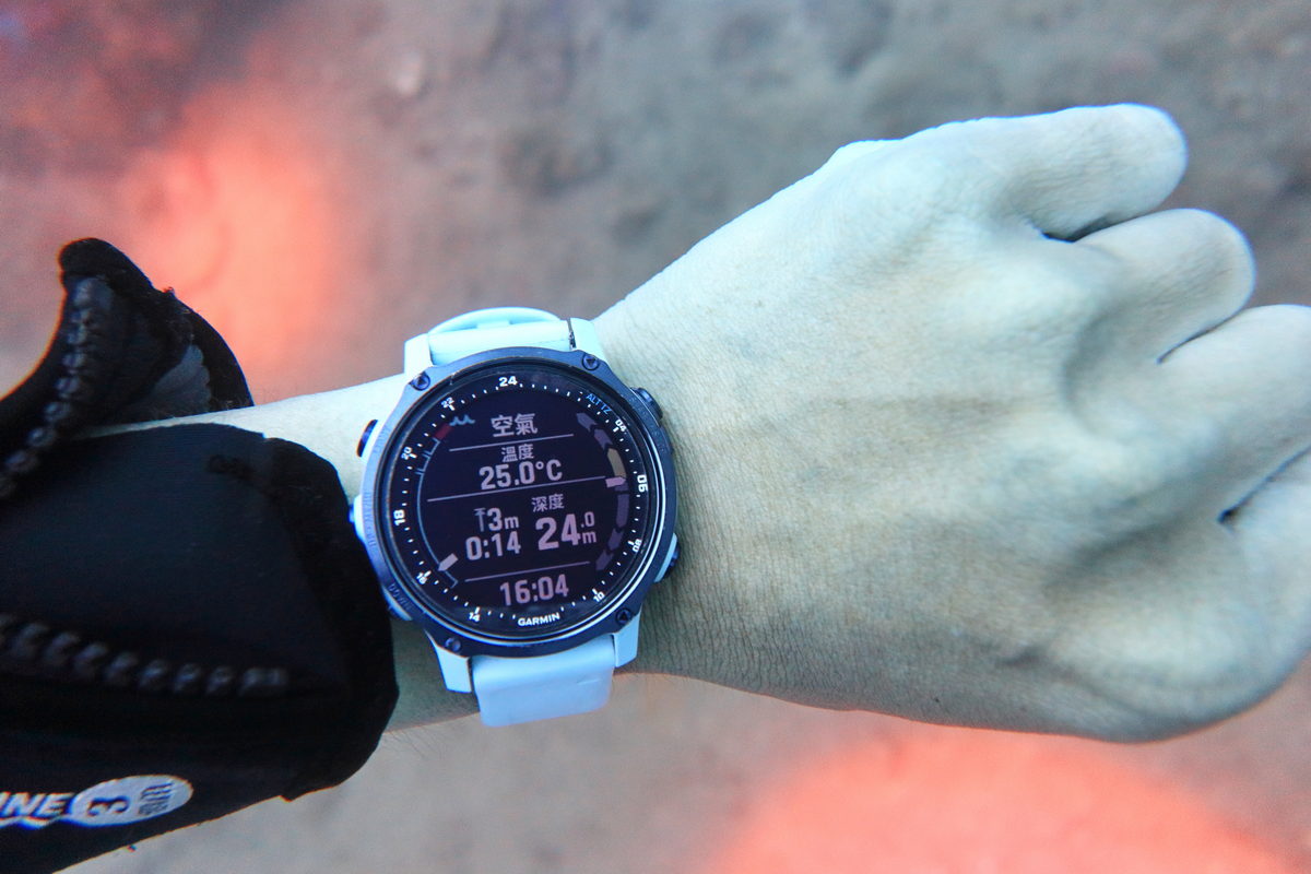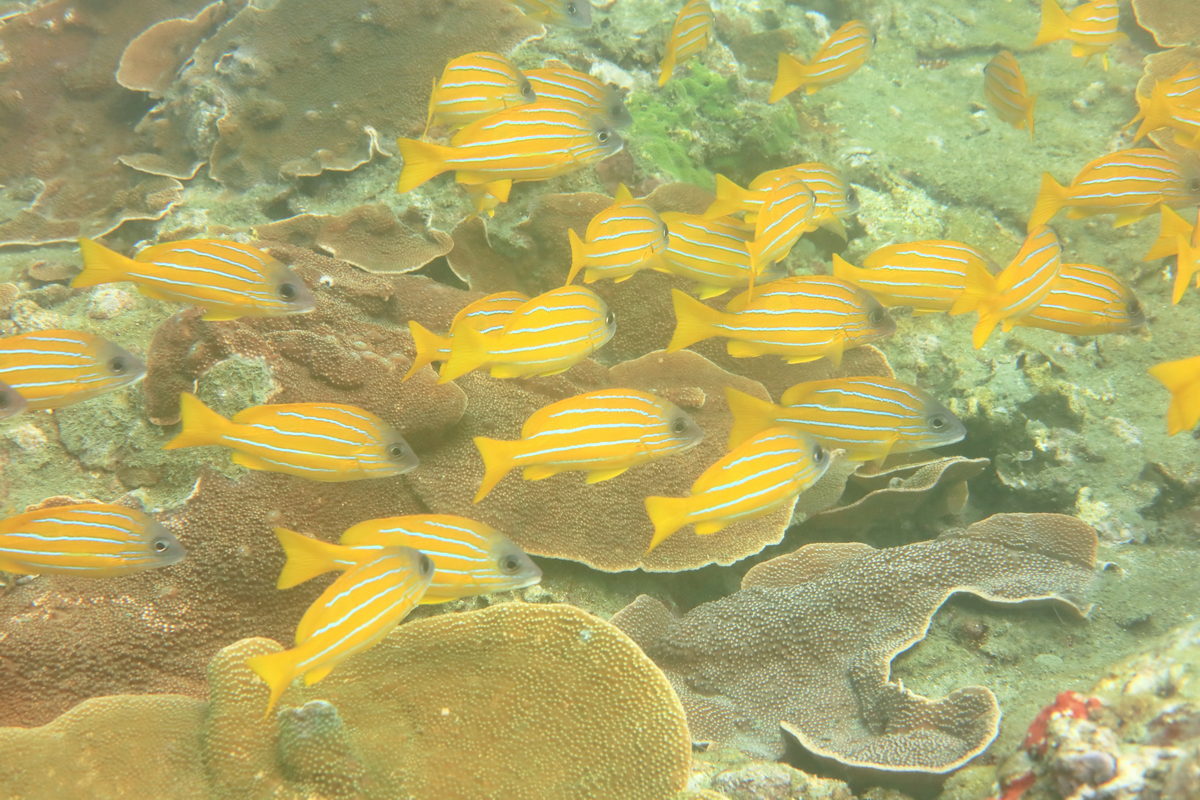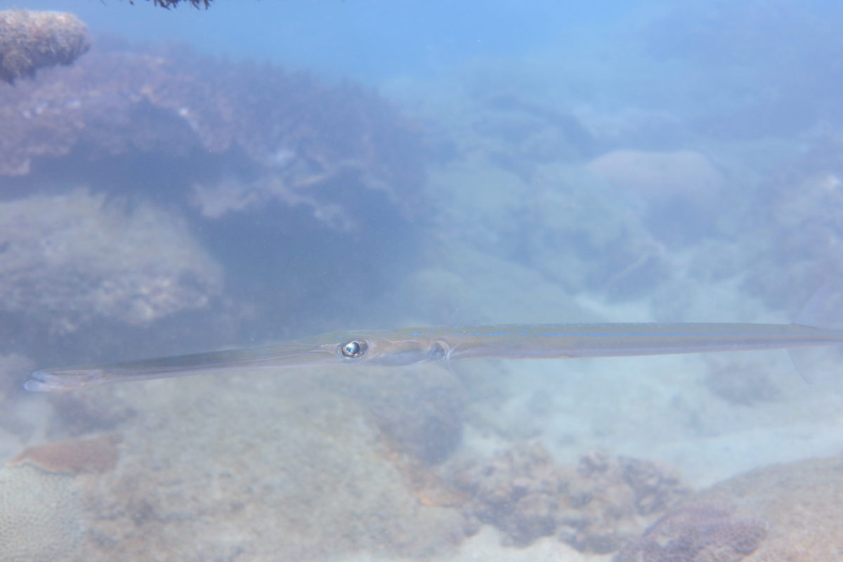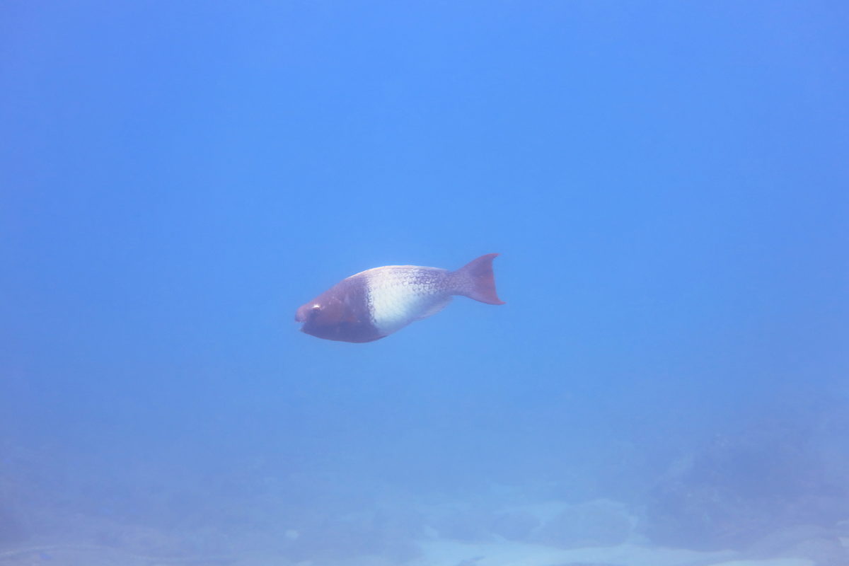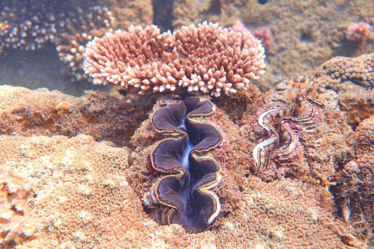 稍事休息後,下午的第3支潛水我們來到小斷層這處潛點,隨著阿宗教練一同下潛,穿過沙地後,眼前即是相當巨大的表孔珊瑚與豔麗的五線笛鯛們在其中來回穿梭,同時像是紫色花椰菜的棘穗軟珊瑚、河豚、獅子魚隨著微微的海流一同飄盪其中,更是有種寧靜的療癒感,在這一次潛水旅行中,更令我驚豔的是一隻超大的龍蝦於洞窟探出頭來,絲毫不怕人的氣勢,搭配著旁邊小巧可愛海扇所形成的強烈對比,同時潛至此行水下22.7m的最大深度時,隨著岩壁抬頭仰望水面,此時高聳筆直的岩盤更是令人感到震撼,最後回到水下5m執行3分鐘安全停留時準備浮上水面時,看著腳下岩石表面像是融化一般的有著一道道刻痕,同時海膽在其中躲藏著,上岸詢問阿宗教練這樣的地形特色後,才知道這些刻痕即是這些叫做梅氏長海膽將岩石所分泌的酸液侵蝕岩石而成,看著梅氏長海膽藏身其中的樣貌,再想到發音就是“沒事藏海膽”的念法,實在令人感到會心一笑。