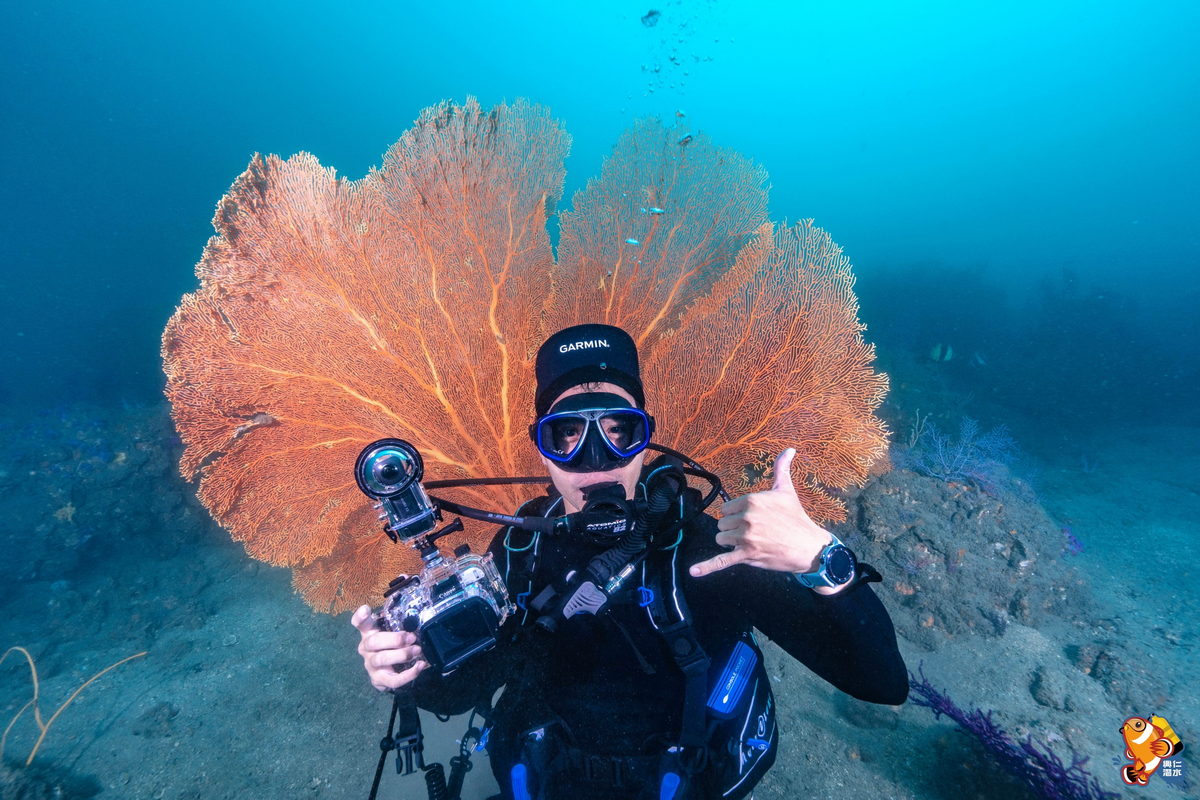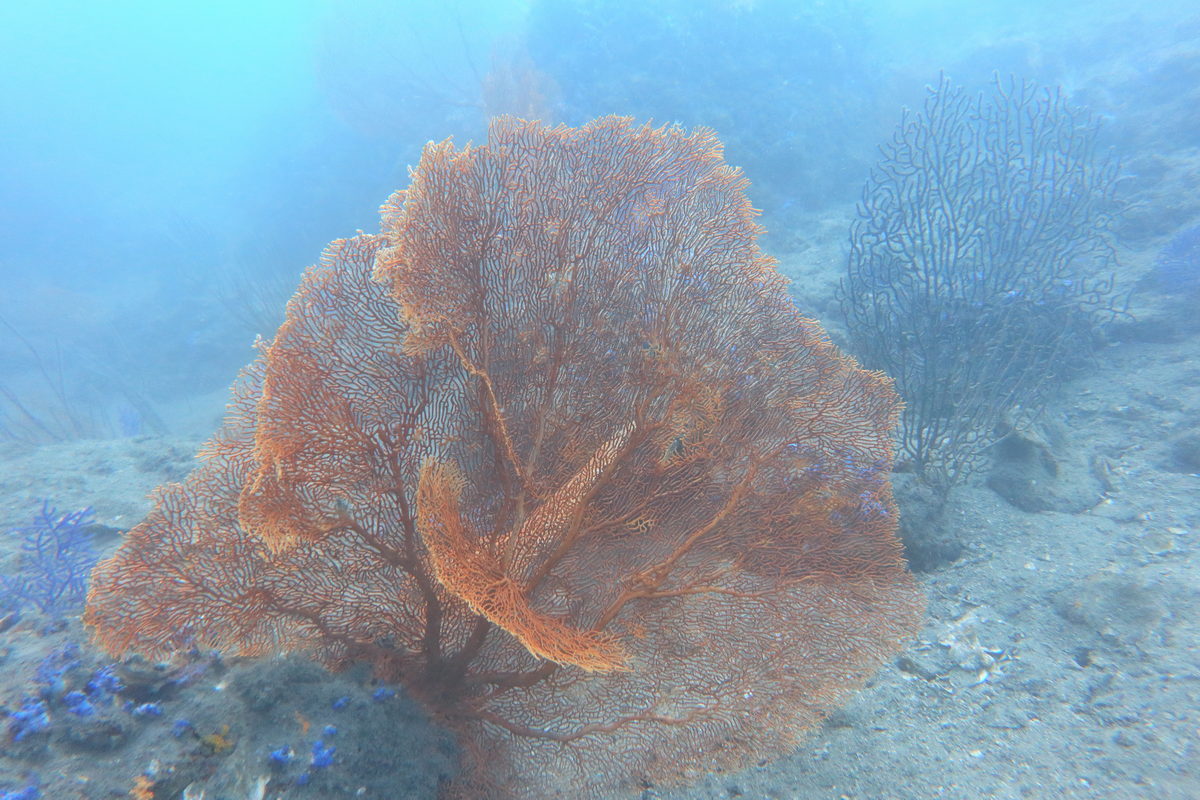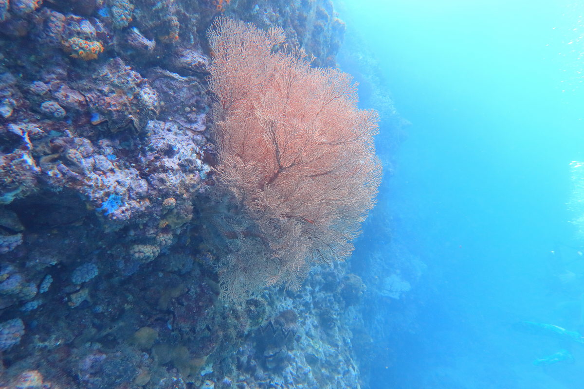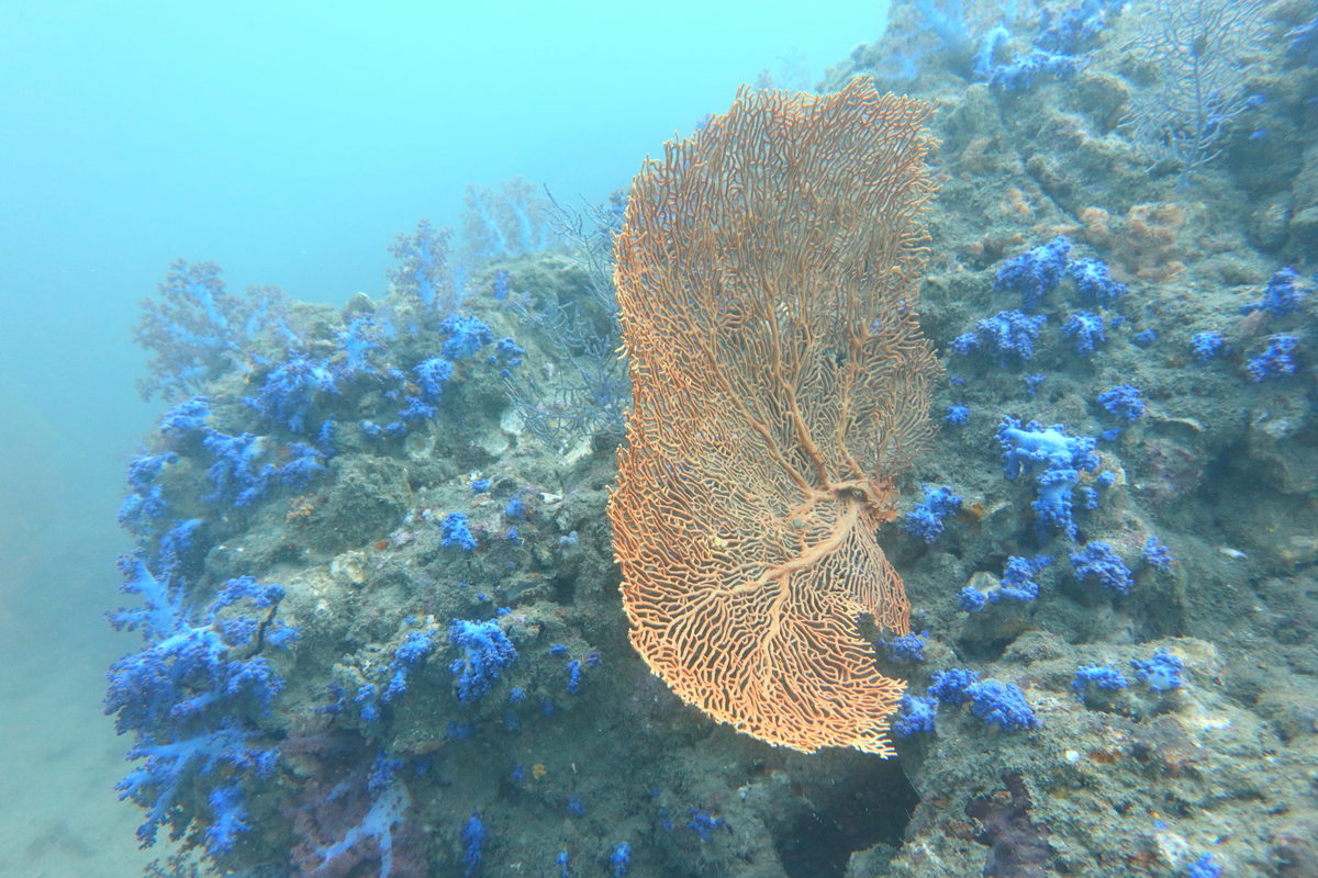 最後的第4潛,我們決定欣賞有著壯麗海扇的祕密花園潛點,而此處能有著大片面積的海扇生長於此,不僅拜大陸沿岸流豐富的微生物與營養鹽提供其養分之外,同時也因為較為強勁的海流將這些養分源源不絕地提供給靠著珊瑚蟲觸手補食為生的海扇們,進入水下後,不僅眼前的海扇隨著深度逐漸變得更為大片之外,有的甚至有2-3個人寬的巨大,同時金色、紅色、紫色繽紛的多樣性,映襯著棘穗軟珊瑚、陡峭的岩壁,享受這唯美的壯麗作為這一次澎湖潛水的尾聲,再完美不過了。
