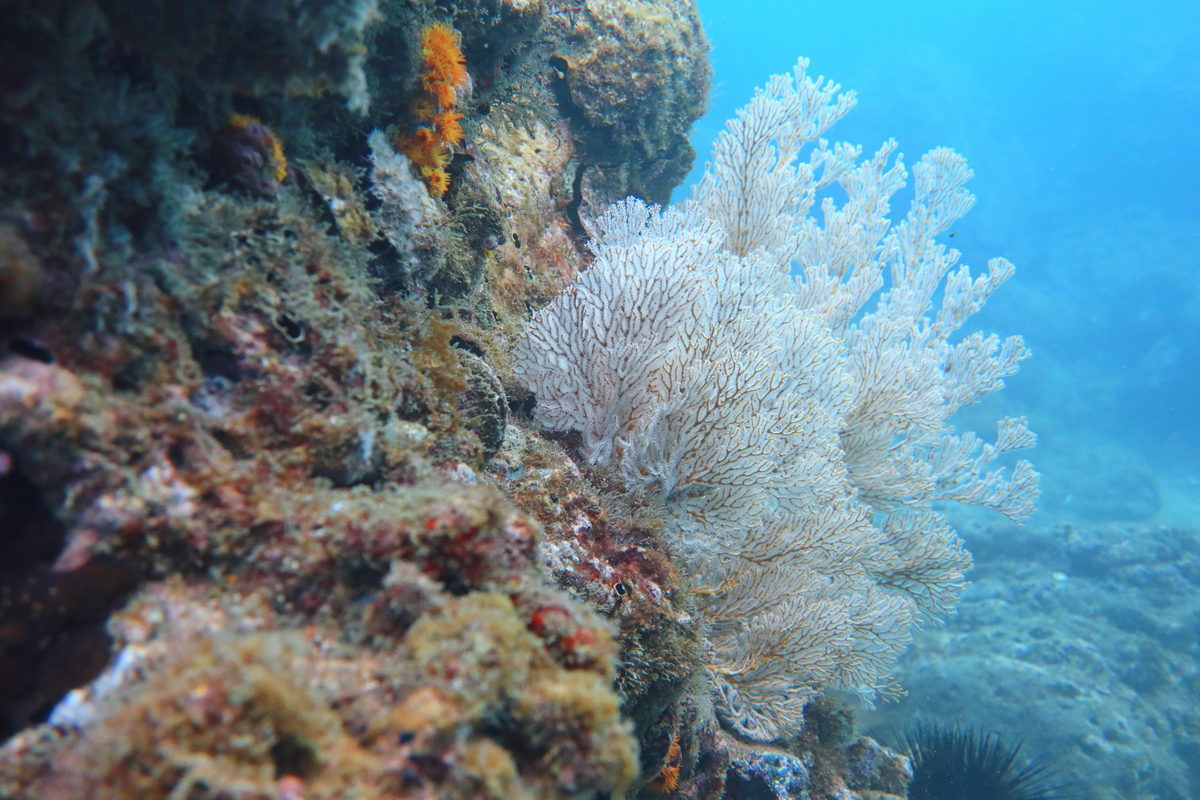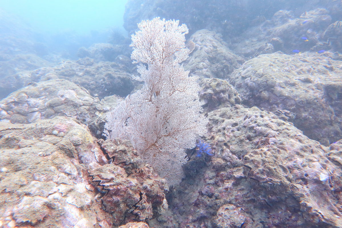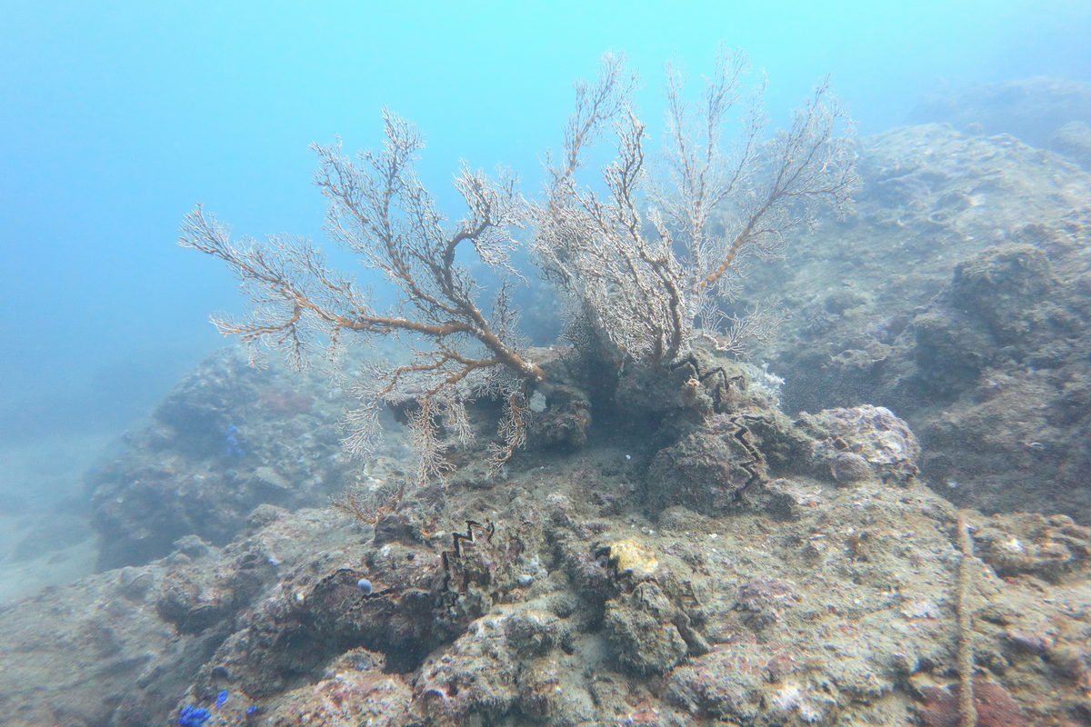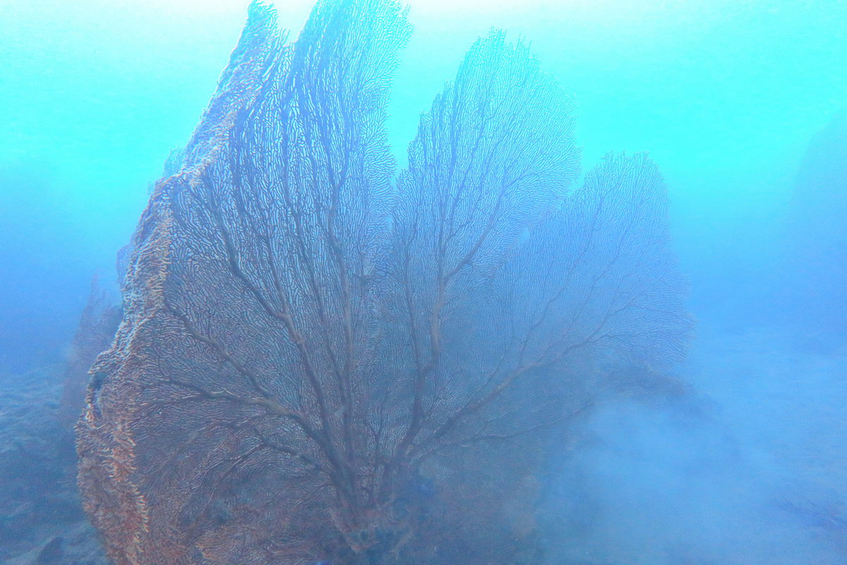 最後的第4潛,我們決定欣賞有著壯麗海扇的祕密花園潛點,而此處能有著大片面積的海扇生長於此,不僅拜大陸沿岸流豐富的微生物與營養鹽提供其養分之外,同時也因為較為強勁的海流將這些養分源源不絕地提供給靠著珊瑚蟲觸手補食為生的海扇們,進入水下後,不僅眼前的海扇隨著深度逐漸變得更為大片之外,有的甚至有2-3個人寬的巨大,同時金色、紅色、紫色繽紛的多樣性,映襯著棘穗軟珊瑚、陡峭的岩壁,享受這唯美的壯麗作為這一次澎湖潛水的尾聲,再完美不過了。