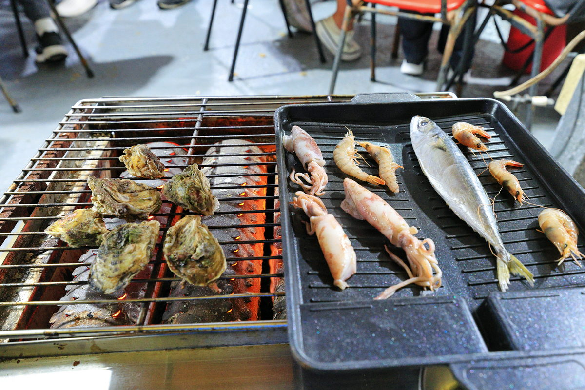 若是想要來個本格派的豪邁海鮮餐,那麼澎湖的鮮蚵必定不容錯過,在馬公市裡,有著許多海鮮炭烤吃到飽的店,而我選擇從旅館步行即可抵達的【一品無煙燒烤】,從半開放式的用餐空間,加上每一爐都有著抽風排煙設備,光是想到身體不會沾附過多海鮮炭烤的味道,就覺得相當舒服,坐下來後,從冰箱拿著魚蝦小卷等食材來烤之外,一旁一簍一簍的尚青蚵仔才是在此吃到飽最爽快地享受,等待蚵殼張開,用夾子剝開後眼前飽滿的蚵肉,以及入口後鹹鮮回甘的滋味,不知不覺一頓炭烤吃到飽的饗宴已經吃了將近50顆的爽快呢!