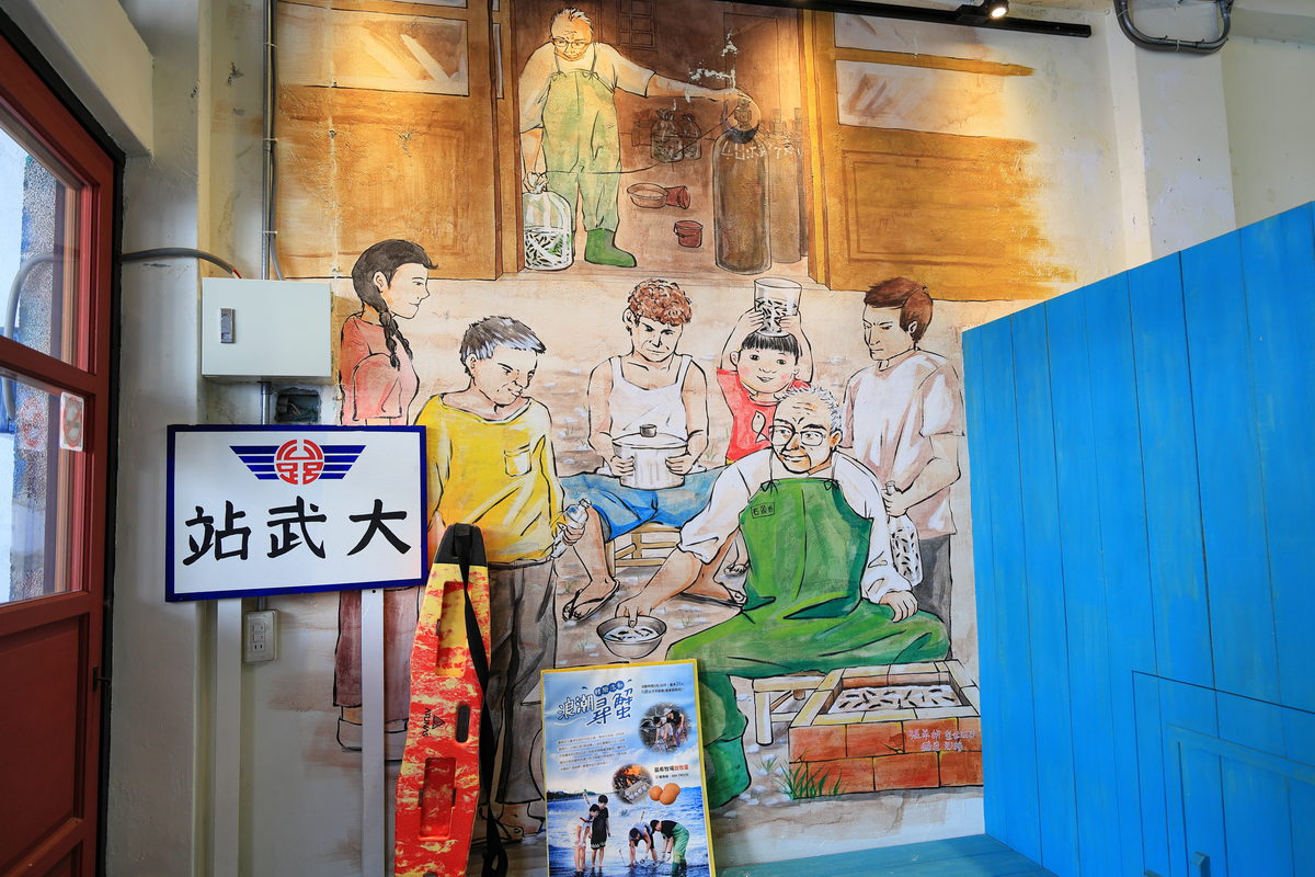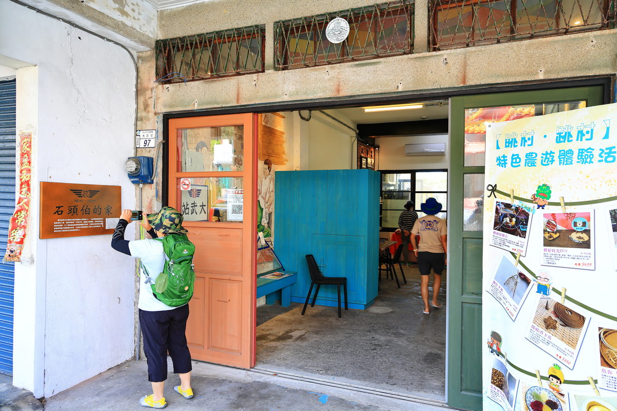 穿過彩虹屋隨著玲芳走入老街中,首先我們走到“董石頭”的石頭伯家中,可別以為我打錯字,或是石頭伯真的因為很“懂”石頭而有此稱號,石頭伯是真的姓董名石頭的一位大武村相當知名的人物,而他的故居在當時養殖漁業尚未發達的年代,台灣漁市能吃到的虱目魚,皆為台東近海捕獲的虱目魚苗,再轉往西海岸進行養殖令其長大後,才進入漁市銷售,而石頭伯的家即是大武地區漁民們每日於早晨駕駛著舢舨出海捕撈魚苗後,於此進行集散分裝送往各地的魚苗買賣市集,而隨著玲芳的解說下,進入屋內欣賞昔日石頭伯分裝魚苗的壁畫、日治時期的大武村街景照片,更能想像昔日此處的熱鬧非凡呢!