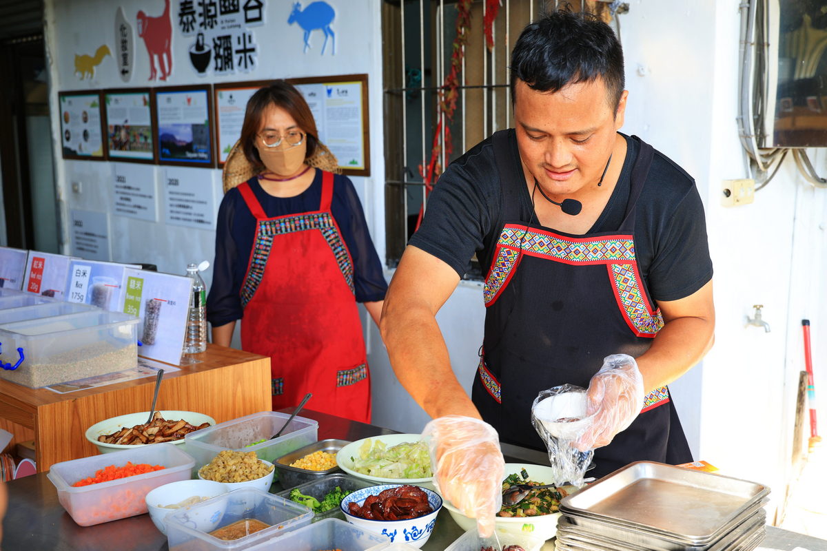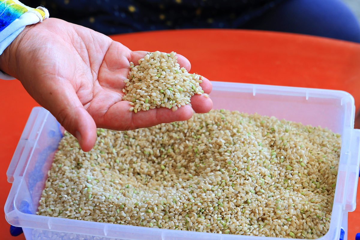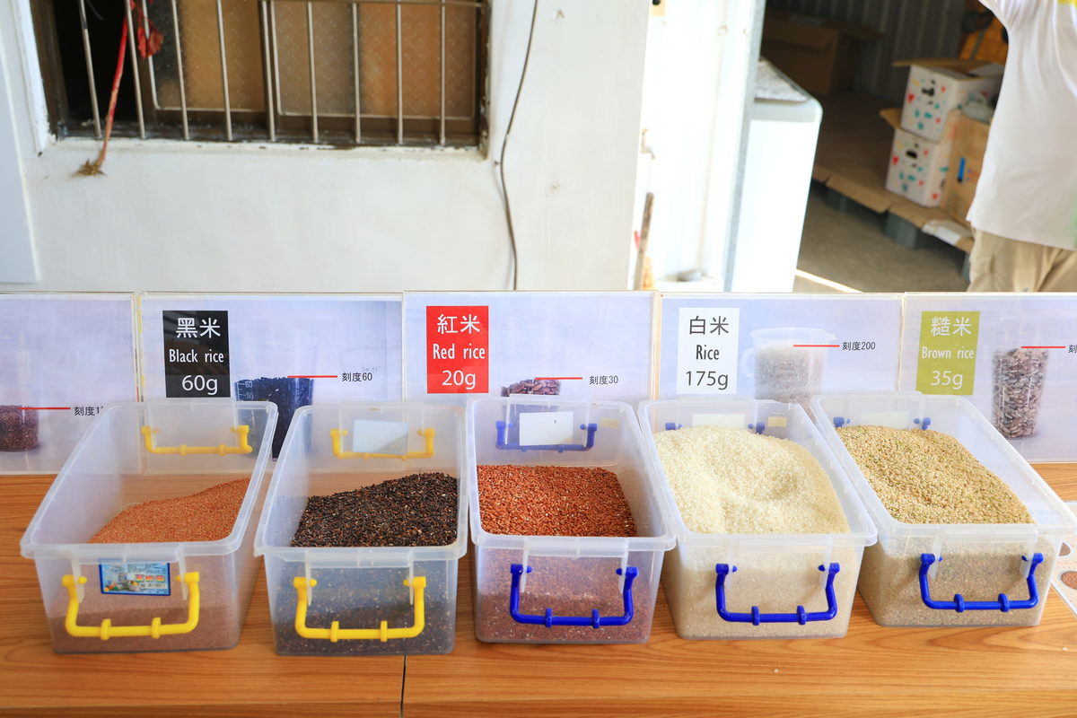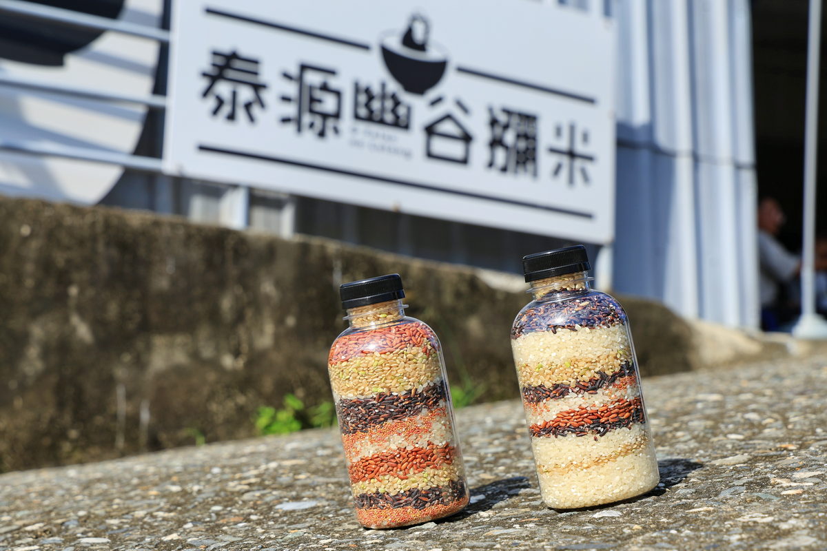 因此我們拜訪了座落於優美水田旁的【泰源幽谷獼米】,透過主理人阿美族的黃忠文、蔡禮闈夫婦的分享辭去公職返鄉,與父母重新學習務農,在這片翠綠環山下以不施肥、不用藥的自然無毒農法種植著各式稻米作物,也因在這自然靜謐的盆地環境,山間的獼猴常在夜裡下山品味著天然純淨的穀物,一同與萬物分享的理念,發展為獼米的有趣意念,這次的造訪,他們以收成的新米依照來訪的旅人人數,去殼輾打對應數量的新鮮稻米,同時我們一同以白米、黑米、紅米、糙米與紅藜製作相當健康且賞心悅目的五色米帶回家煮食,而在現場也以煮熟的五色米,愜意的搭配喜歡的蔬菜、肉類,包裹成一顆顆晶瑩剔透的飯糰,在這片翠綠的山林盆地中,品味著五色米香越嚼越滿是稻香的Q甜美味,真是閒情逸致呢!