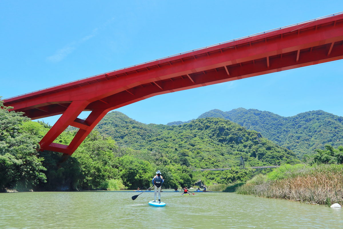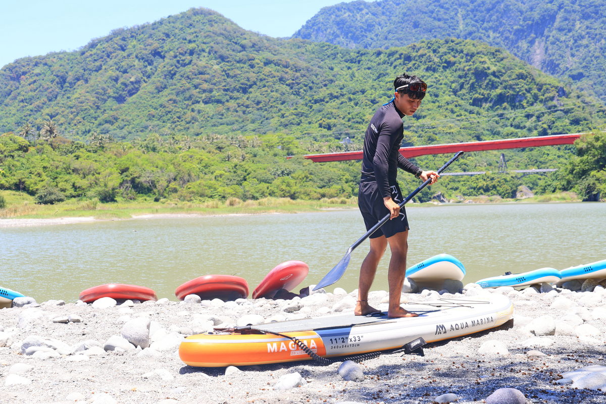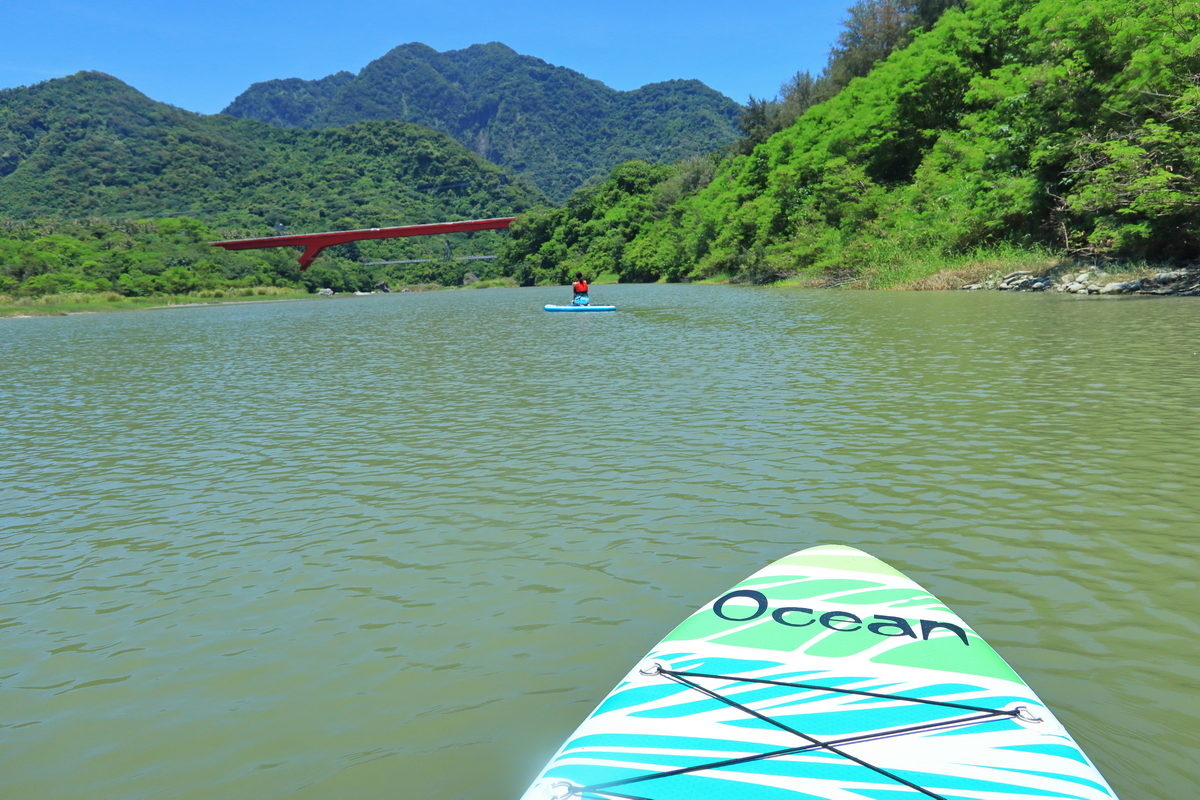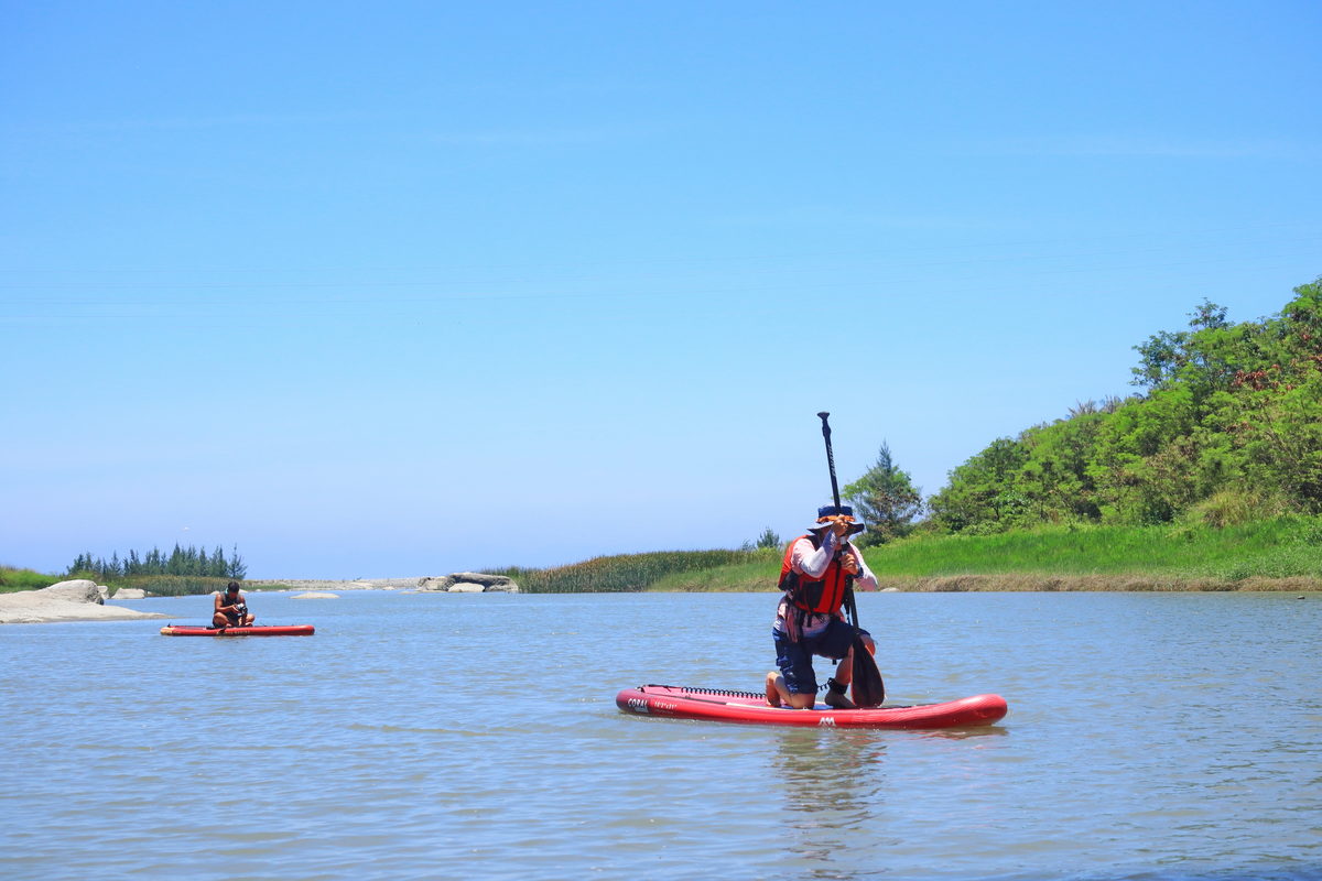 品味了一丸可口營養滿分的飯糰後,我們再隨著馬武窟溪順流而下,抵達位於出海口的東河橋下與善於溯溪、SUP的【TryFun野萃文化】一同會合,因為除了感受馬武窟溪孕育泰源幽谷純淨唯美的自然農作之外,在這炙熱的夏季裡,來場沁涼的SUP親水體驗溪流的碧綠,更是相當適合的活動,於是我們在主理人子豪的帶領下,穿上救生衣,在岸上學習如何操控SUP等教學後,隨即在這相當平靜的出海口岸下水,划向橋墩有著鮮明紅艷色彩的東河新橋,而從剛下水時,面對SUP貼於水面上帶來的晃動感、坐著像是划獨木舟般的愜意,到最後利用核心肌群嘗試著站立,完成真正SUP的立姿划槳動作,並俐落地穿梭徜徉於溪水之間所帶來的成就感,更是充滿挑戰的樂趣,當然這些過程中可能因為重心不穩而跌入水中,卻不顯氣餒,反而在這炎炎夏日中獲得無預警的沁涼消暑暢快呢!
