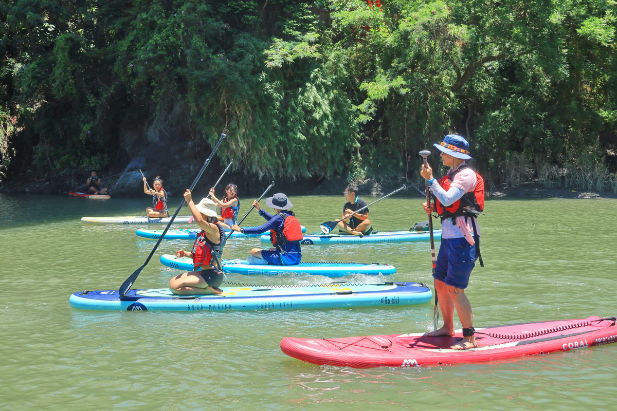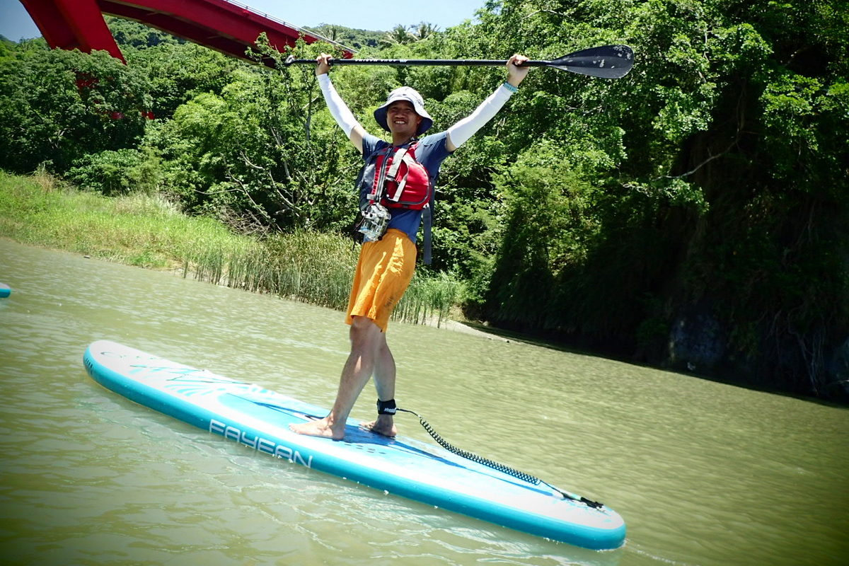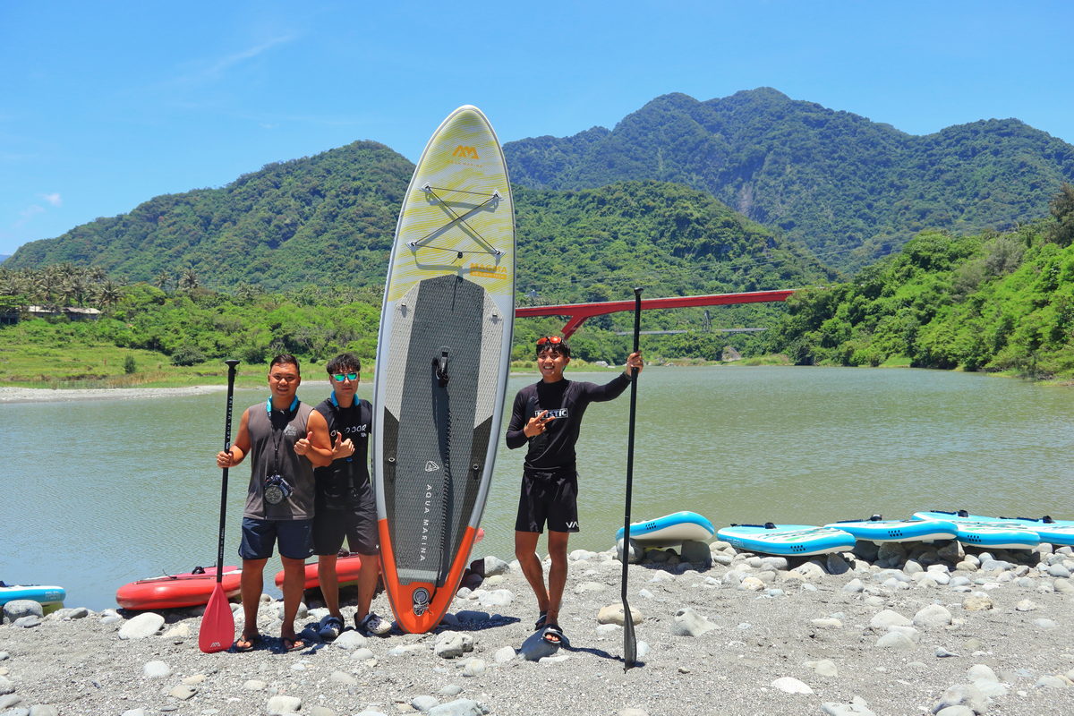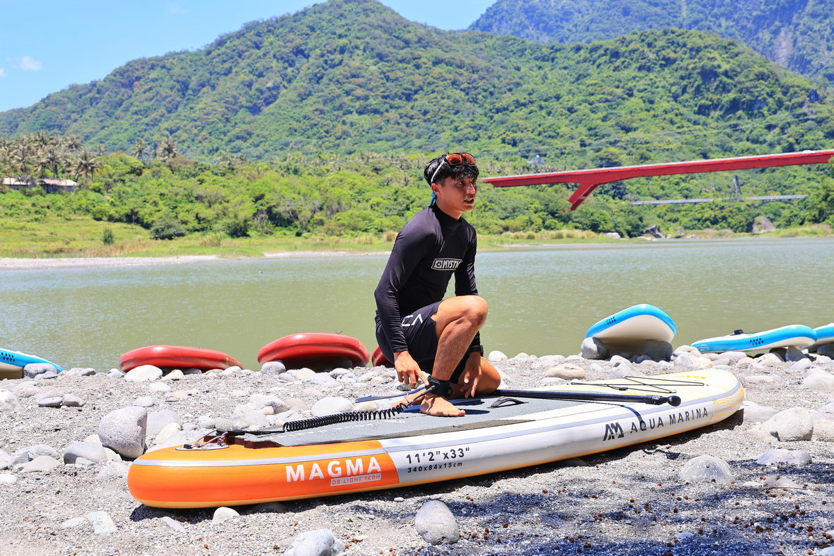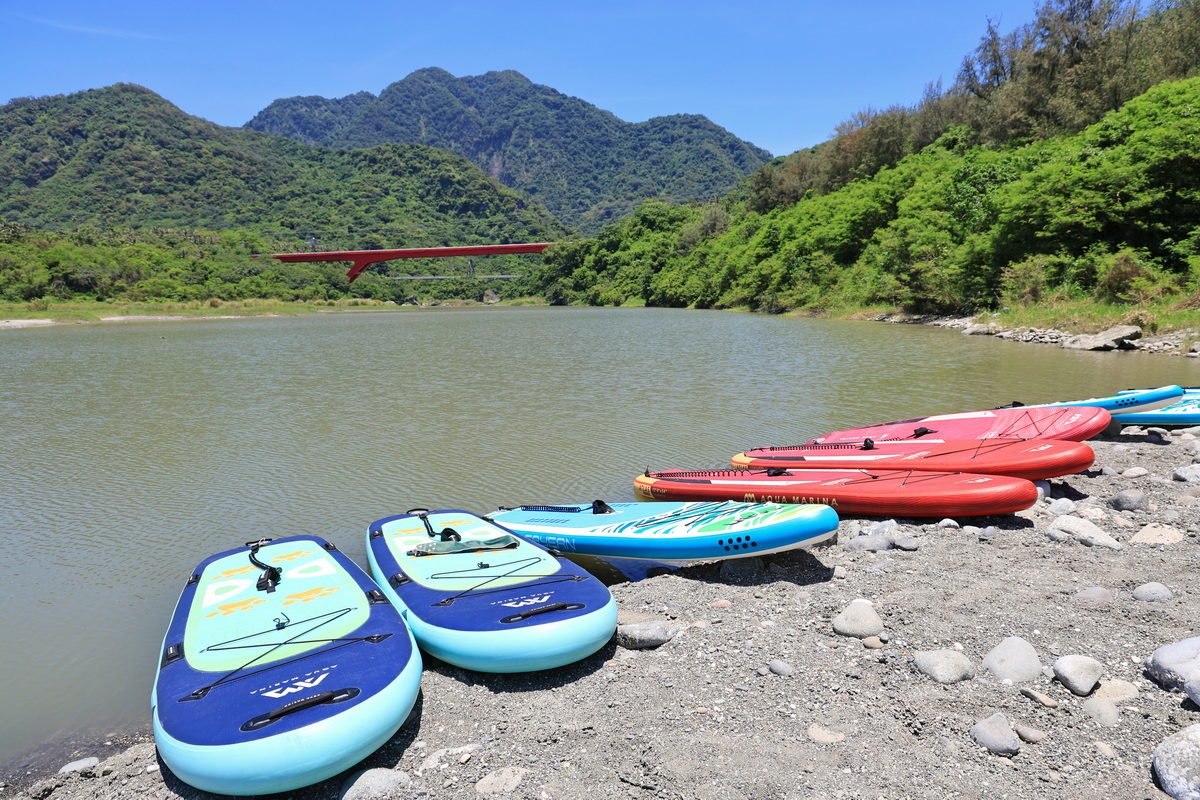 品味了一丸可口營養滿分的飯糰後,我們再隨著馬武窟溪順流而下,抵達位於出海口的東河橋下與善於溯溪、SUP的【TryFun野萃文化】一同會合,因為除了感受馬武窟溪孕育泰源幽谷純淨唯美的自然農作之外,在這炙熱的夏季裡,來場沁涼的SUP親水體驗溪流的碧綠,更是相當適合的活動,於是我們在主理人子豪的帶領下,穿上救生衣,在岸上學習如何操控SUP等教學後,隨即在這相當平靜的出海口岸下水,划向橋墩有著鮮明紅艷色彩的東河新橋,而從剛下水時,面對SUP貼於水面上帶來的晃動感、坐著像是划獨木舟般的愜意,到最後利用核心肌群嘗試著站立,完成真正SUP的立姿划槳動作,並俐落地穿梭徜徉於溪水之間所帶來的成就感,更是充滿挑戰的樂趣,當然這些過程中可能因為重心不穩而跌入水中,卻不顯氣餒,反而在這炎炎夏日中獲得無預警的沁涼消暑暢快呢!