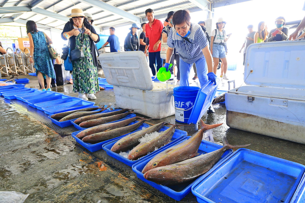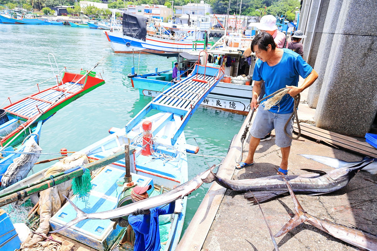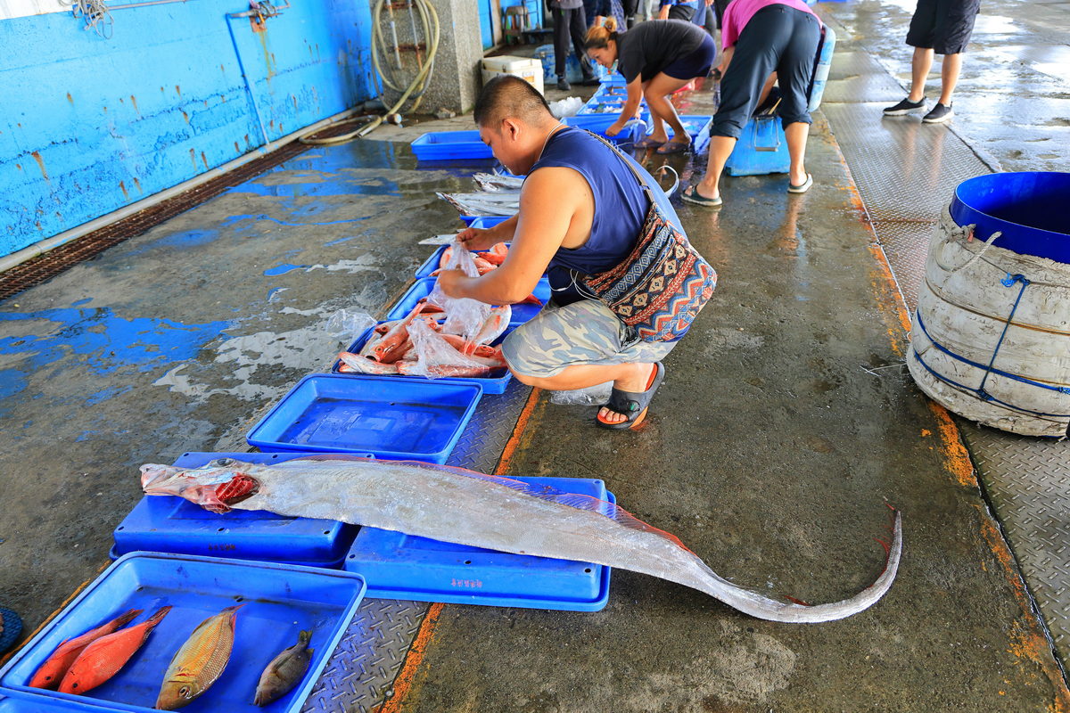 回到岸邊簡單沖洗後,正值飢腸轆轆的中午時刻,不如往北前往東海岸最大的魚貨中心【成功漁港】尋訪尚青的海味吧,抵達昔日稱作新港漁港的成功漁港,首先映入眼簾的即是呼應此處發達漁業的船體造型建築,走進建築,等待我們的是家族4代皆從事在地水產事業的【順大新港黑潮海鮮餐廳】王小姐,因為在此品味來自於太平洋黑潮的新鮮海味之前,我們首先了解漁獲從何而來?於是隨著王小姐一同進入其中,欣賞著透過需要站在高聳的標台上,進行既危險又難度相當高的擲標技術,捕撈隨著浪花奔馳的旗魚之漁船,將一尾尾龐大又艷麗的旗魚吊掛上岸、東海岸常見同時也是外銷北美製作成魚排,卻台灣人鮮少品嚐的鬼頭刀,以及各式隨著太平洋黑潮來訪的各式當季魚種,皆匯集於此,而最熱鬧非凡的莫過於漁會糶(音同:跳)手俐落的手勢與喊價的拍賣現場,只要一個眼神、一個微小的手勢,都是商家之間瞬息萬變的競標過程,而在競標完成後,商家隨即將得標的漁獲移至一旁的解魚分切區,這從上岸、銷售到分切的一條龍過程,不僅源自日治時代即有的銷售程序,熱鬧的氛圍不僅內行看的是門道,對我們這外行的遊客,看了更是過癮。