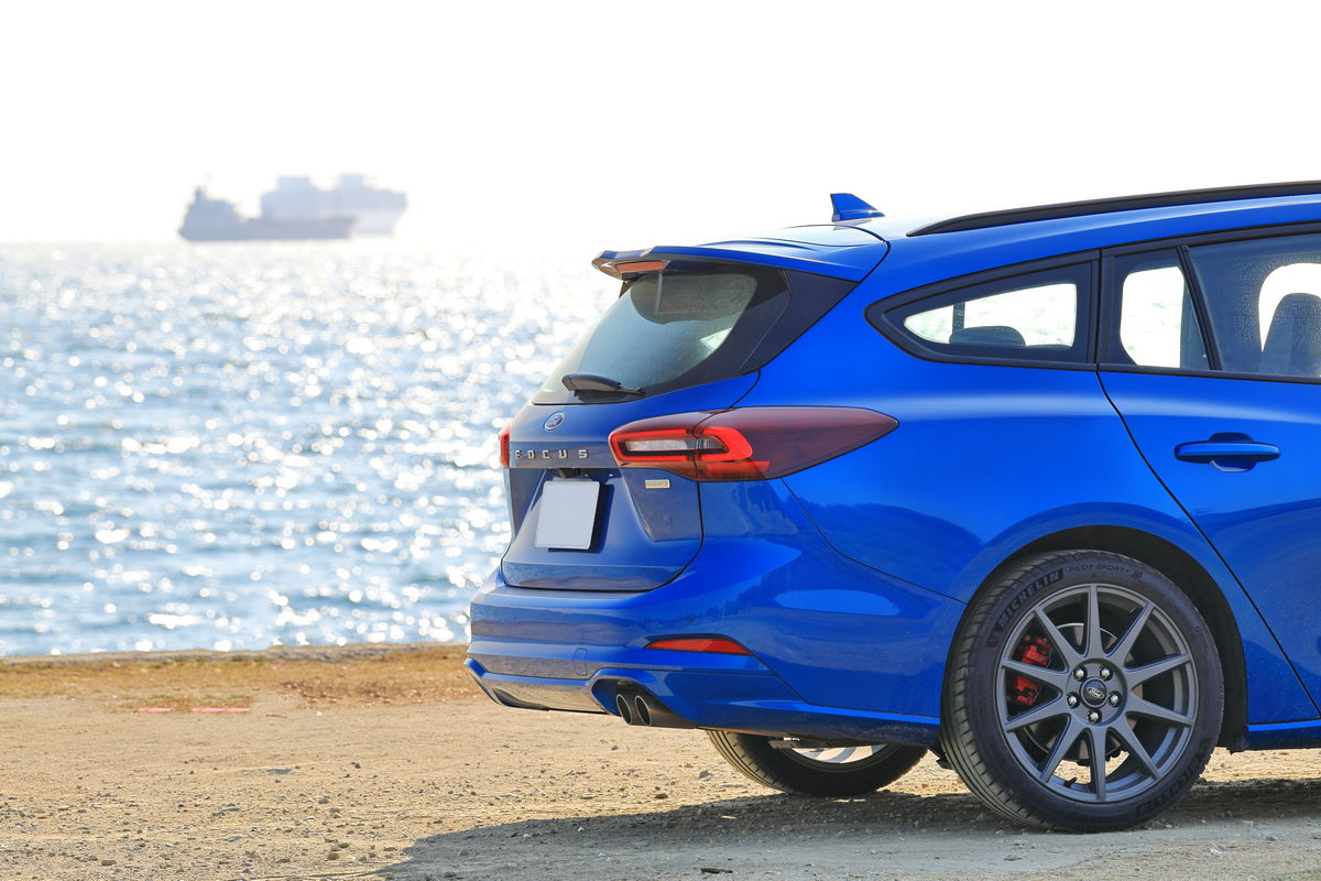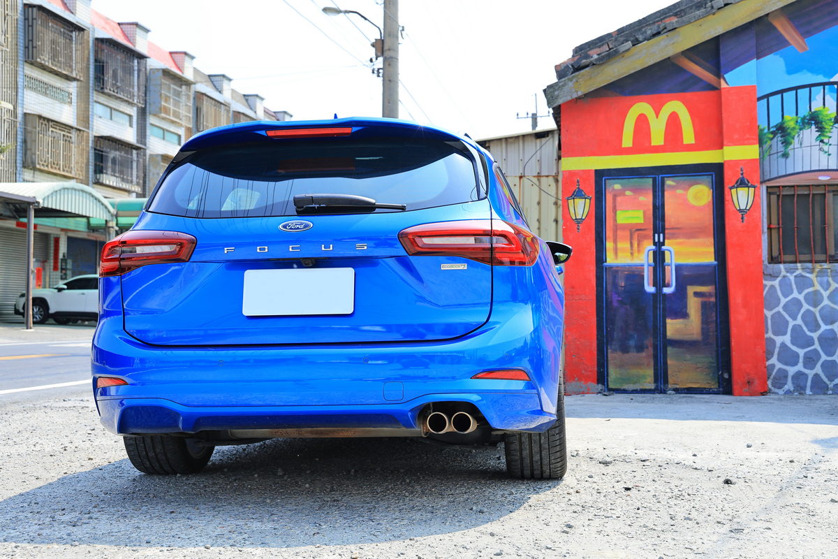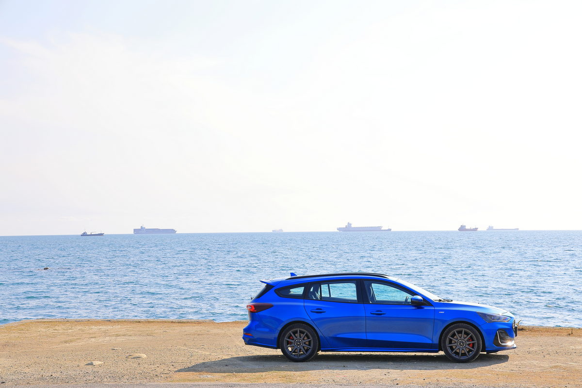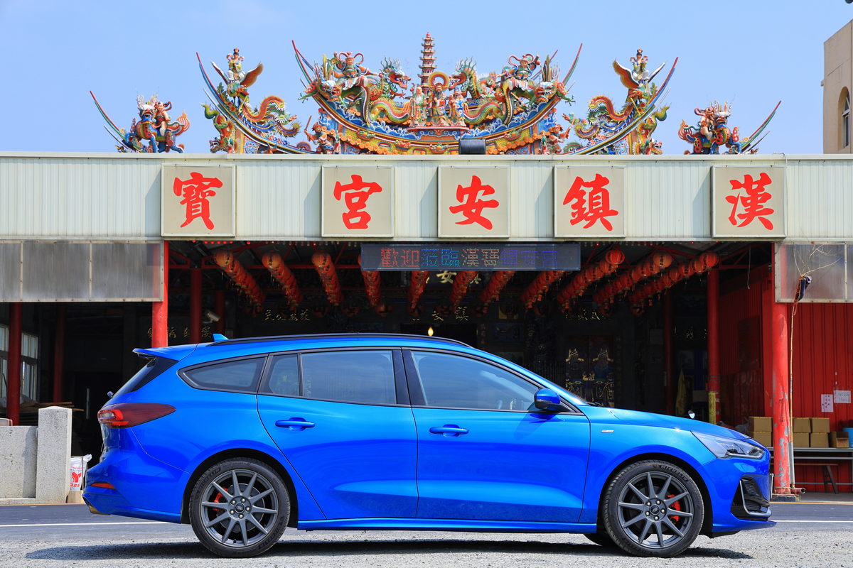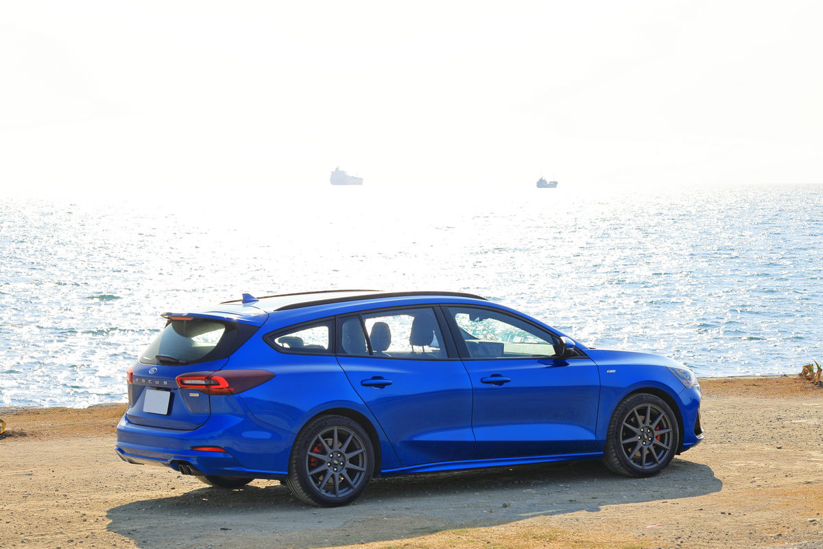 也因為抵達旗津海岸,欣賞耀眼陽光照耀於貨輪、海岸的唯美景致,透過這樣艷麗光線映襯於Focus Wagon ST-Line Vignale的車身之上,從Vignale專屬下氣壩鉻鍛面造型嶄露的優雅質感,隨著銳利的Ford Matrix LED矩陣式智能動態照明系統引領著車頭、輪拱飽滿線條,一路隨著極富肌肉線條的腰線貫穿至車尾,透過荒島藍的車色對應著遠方藍海上的貨輪,更讓這部修長俐落的旅行車像是置身歐洲海岸旅行的優雅樣貌呢!