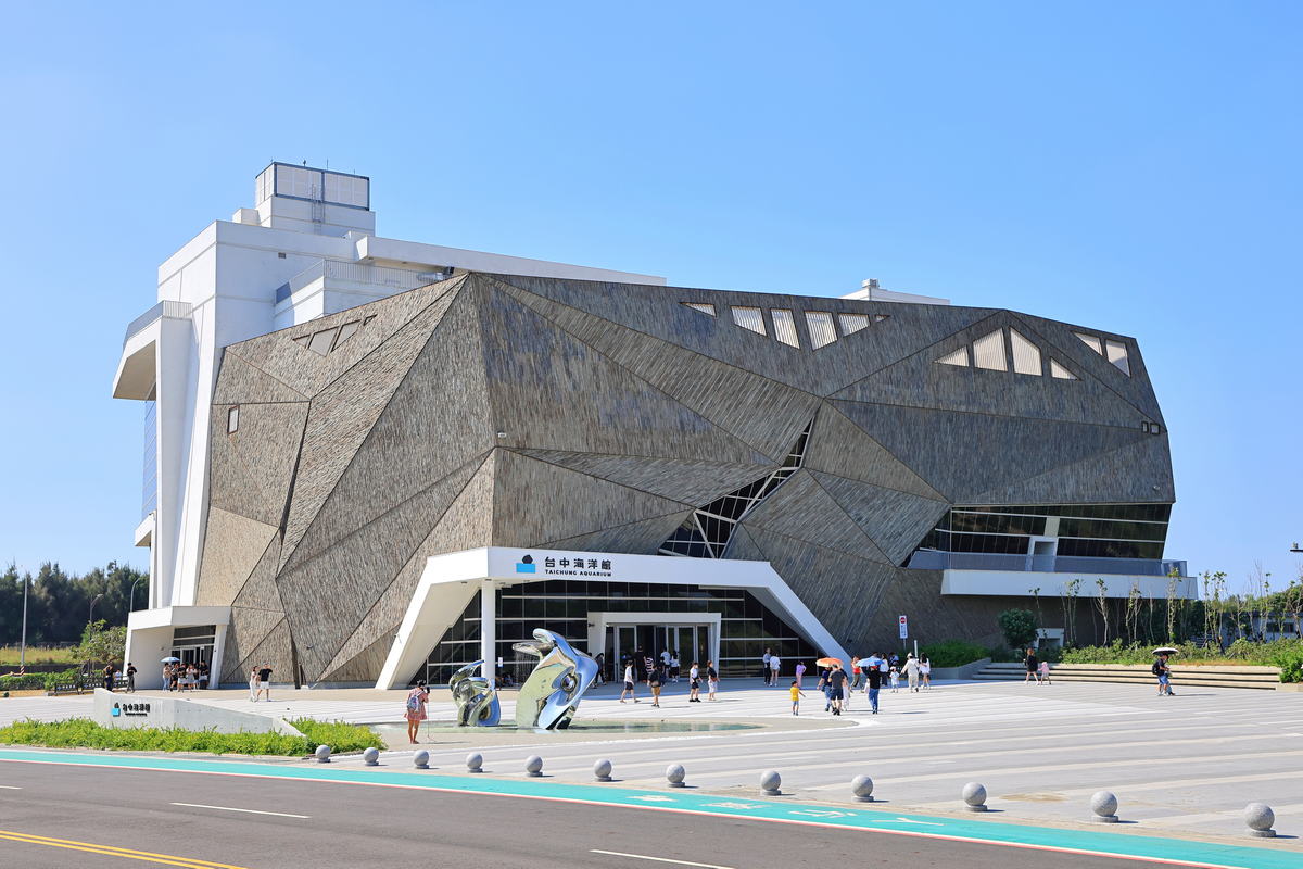 開著車抵達緊鄰於台中梧棲觀光漁港的台中海洋館,首先這座場館映入眼簾的即是充滿稜稜角角,且外牆別於我們習以為常平滑清水模,取而代之猶如一顆隨著大甲溪一路沖刷於此,有著侵蝕、風化紋路的巨型岩石造型,從停車場隨著步行一路前往海洋館,視線從陽光照耀下帶來立體光影的時尚設計感,到靠近場館下抬頭仰往這顆巨石的雄偉氣勢,再進入至1樓大廳處,以消光黑呼應著岩石的基調色彩,已讓我感受其濃厚的設計氣息。
