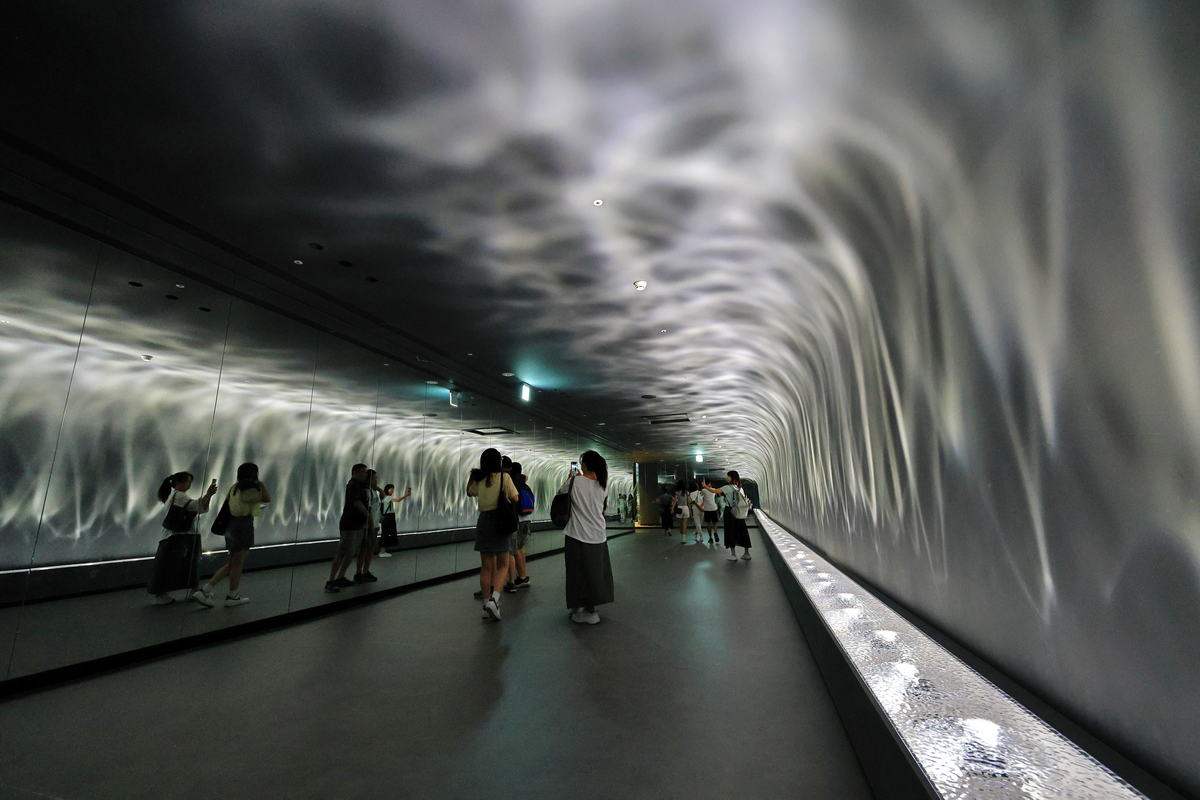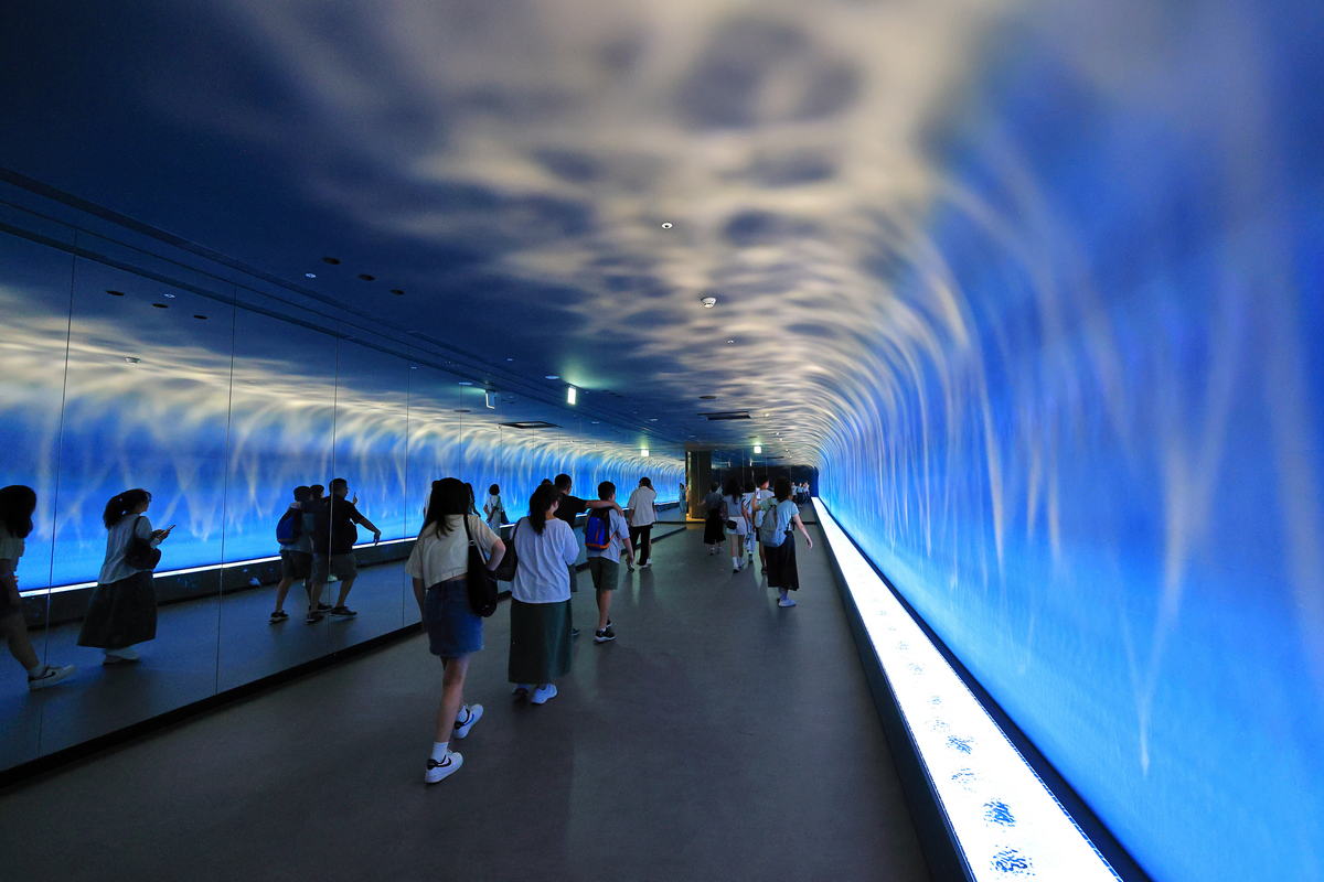 緊接著走進岩石造型的隧道,從手機出示預先買好的門票QR Code,隨著眼前不斷以燈光幻化猶如水面波光的夢幻迴廊,一路抵達位於3樓以瀑布浸潤植被,且在這炎熱夏季中,藉著瀑布灑落帶來的沁涼聲響為意象的裝置藝術,開啟台中海洋館以3樓【台中河川】為整座場館為參觀首站的獨特設計,與場館外牆以堅毅的岩石、館內的瀑布流水以及從1樓上升至3樓的設計,展現台灣水資源流域,從山頂的岩層、雨水的浸潤沖刷,最後匯集而成一段充滿生命的流域意念,這樣訴說著生命起源的外剛內柔設計意象,真是前所未見的令人驚艷呢!