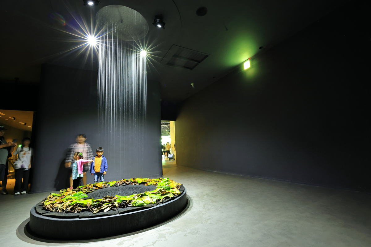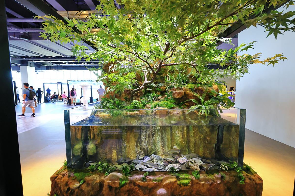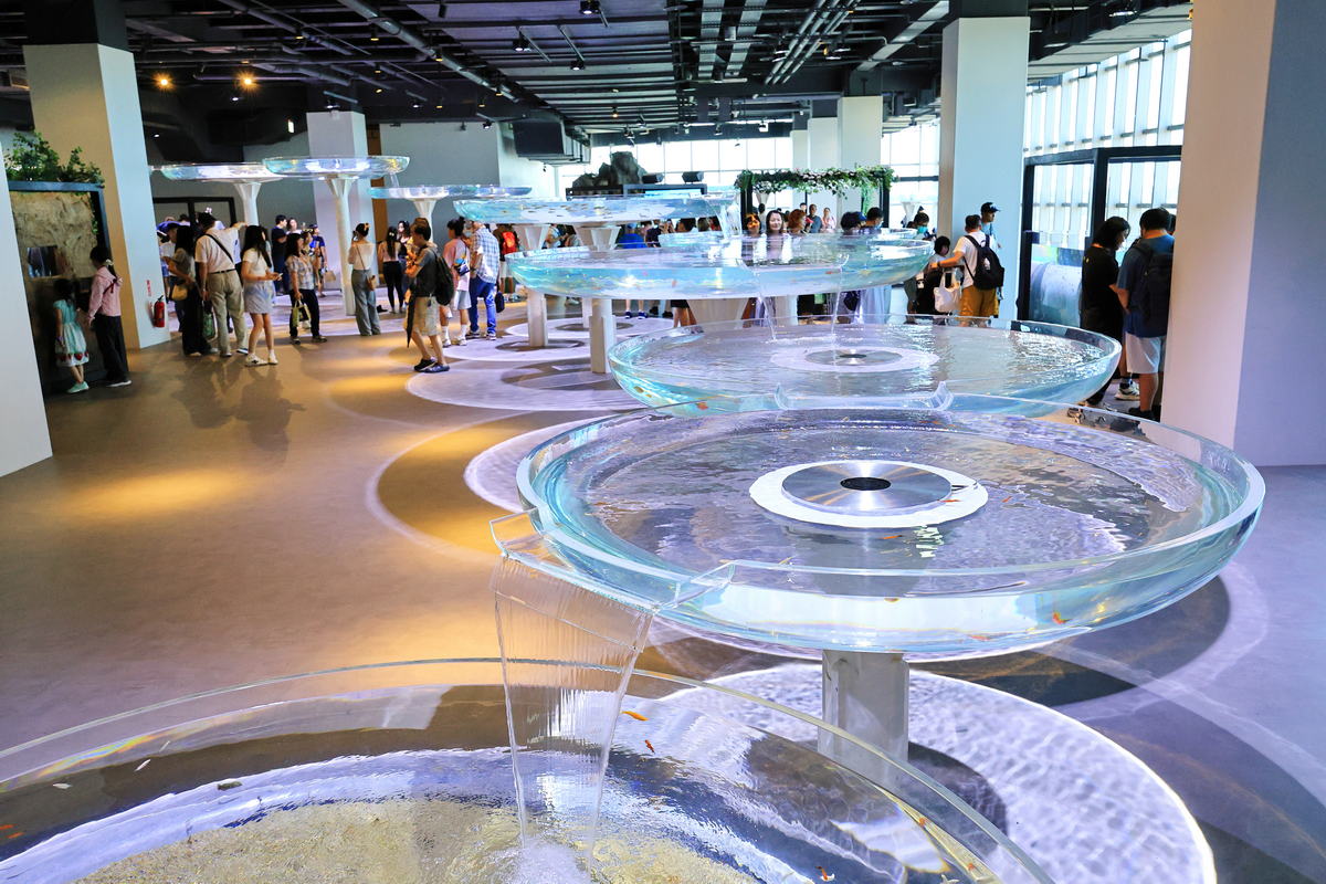 通過充滿禪意的流水瀑布,眼前佇立12座有著高低起伏的“透明”圓形展示缸,就像是我們常見於池塘中緊貼於水面的睡蓮造型一樣,而這樣猶如懸浮於半空中的【蓮之水槽】,則是以台中大甲溪流域為主題,從海拔3639公尺的南湖東峰為起點,隨著由高至低的展示缸一路抵達下游的出海口,將這長達124公里、流域面及達1235平方公里的大甲溪流域,濃縮至這12座蓮之水槽一覽無遺。