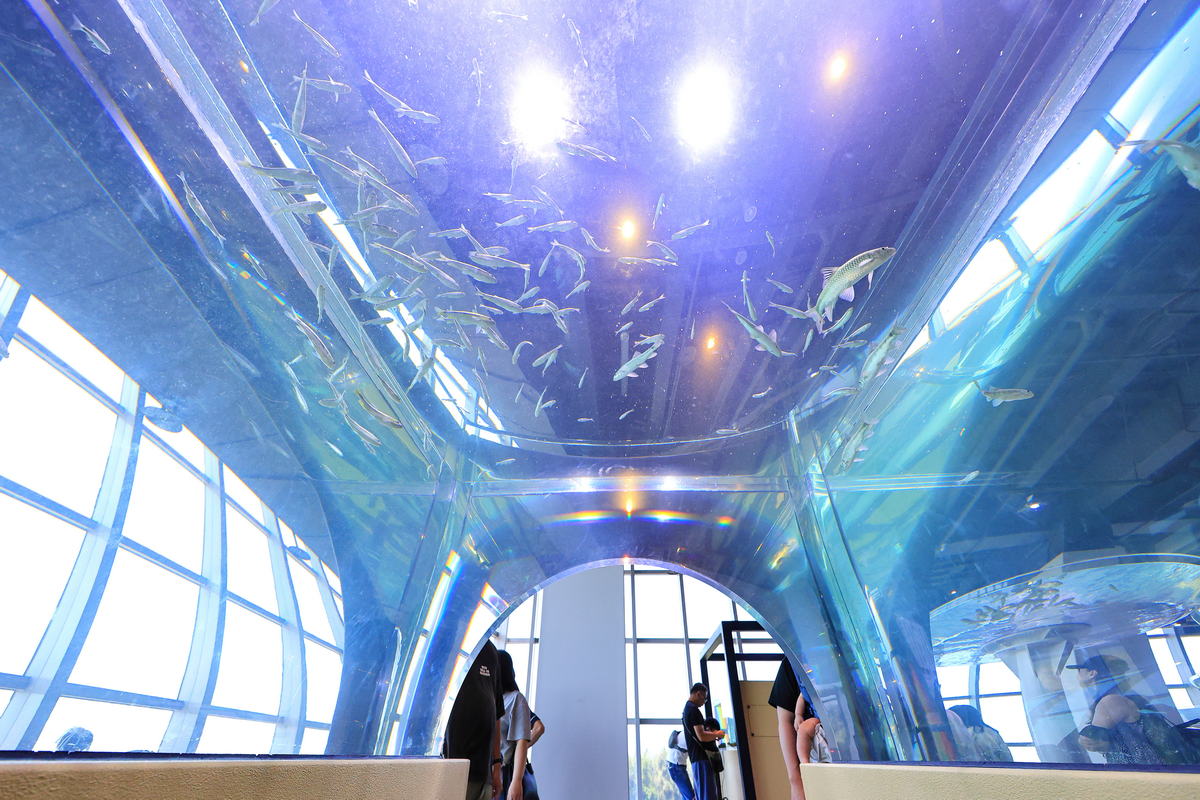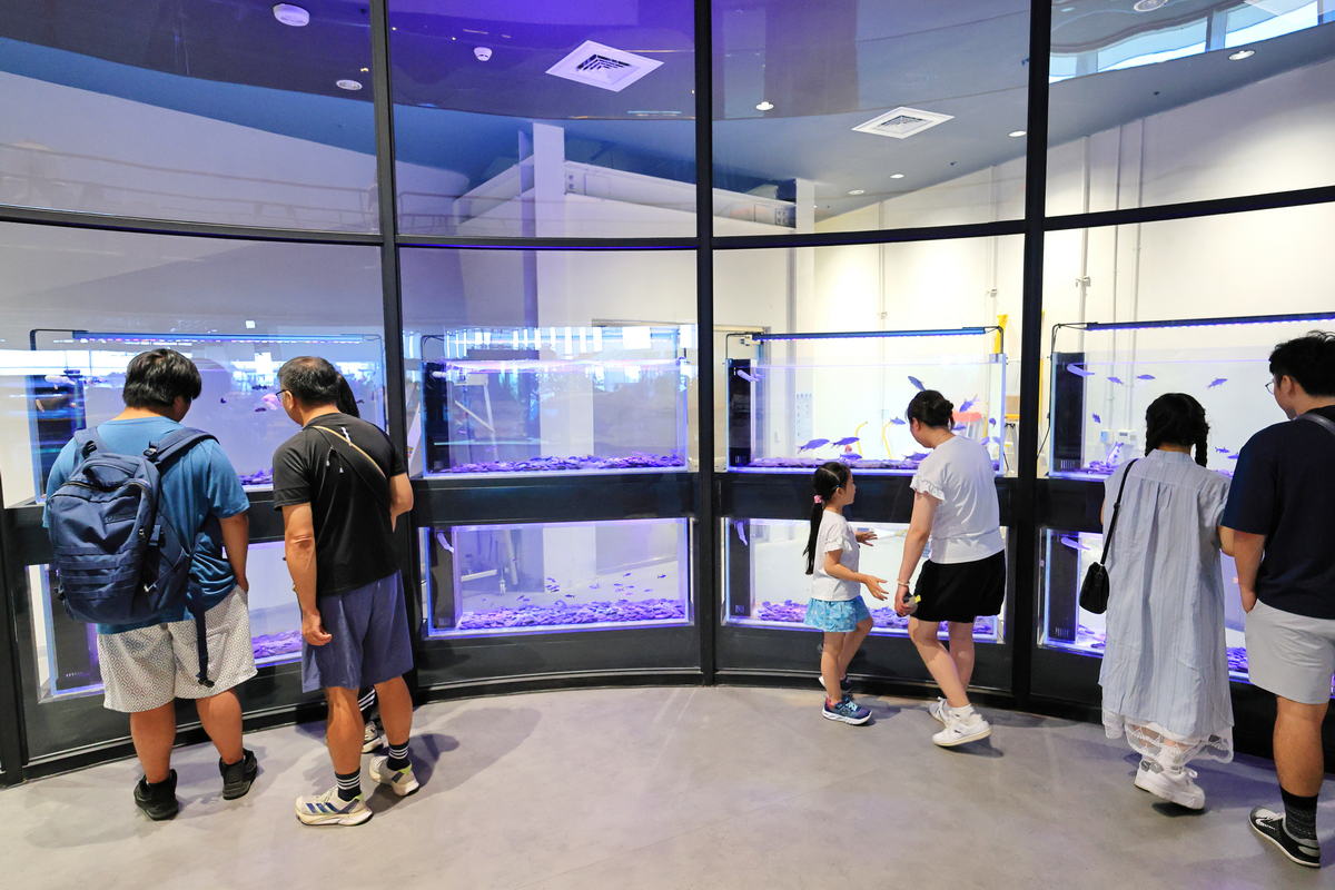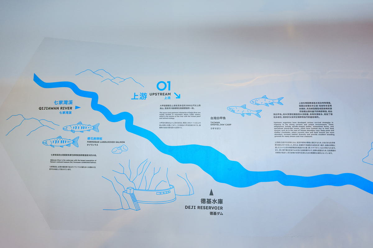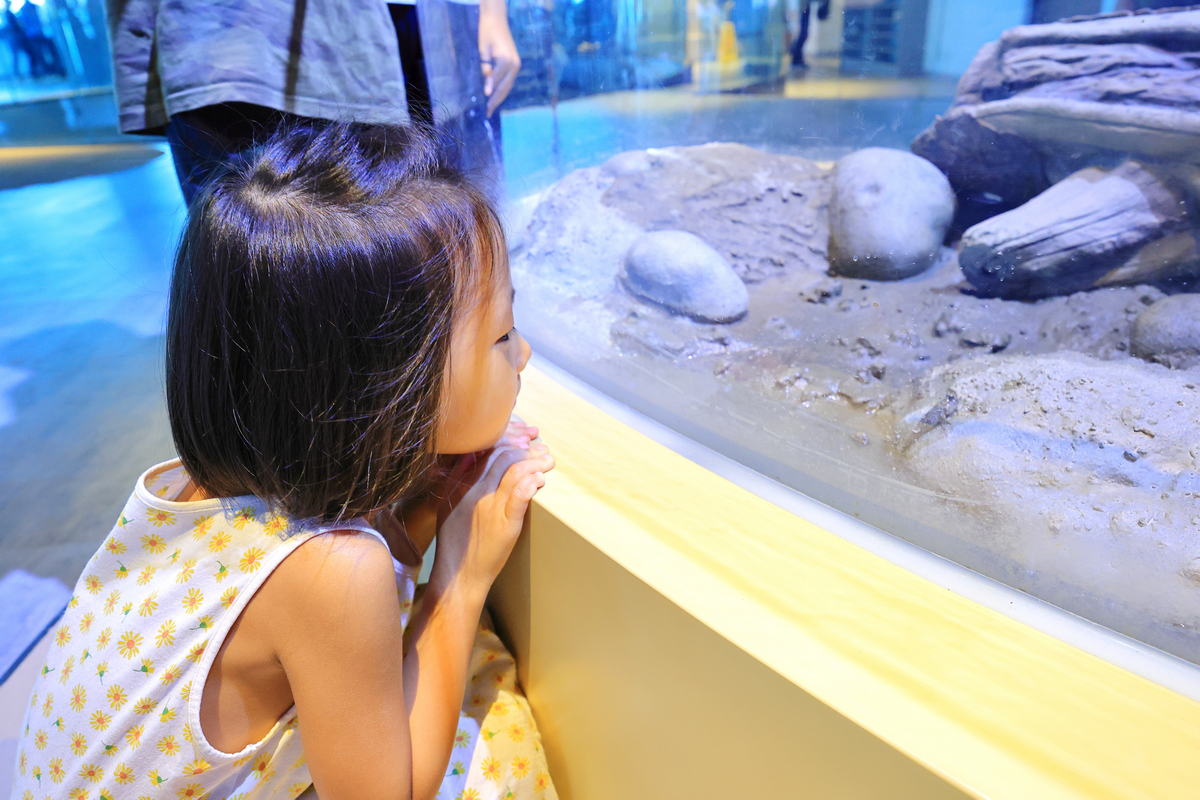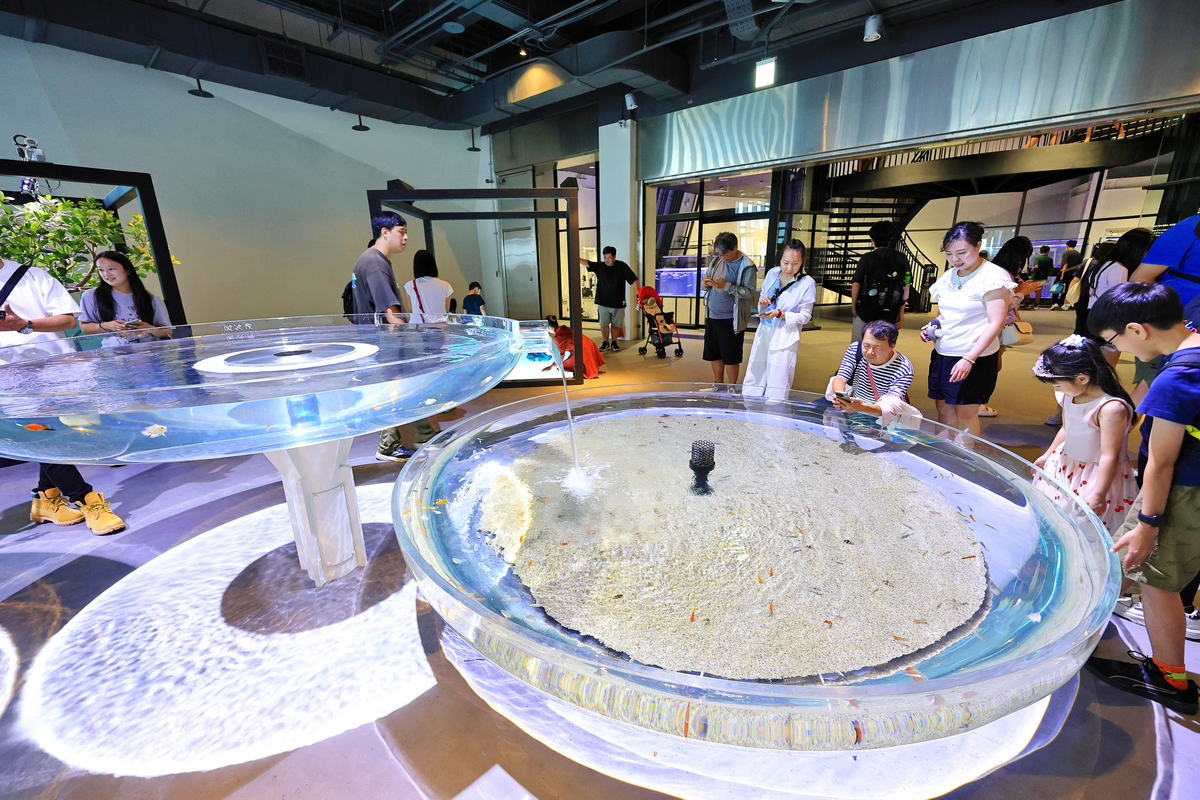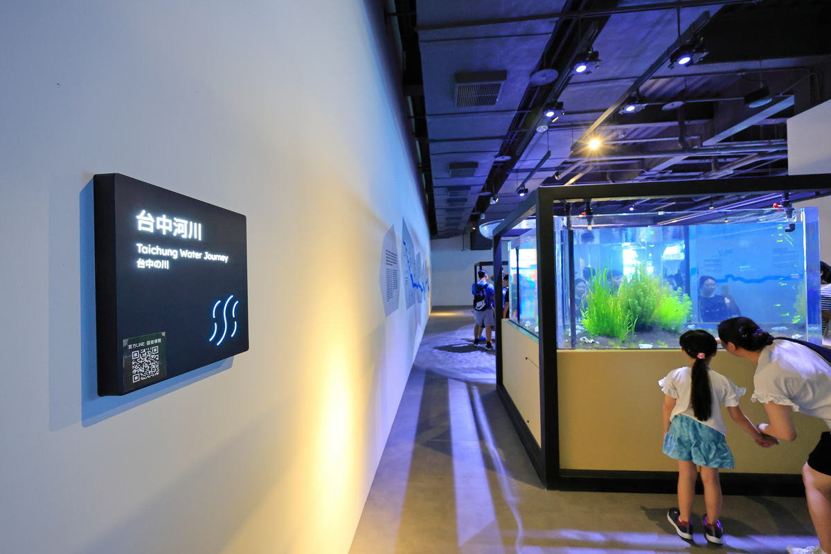 同時這些獨立展示缸不僅呼應著上中下游山勢起伏而有著高低設計之外,伴隨著全透明的且頂部開放的設計下,讓我們不再像過往只能透過玻璃缸體的阻隔下,平面的觀察每個流域的生態,反而是能在水面欣賞在水中優游的貪食沼蝦(過山蝦),又或是像“潛”進水底,隨著光線灑落的波光粼粼,欣賞著鯽魚、台灣白甲魚等流域中常見魚類,甚至能隨著魚群一同環繞著圓形展示缸一起來個乾爽的共游,這樣的參觀體驗不僅能感受設計師訴說著上中下游流域順序的意念,同時搭配著互動式螢幕,更增添場館的時尚設計氛圍,而且相當新奇的觀賞體驗呢。