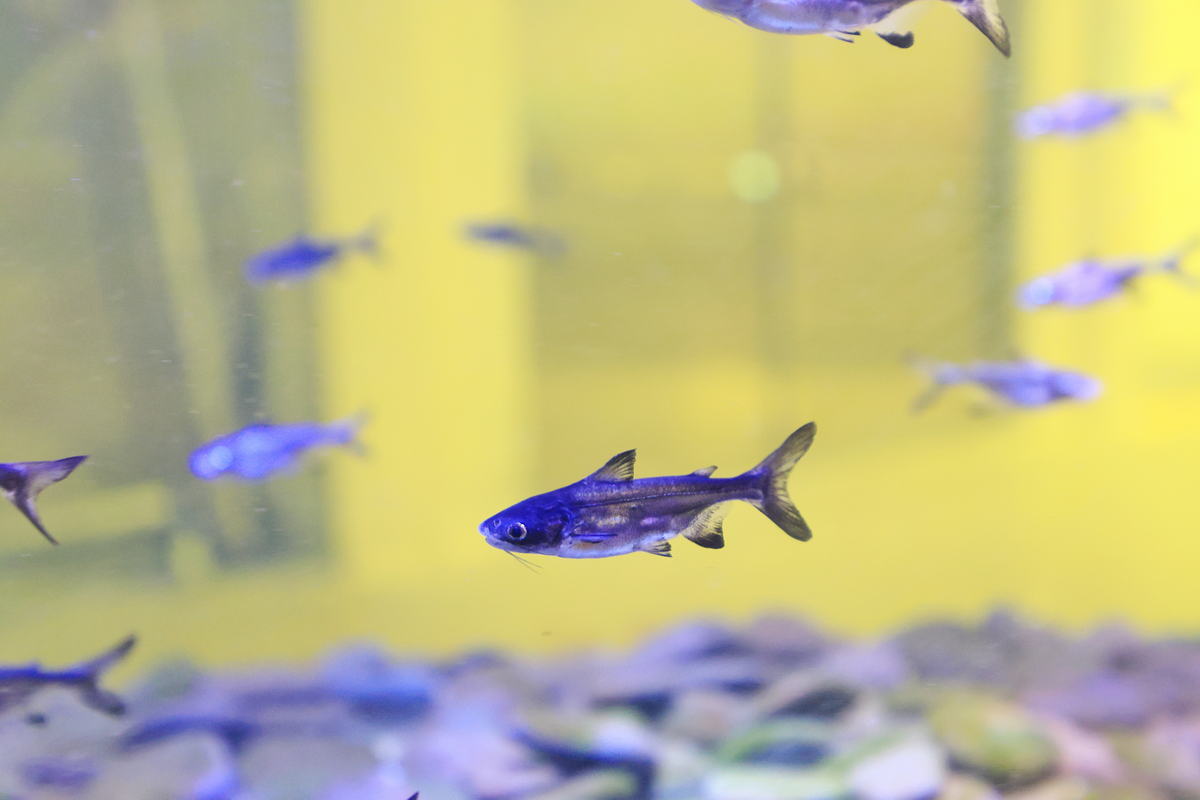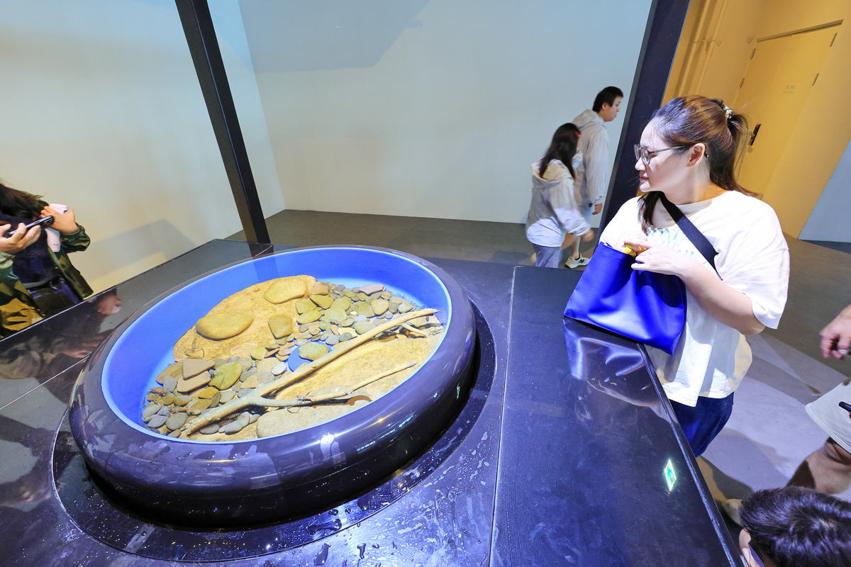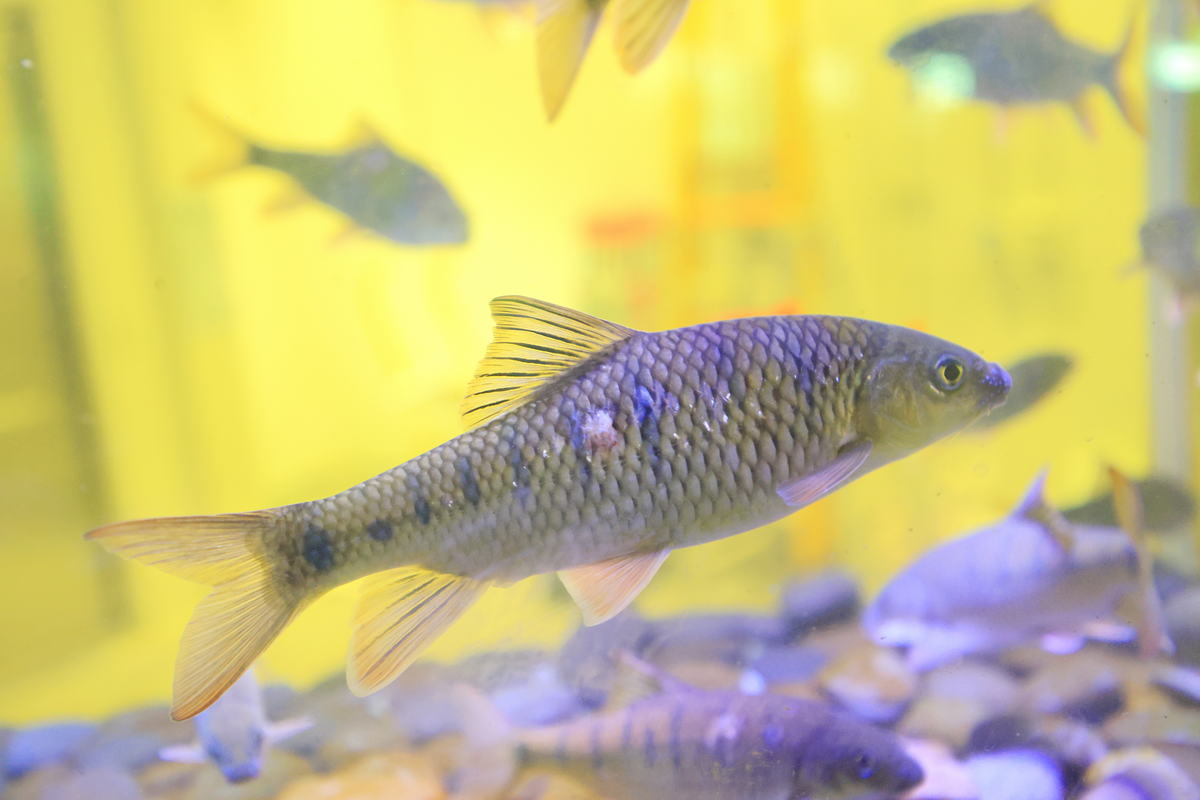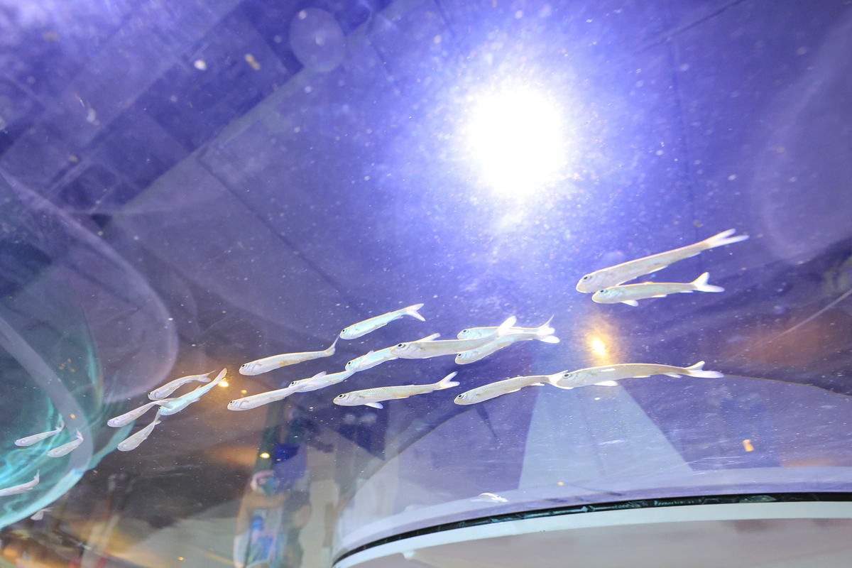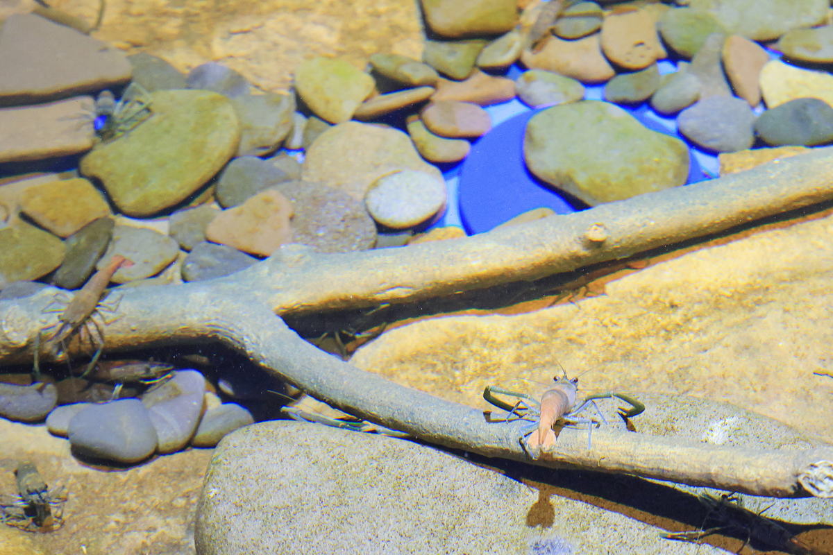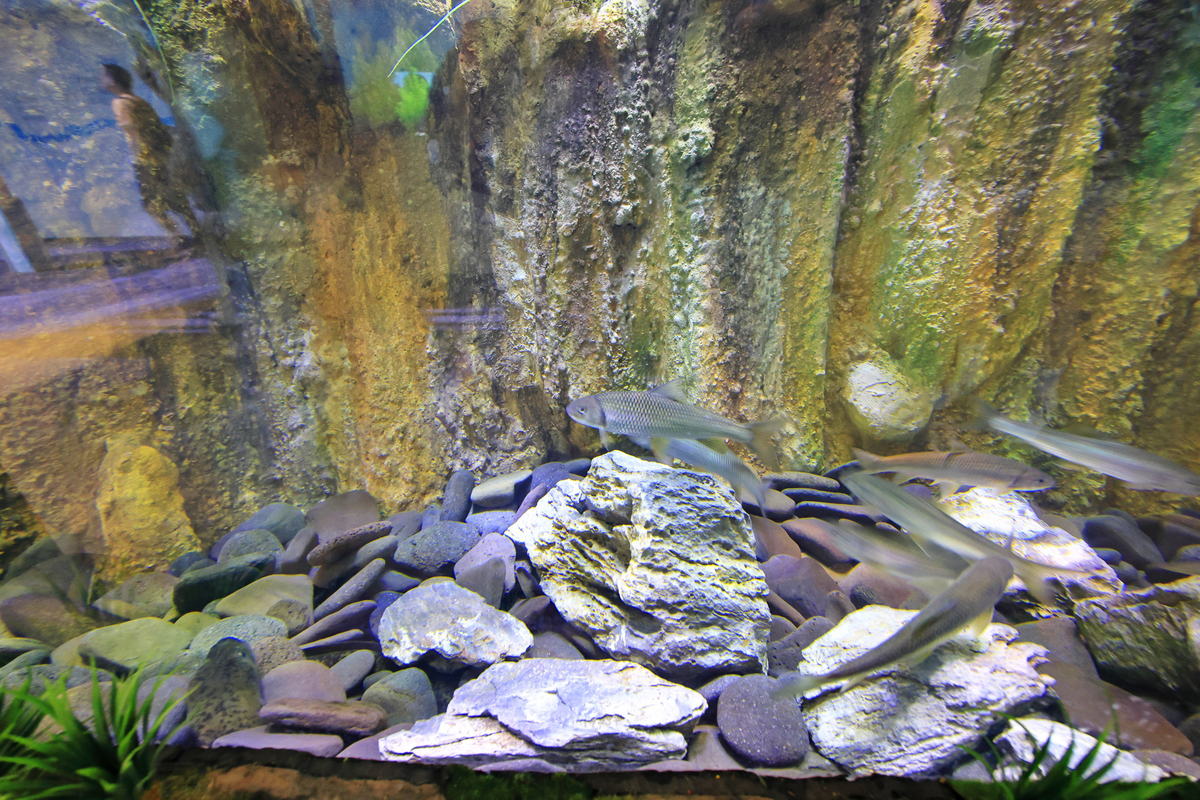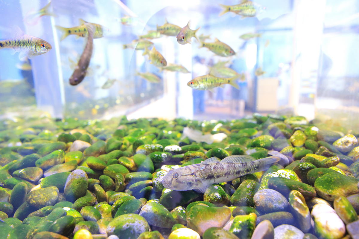 同時這些獨立展示缸不僅呼應著上中下游山勢起伏而有著高低設計之外,伴隨著全透明的且頂部開放的設計下,讓我們不再像過往只能透過玻璃缸體的阻隔下,平面的觀察每個流域的生態,反而是能在水面欣賞在水中優游的貪食沼蝦(過山蝦),又或是像“潛”進水底,隨著光線灑落的波光粼粼,欣賞著鯽魚、台灣白甲魚等流域中常見魚類,甚至能隨著魚群一同環繞著圓形展示缸一起來個乾爽的共游,這樣的參觀體驗不僅能感受設計師訴說著上中下游流域順序的意念,同時搭配著互動式螢幕,更增添場館的時尚設計氛圍,而且相當新奇的觀賞體驗呢。