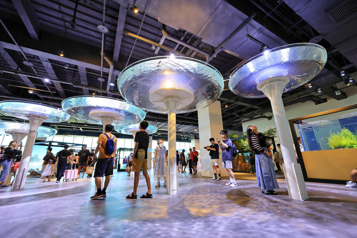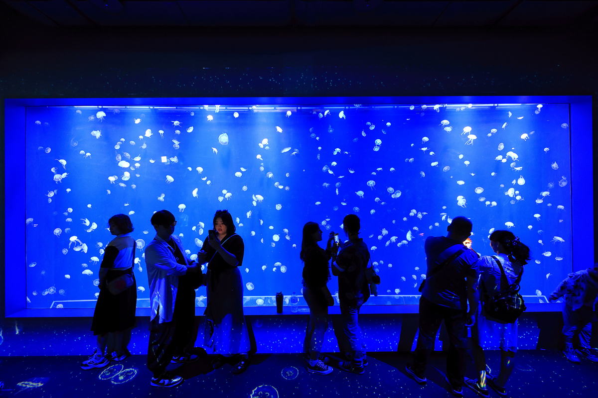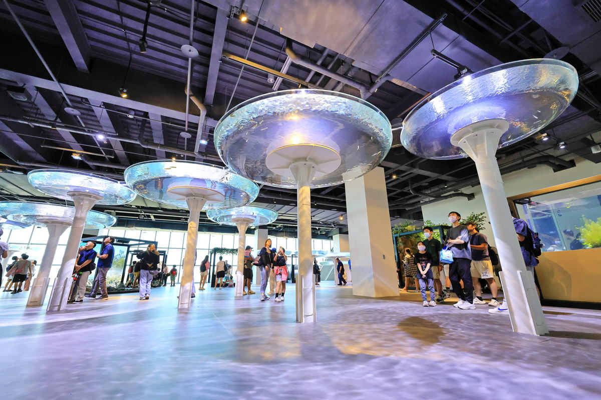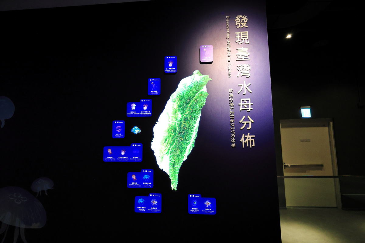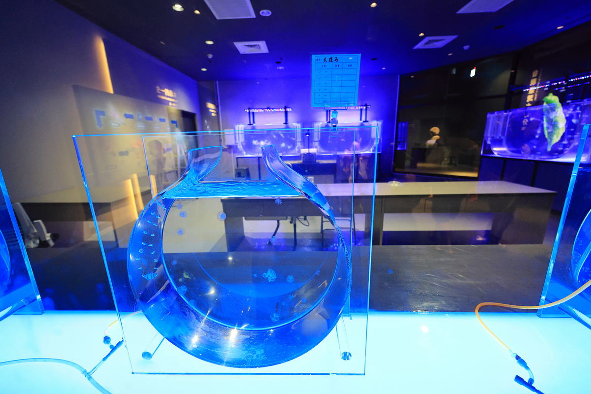 隨著展覽動線從河川上游一路順流而下進入海洋門戶的潮間帶後,接著我們正式進入海洋之中,一覽湛藍海洋之美,而引領著我們進入這片大海的序章,則是在海洋之中以輕柔飄動之姿,同時隨著光線照耀於半透明身軀之中散發著猶如螢光燈般迷幻色彩的【水母區】。