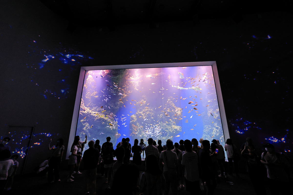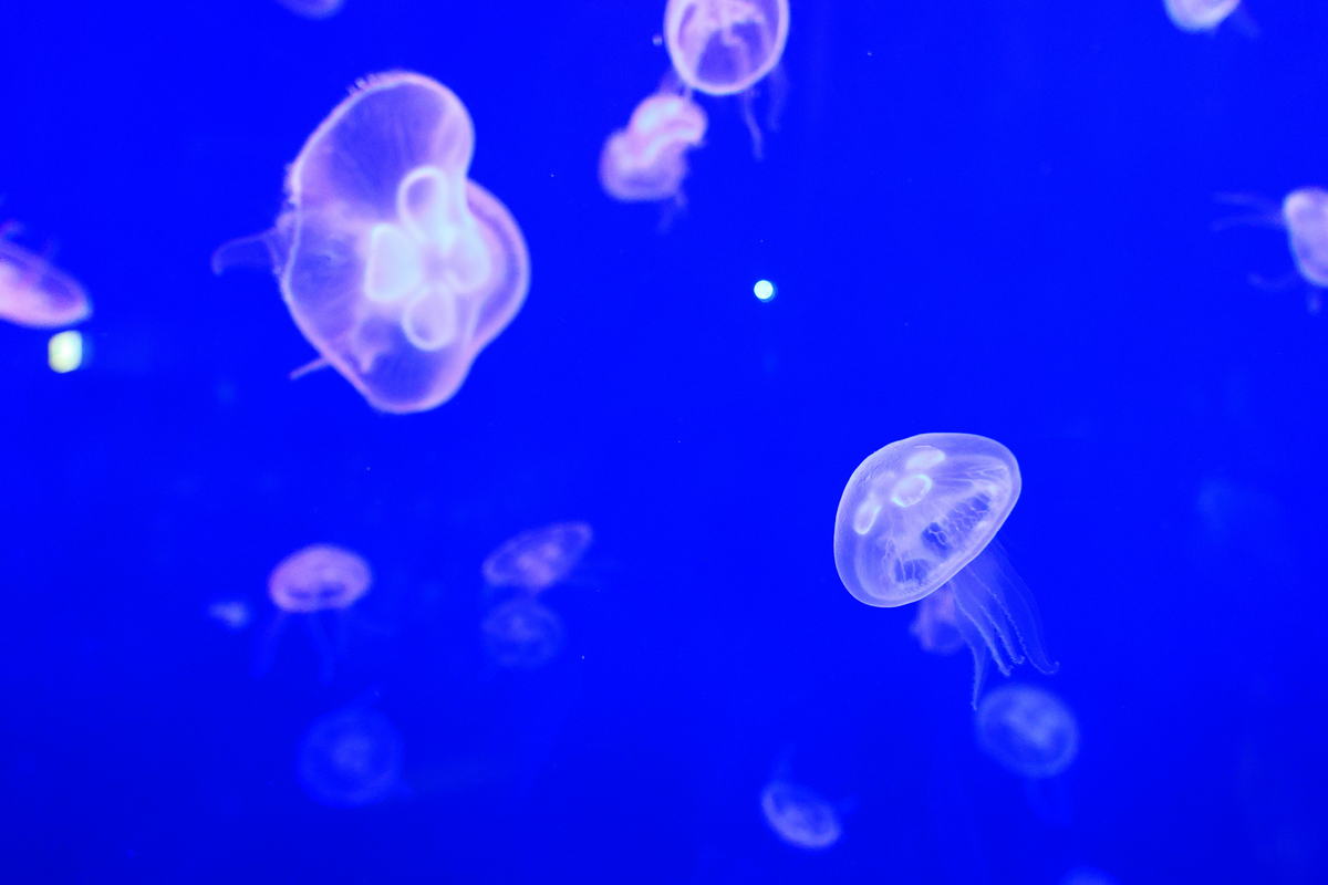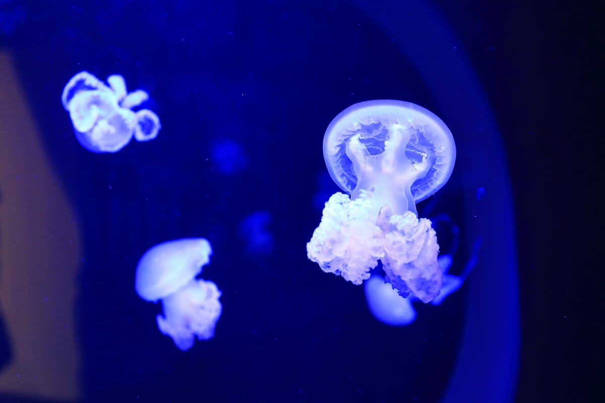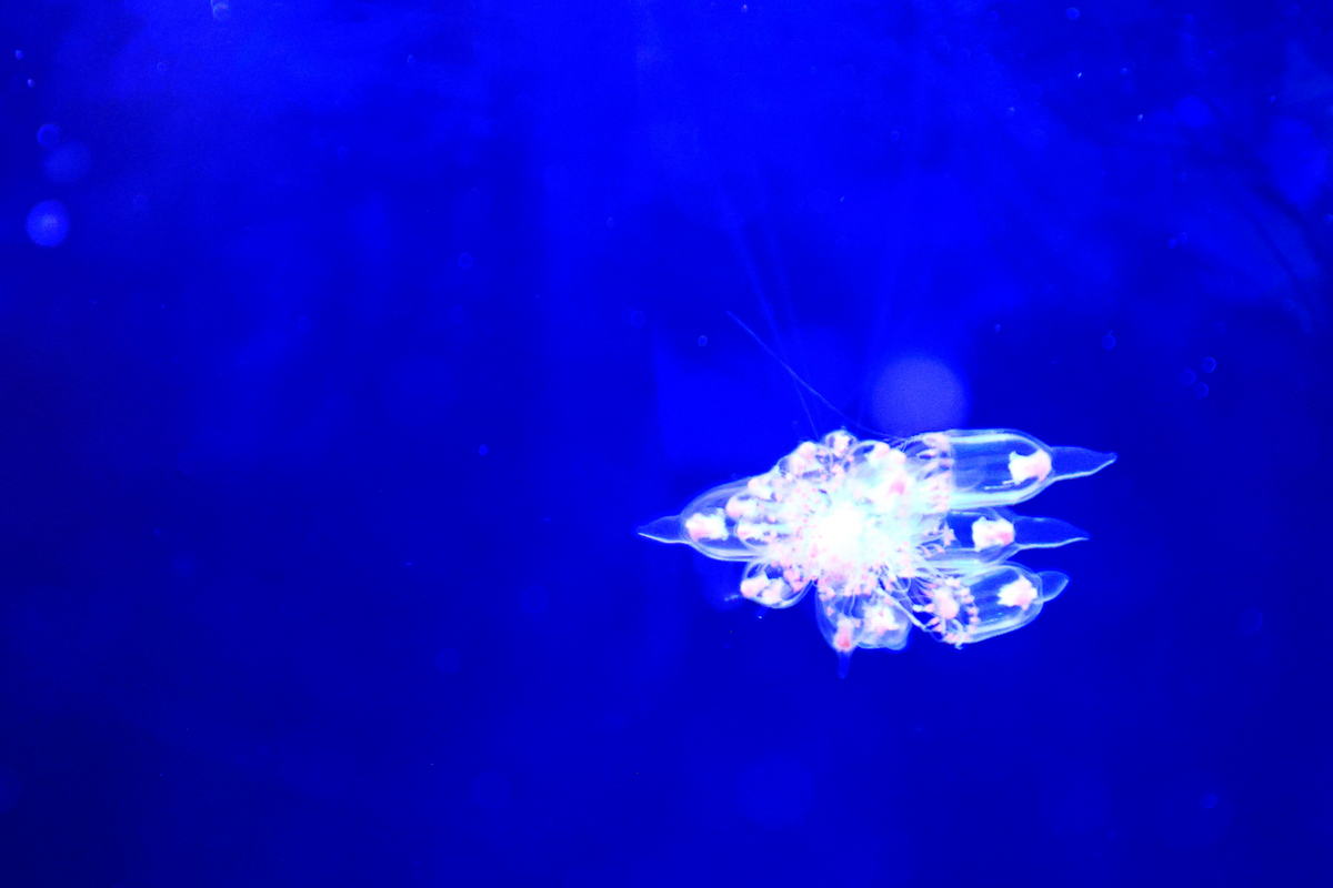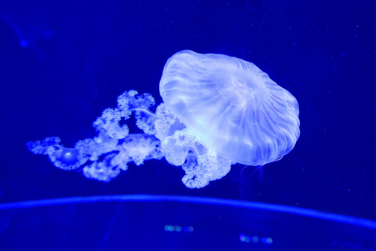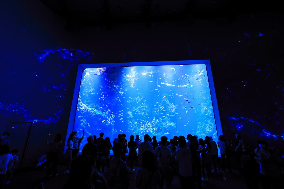 隨著展覽動線從河川上游一路順流而下進入海洋門戶的潮間帶後,接著我們正式進入海洋之中,一覽湛藍海洋之美,而引領著我們進入這片大海的序章,則是在海洋之中以輕柔飄動之姿,同時隨著光線照耀於半透明身軀之中散發著猶如螢光燈般迷幻色彩的【水母區】。