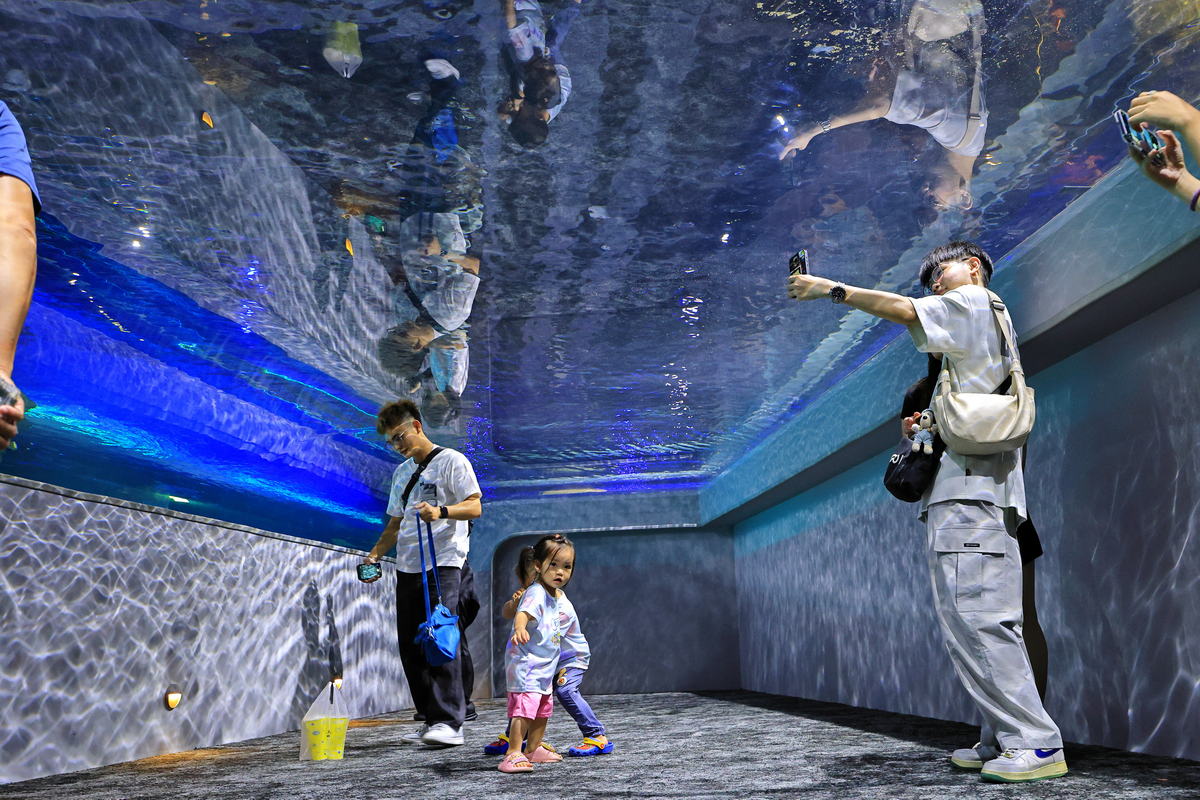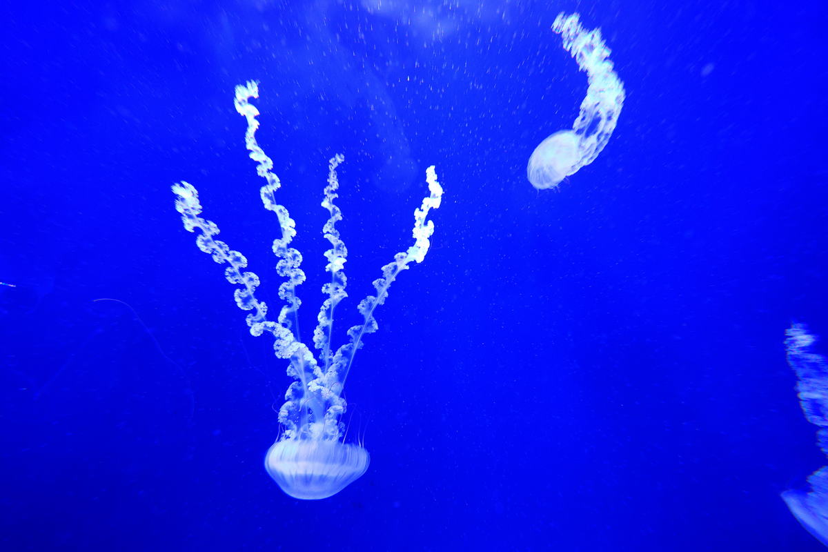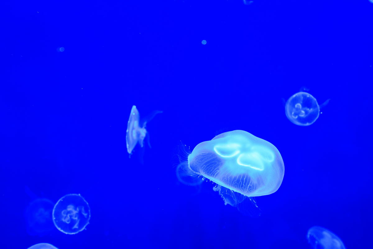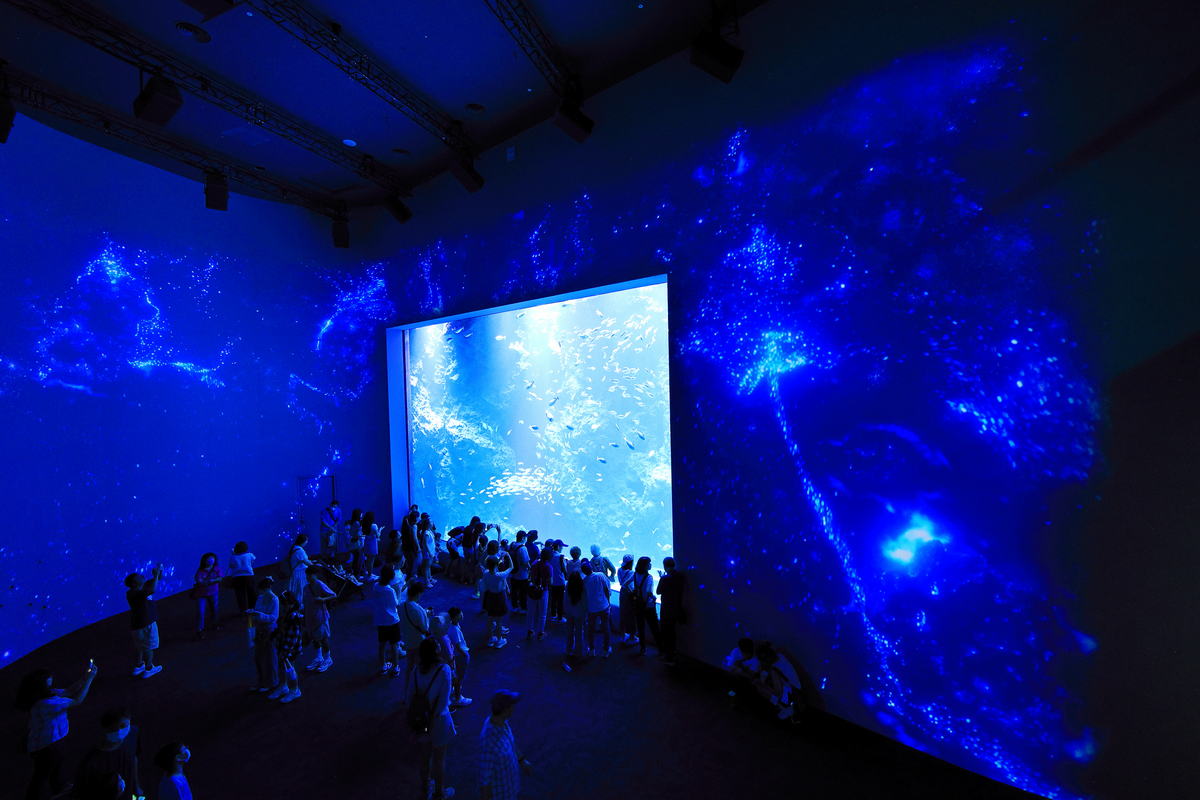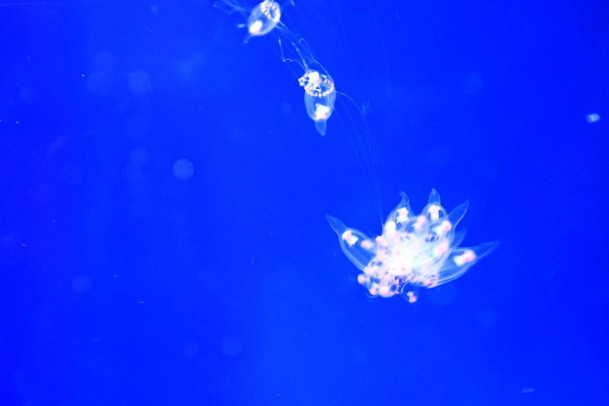 隨著展覽動線從河川上游一路順流而下進入海洋門戶的潮間帶後,接著我們正式進入海洋之中,一覽湛藍海洋之美,而引領著我們進入這片大海的序章,則是在海洋之中以輕柔飄動之姿,同時隨著光線照耀於半透明身軀之中散發著猶如螢光燈般迷幻色彩的【水母區】。