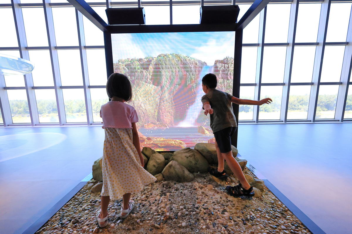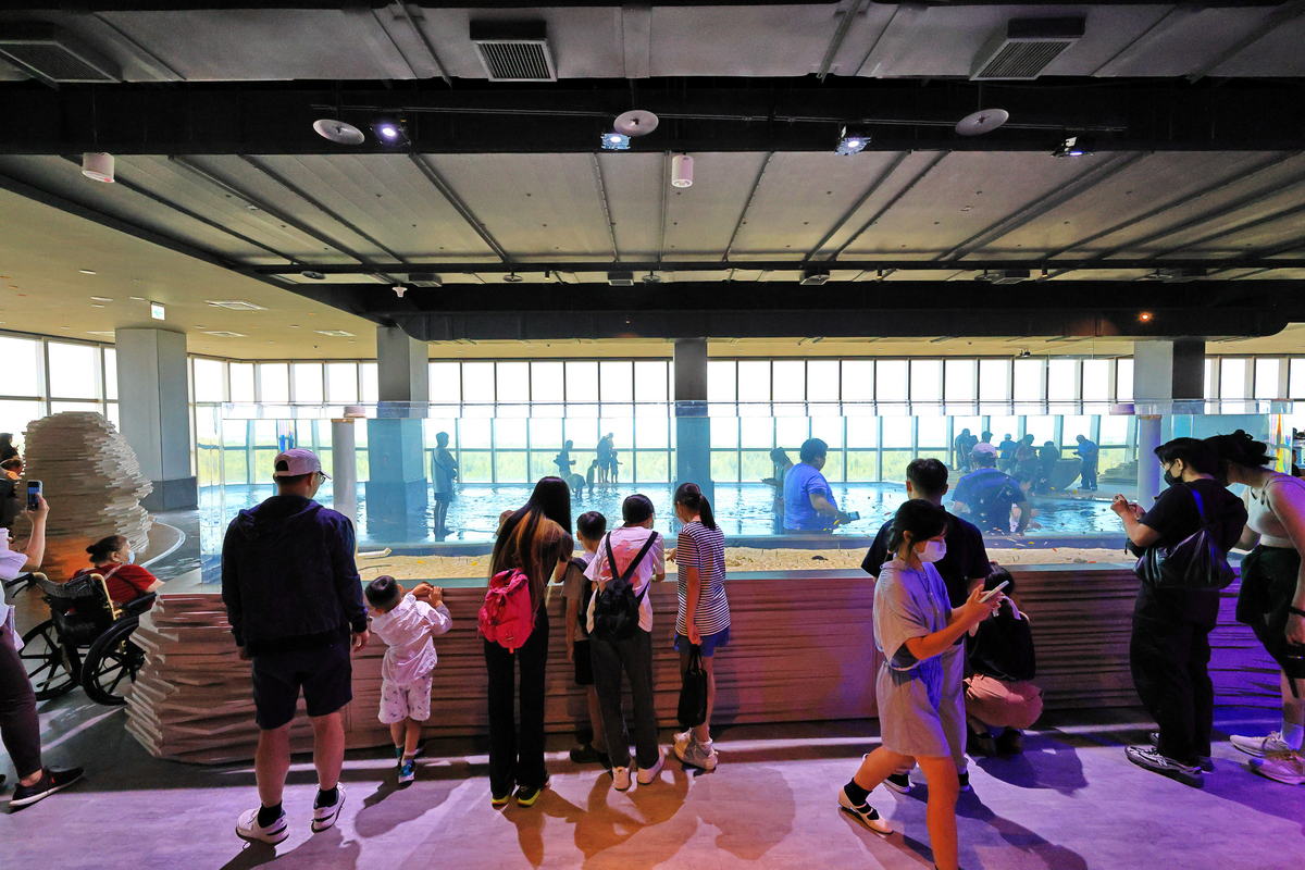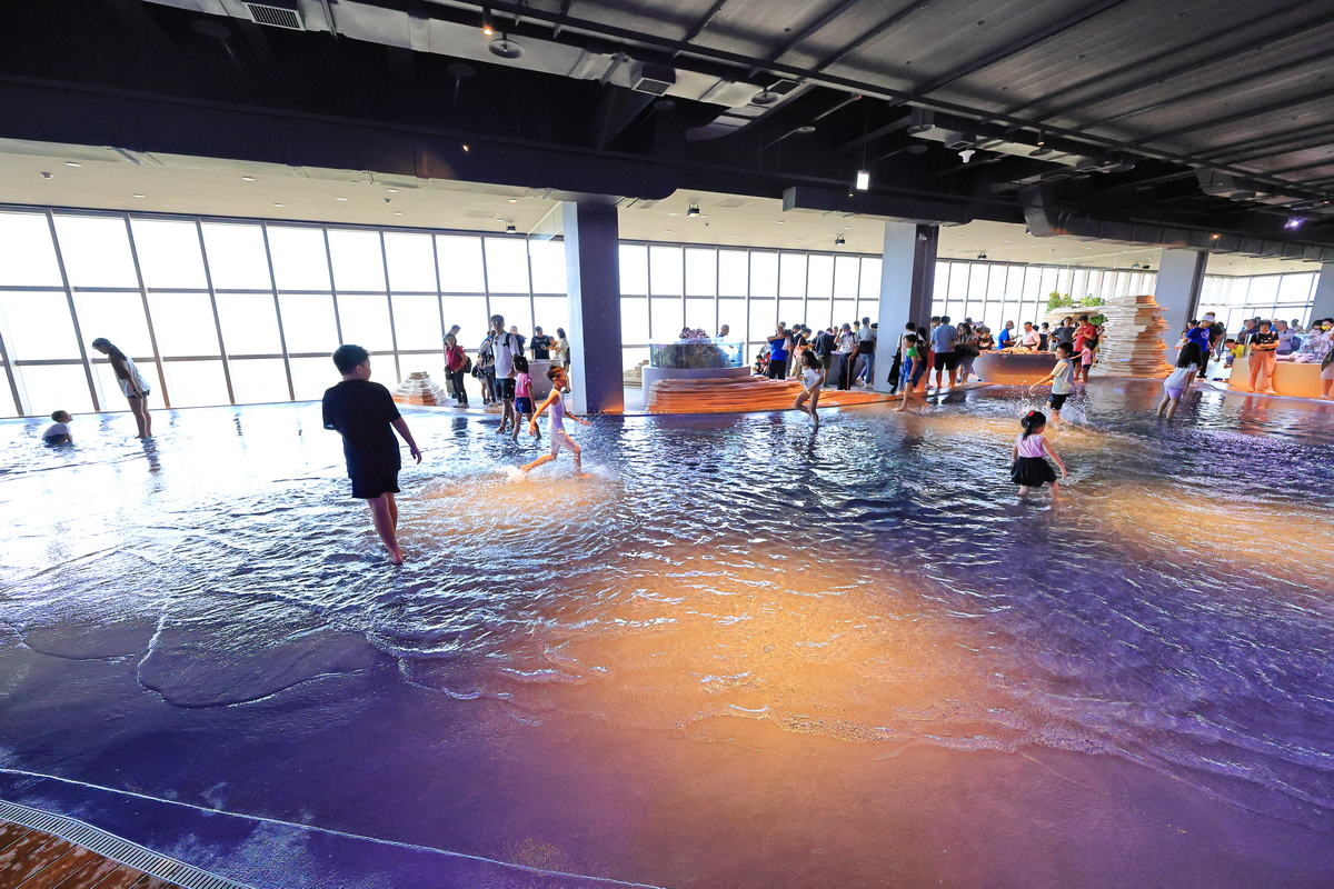 接著我們抵達場館4F的【濕地】展示空間,此處的展示空間,呼應著3F台中河川下游尾聲的潮間帶,打造台灣首座室內人工濕地的寬敞空間,而這座人工濕地雖然在此時絡繹不絕的試營運人潮下,成為孩子們於此愜意戲水的空間,但最特別的是這座濕地並非只是展示的水池,而是會隨著時間變化有著潮起潮落的漲退潮變化,於是我們能隨著這座人工濕地透過雙腳踩踏,換回昔日童稚的玩樂心情之餘,感受如同台中高美濕地潮差起伏的自然變化。