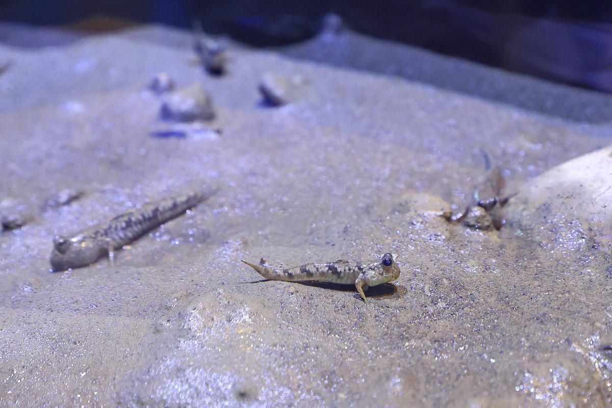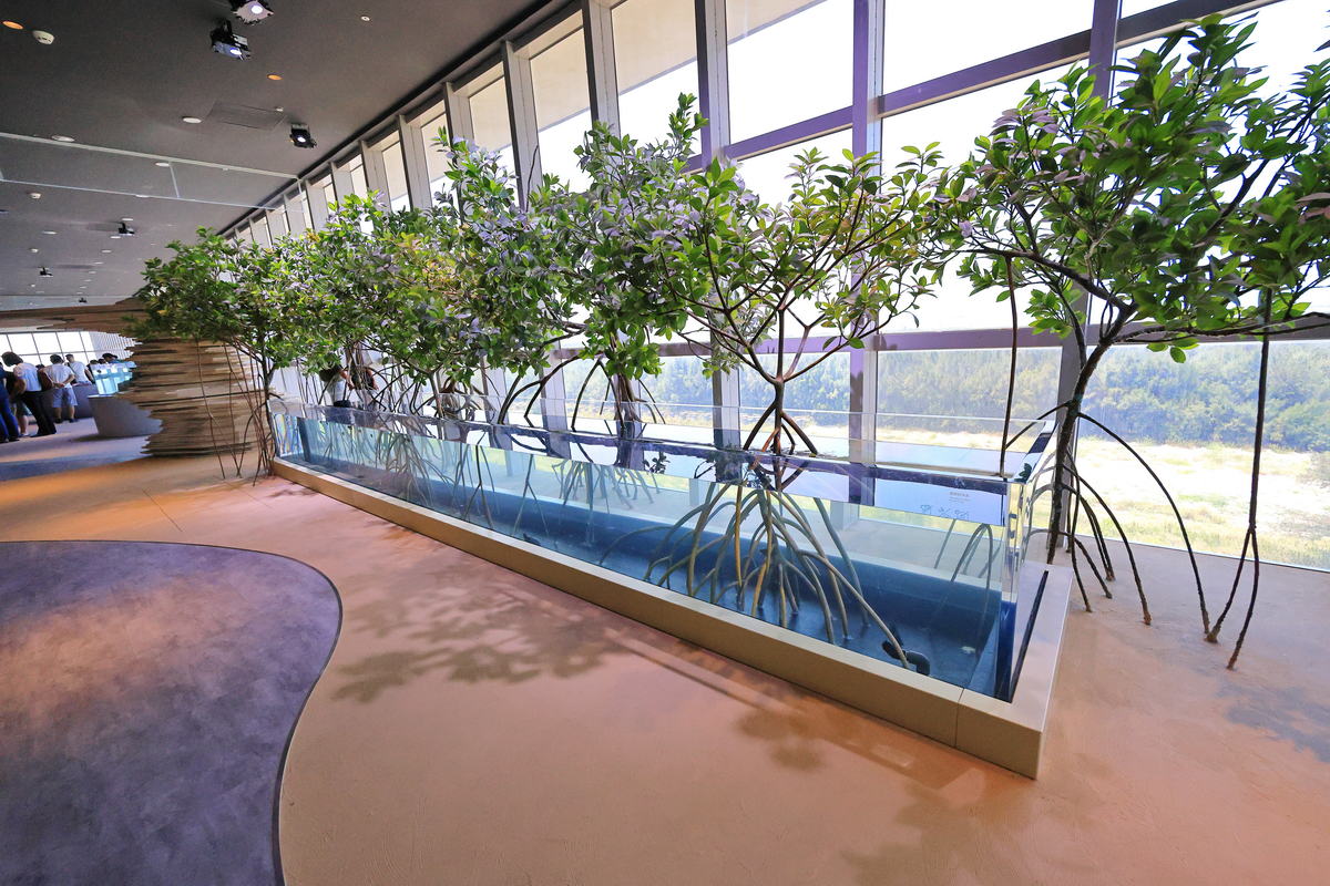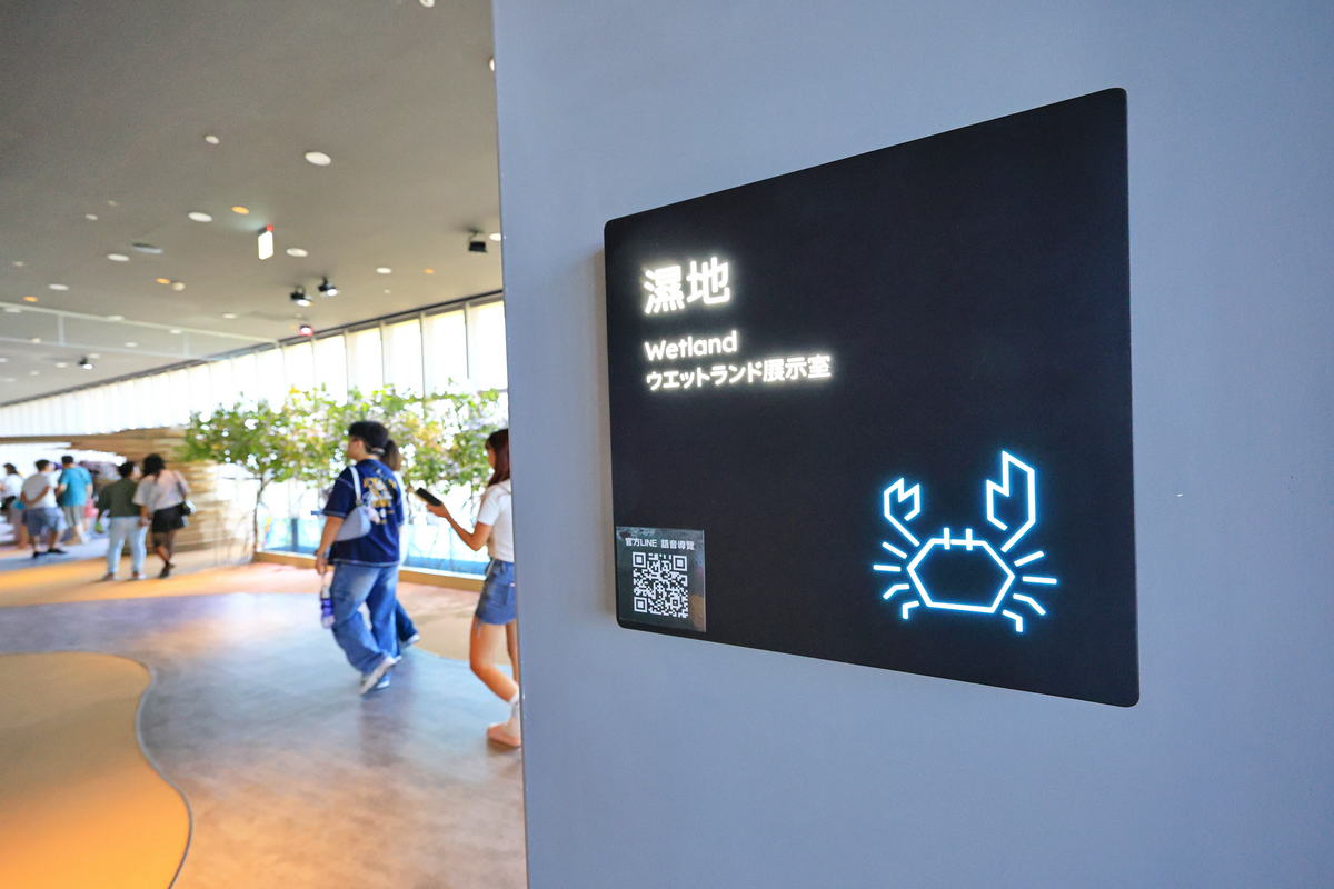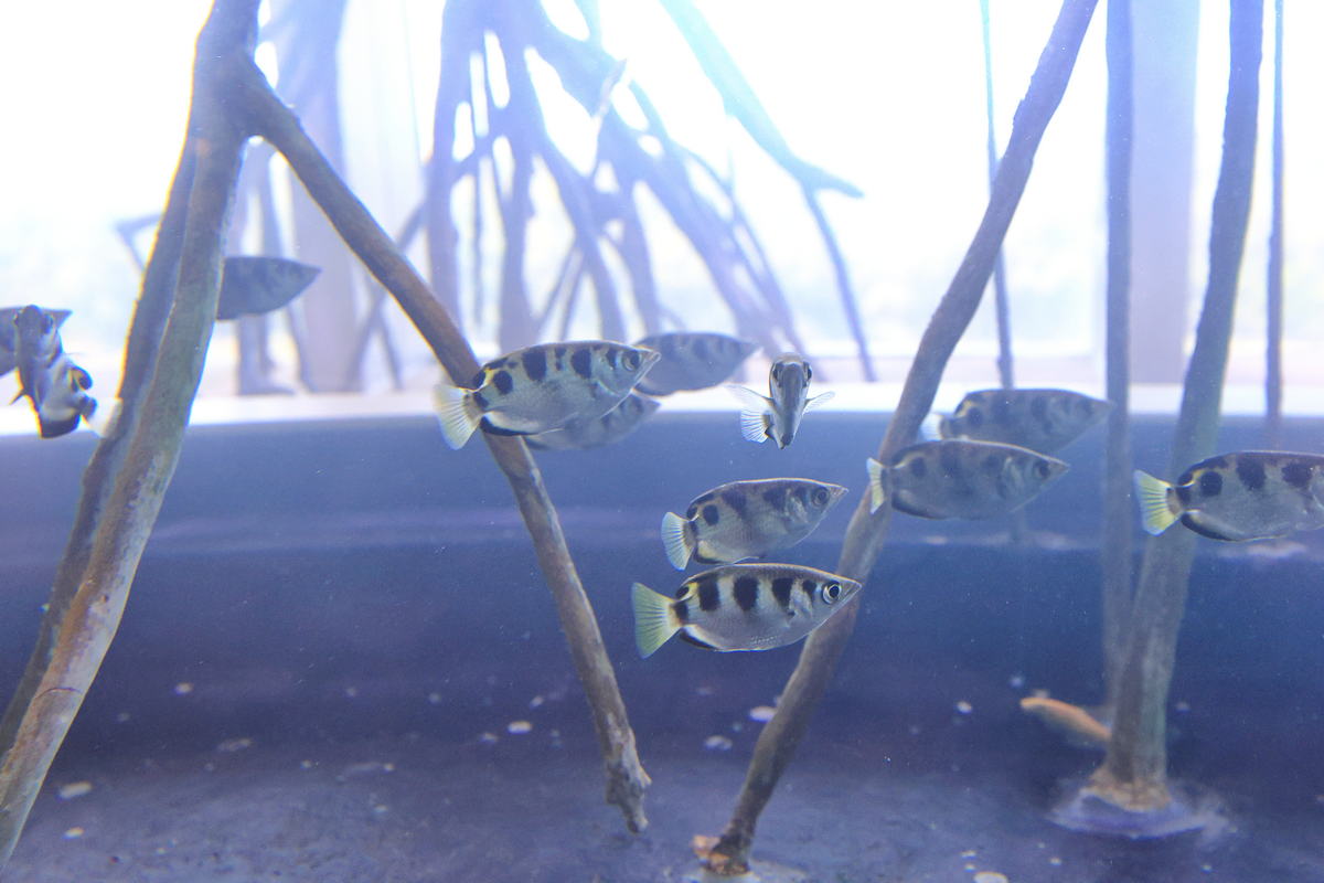 同時,4F的濕地展示空間不僅只是人工濕地的設計,而是透過人工濕地作為體驗的開端,帶著我們進入潮間帶之中,觀察隱身於水筆仔紅樹林、泥灘之中跳躍穿梭的可愛銀身彈塗魚、弧邊招潮蟹,抑或是漲潮後於水下不斷仰首窺看是否有昆蟲可以覓食,進而像是水槍一樣噴出水柱擊落昆蟲於水面來覓食的橫帶射水魚,接著再慢慢地從潮間帶慢慢深入近海的淺層海洋之中,觀察著我們生活的島嶼周遭近海伴隨著珊瑚、礁盤而居的裸胸鯙類(海鰻)、繽紛的鐮魚(神仙魚)等許多台灣近海可看到的魚類,甚至是趴伏於沙岸地形之中的各種魟魚,已是相當多元豐富。