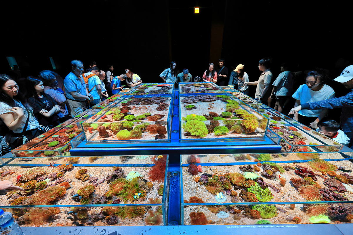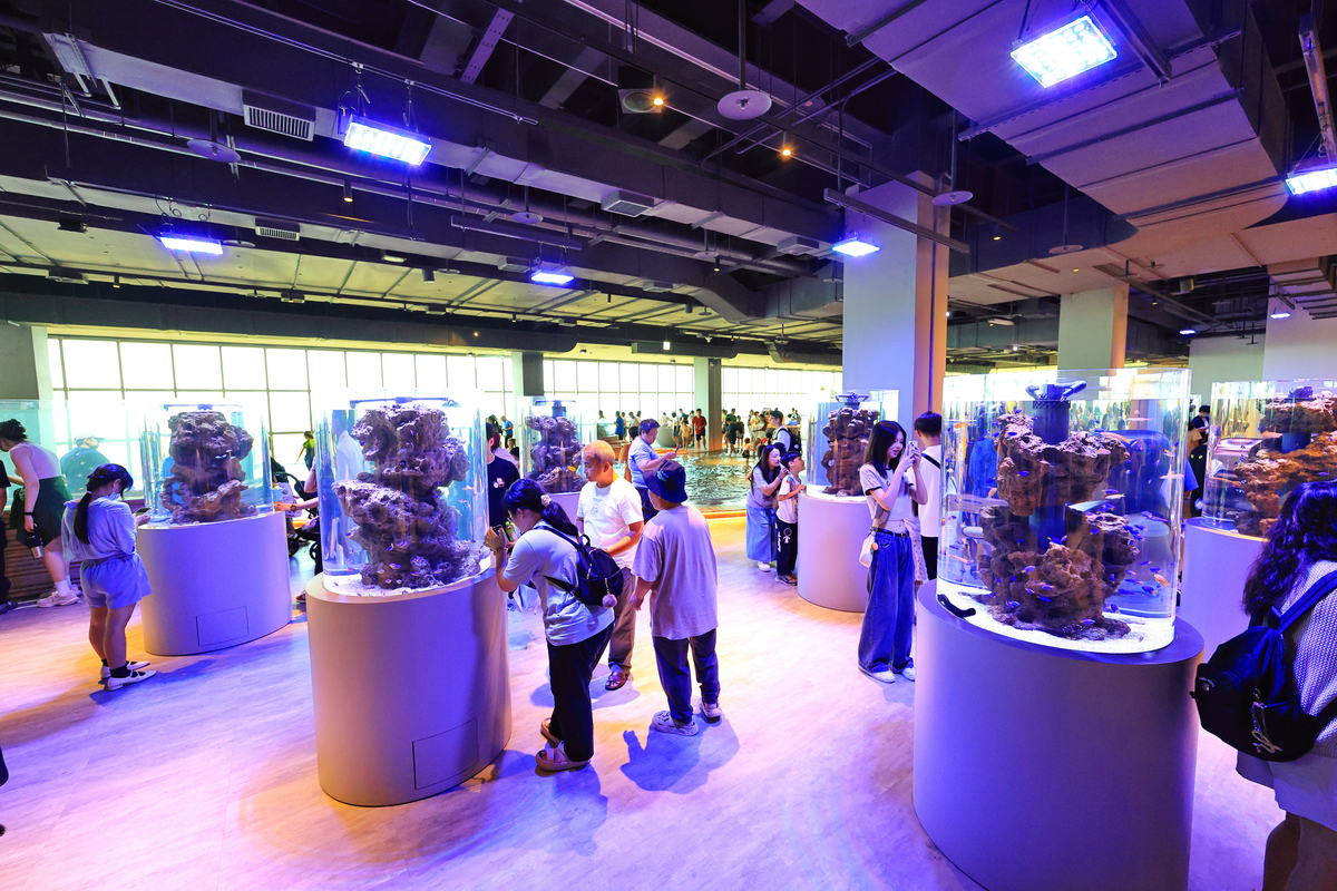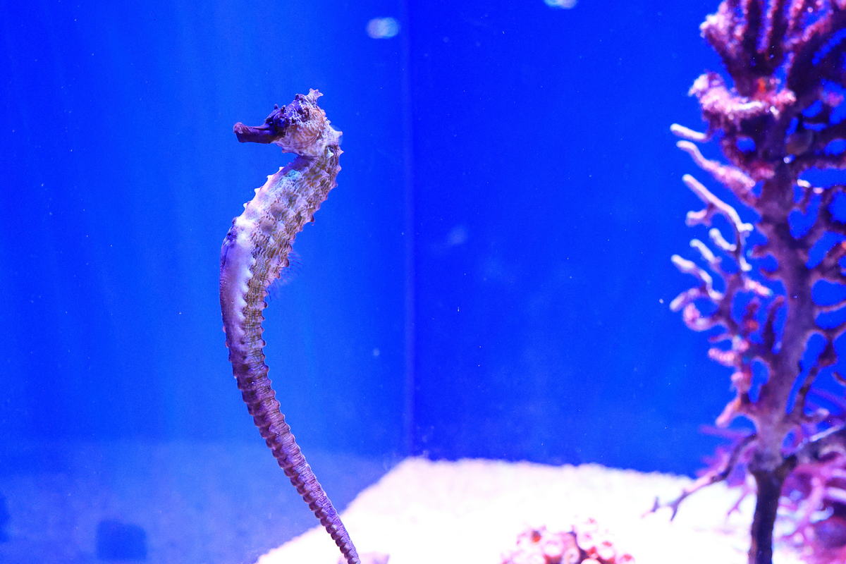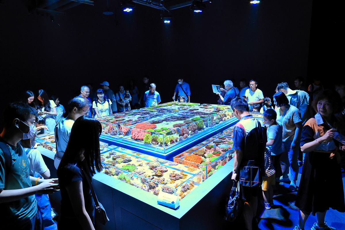 再往前走些進入【璀璨珊瑚區】,眼前一座座開放且堆疊成立體型態的珊瑚展示缸,透過像是進入藝廊欣賞藝術品燈光投射下,此時眼前各種珊瑚展示缸就像珠寶一樣散發著璀璨光芒,同時在細細品味這每一個像是珠寶盒中的絢麗珊瑚,還能發現與海葵共生的可愛小丑魚,或是色彩繽紛的網紋活額蝦、嘟著可愛小嘴的海馬們,於此愜意游動呢!