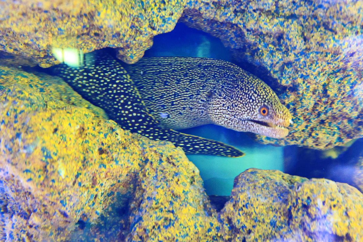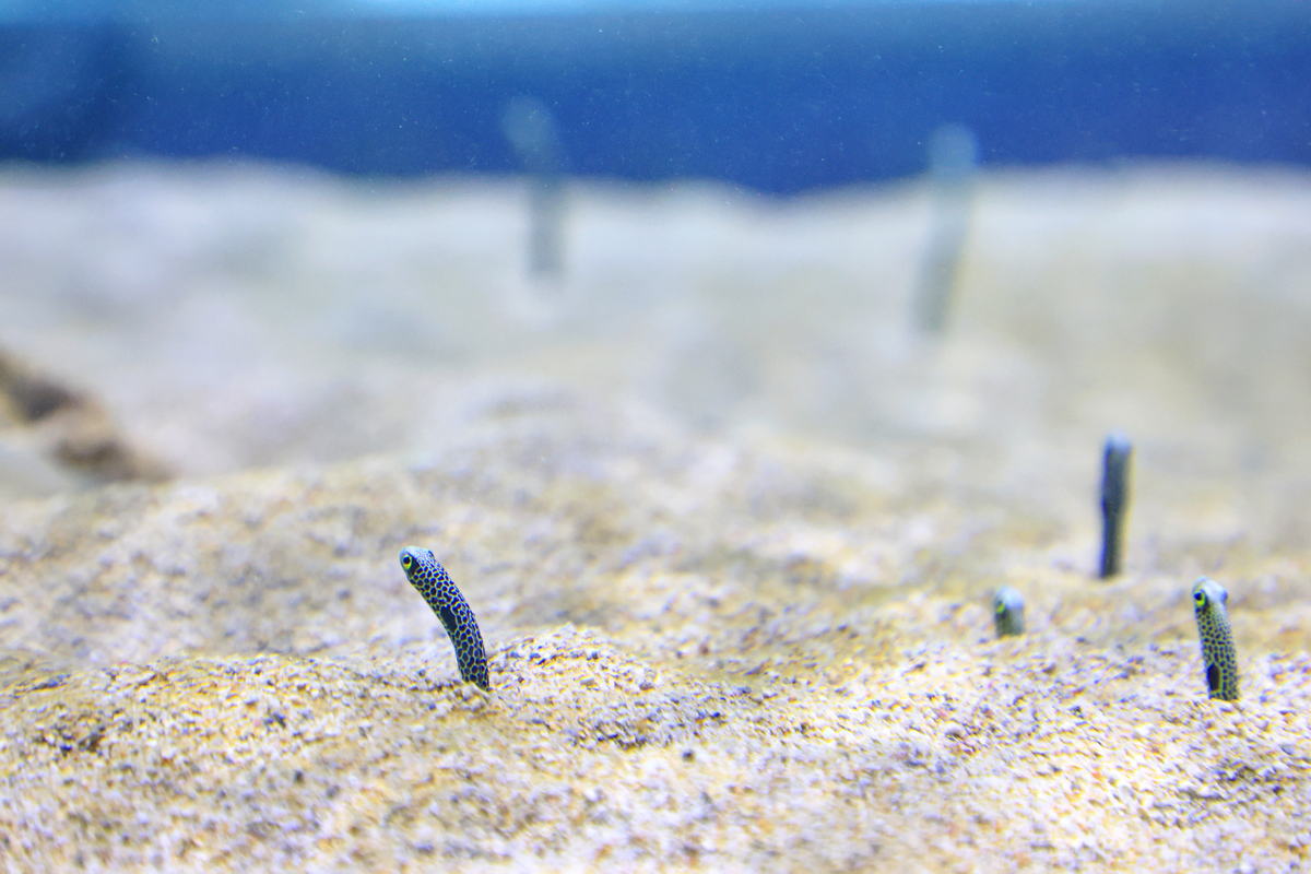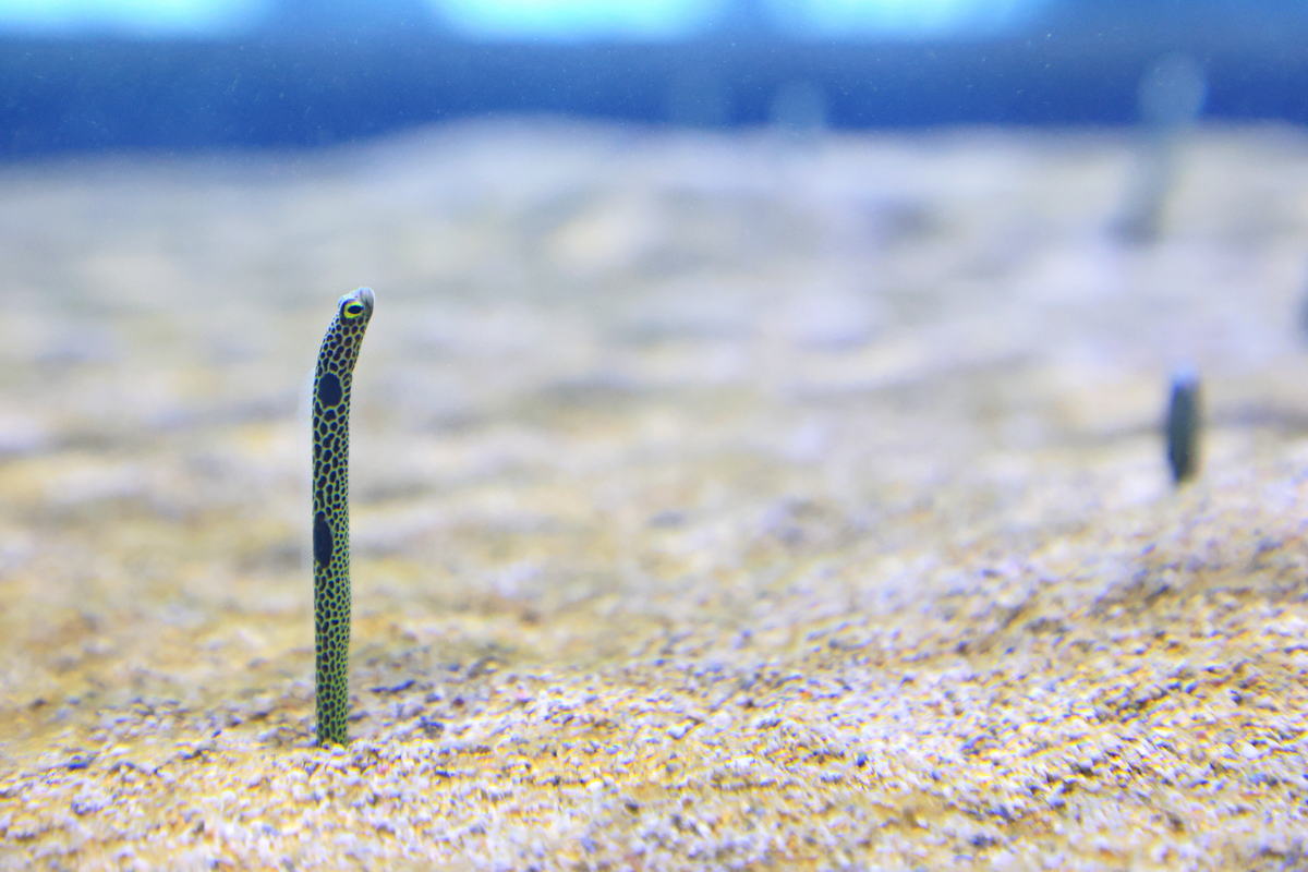 此外在這裡還有一處長達7公尺的全台最大花園鰻展示缸,在過往潛水活動時要看花園鰻,不僅需要小心翼翼的匍匐靠近,同時呼出的氣體不能過於劇烈,讓生性害羞的牠們可以慢慢地探出頭來,才能讓我們欣賞牠可愛呆萌的樣貌,而在台中海洋館,不僅有著寬敞的且無須考量潛水空氣剩餘的狀況,而且這群哈氏異糯鰻(花園鰻)就像是不怕人近距離觀察一樣,愜意的在水中探頭探腦地擺動著,極為可愛的樣子,為4F濕地區寫下最棒的觀察體驗。