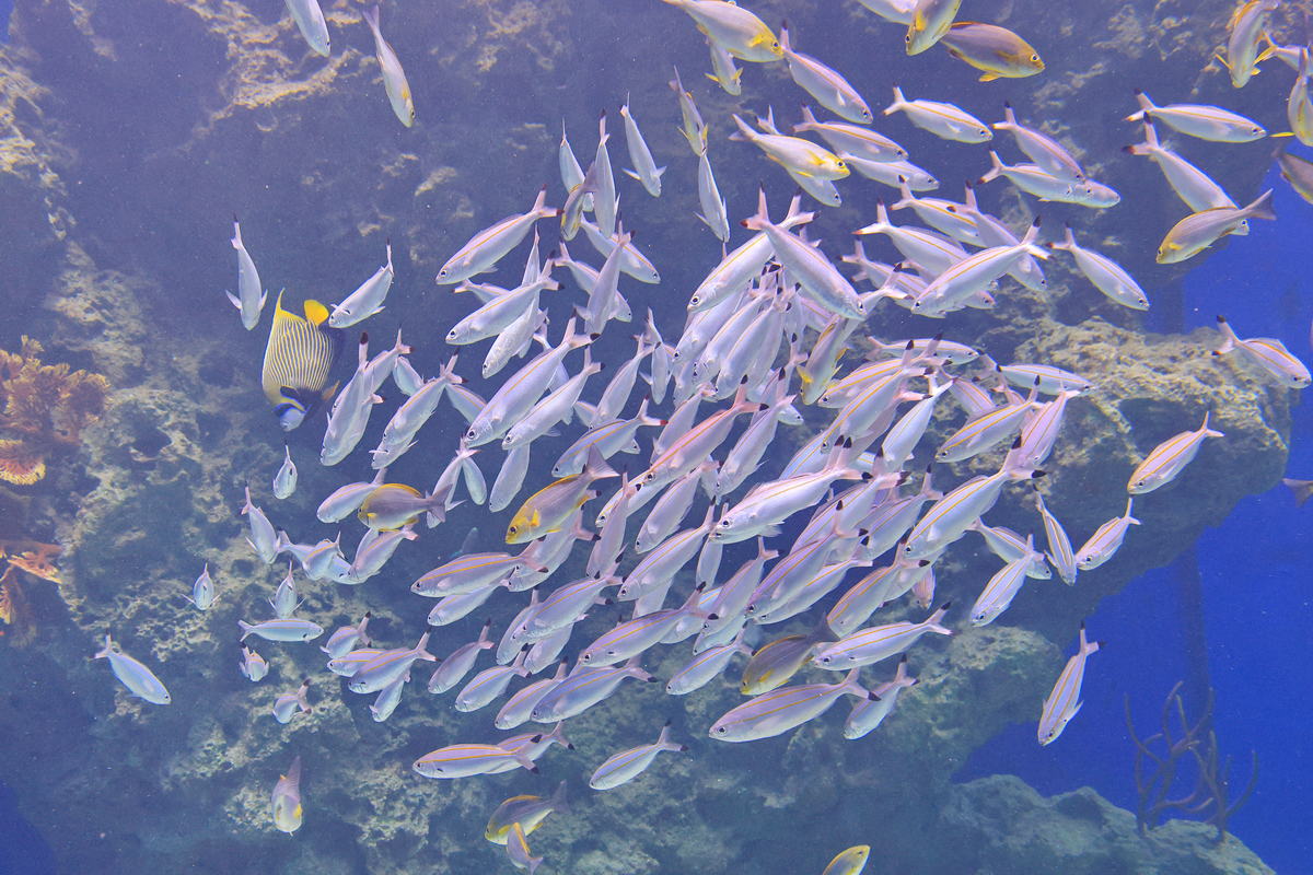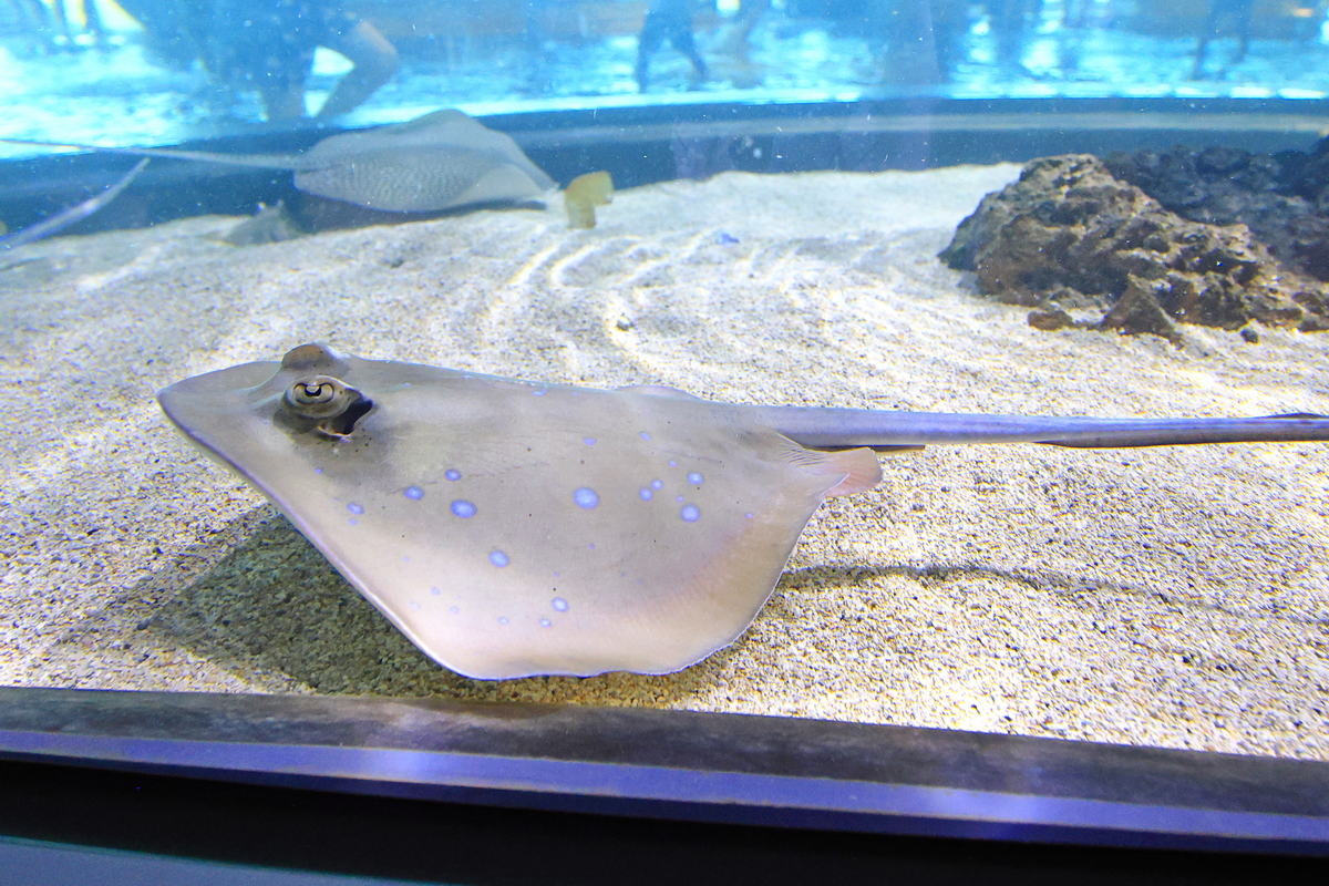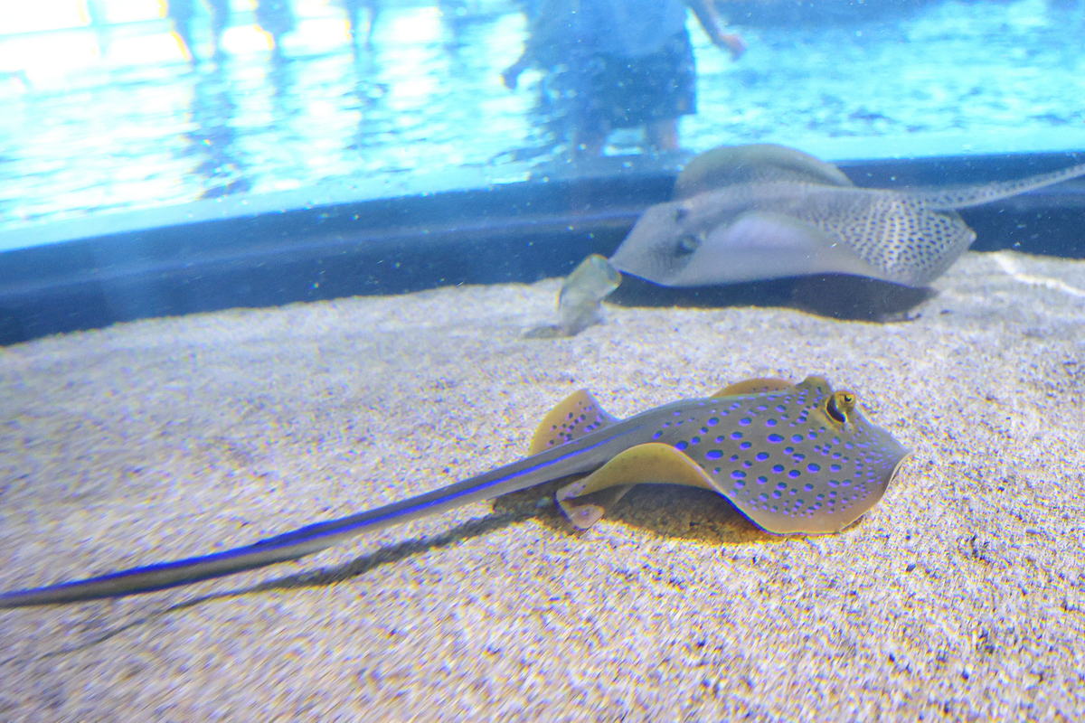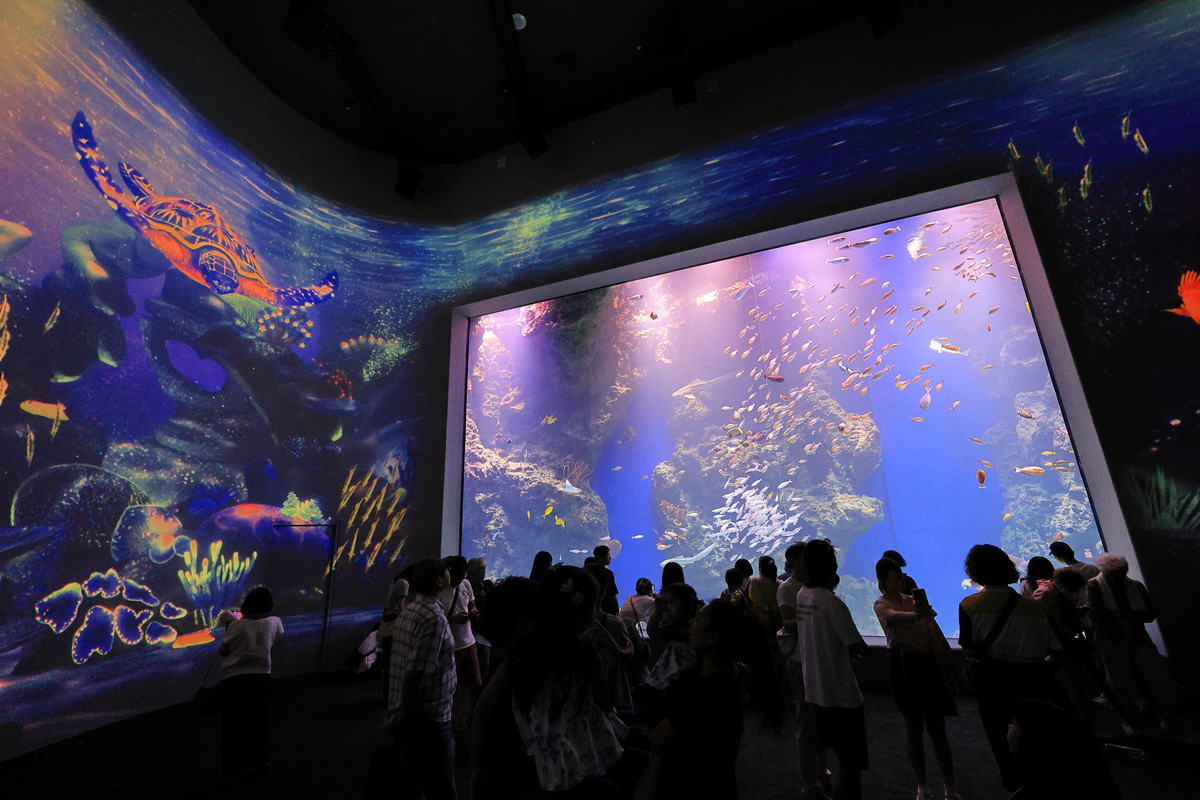 隨著鯊魚們一路在近海共游後,這趟從河川上游一路順流而下至海洋的旅程,也在抵達圍繞著台灣島嶼的世界第二大洋流【黑潮之海】展示空間即將為這場水文生態系的巡禮進入尾聲。從2F高處走下階梯前往1F的黑潮之海展示空間中,眼前巨型投影螢幕從像是藍眼淚的夢幻光影、飛魚耀動海面等充滿沉浸式的影像,與這座巨型高聳的黑潮展示缸有著完美的呼應,無論是從2F至高處觀賞全景,抑或是靠近展示缸與遊客們一同抬頭仰望並讚嘆著黑潮中豐富的魚群生態,感受這不可思議的大海壯麗感,真是一場享受,此外喜歡潛水生活的我,在這黑潮展示缸中,更看見了雙帶鱗鰭烏尾鮗、繽紛疊波蓋刺魚、花斑擬鱗魨(小丑砲彈)等等在台灣潛水就能容易發現的魚種,頓時讓我好想再找個時間潛進大海之中,感受湛藍海洋的魅力呢!
