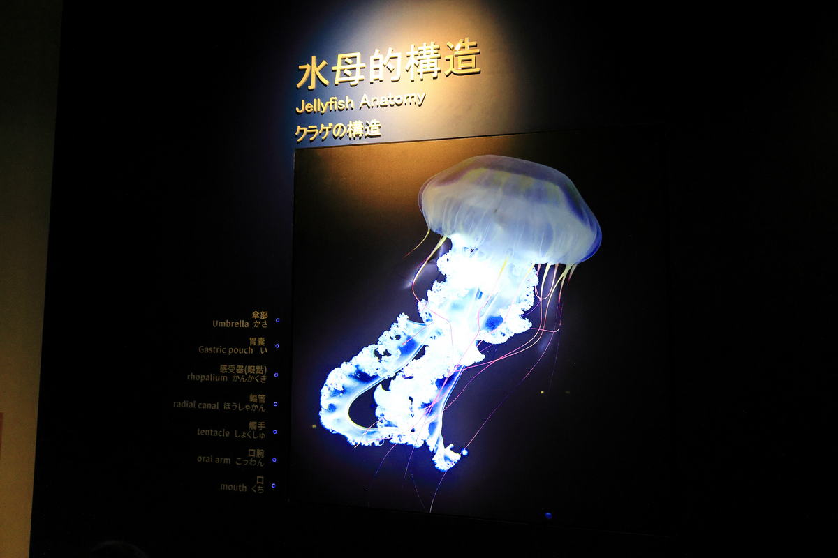 此外在有著20種水母的展示區之中,從台灣首展的超迷你水母“烏鴉帽水母”,到巨大且充滿妖豔身形的南美洲海刺水母,每一種水母在光線照耀下,所散發猶如電流閃耀的繽紛型態,真的是相當迷幻呢。