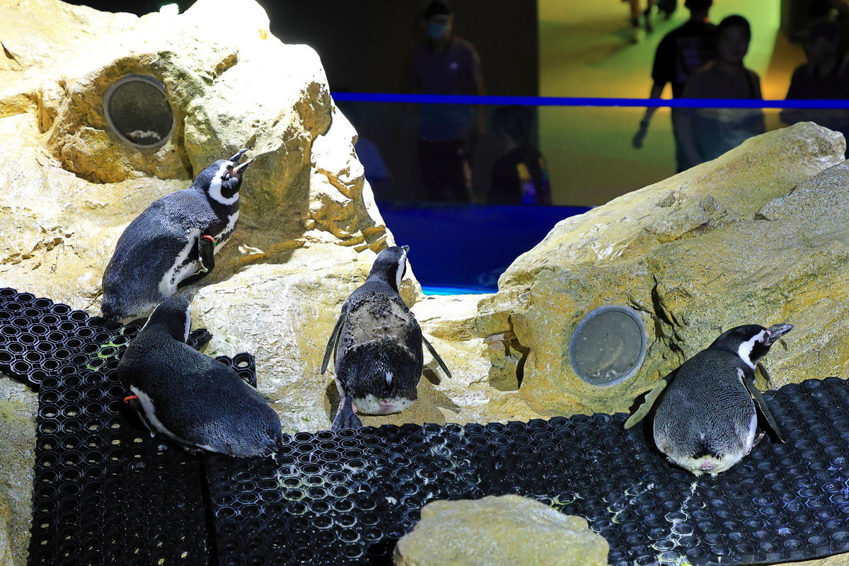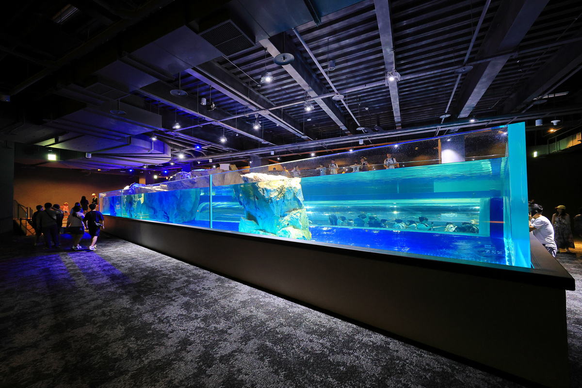 接著我們進入2F的展示空間,首先映入眼簾的即是一座佇立於展場之中,且頂部開放的區域,仔細一看,原來是【企鵝區】!此時此刻,你是不是覺得納悶,這樣開放的展示空間,企鵝不會熱昏嗎?事實上,並非所有企鵝都生活於我們所認知的寒冷南極圈中,我曾在春暖花開的時節,在紐西蘭南島看著嬌小可愛的藍眼企鵝從港口上岸準備返巢。這次在台中海洋館企鵝區中所豢養的麥哲倫企鵝,則是生活於南美洲阿根廷、智利和福克蘭群島沿海的企鵝,因此場館內的溫度正是他們最舒適的生活溫度,而在這座可以環繞一圈的展示缸中,不僅可以隨著自己的腳步與企鵝同游之外,更特別的是也能彎身進入像是隧道之中,抬頭仰望觀察,甚至是在這開放的展示缸中,聽著企鵝們之間的互動聲音,這更是前所未見的有趣觀察體驗呢。