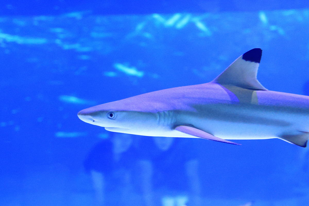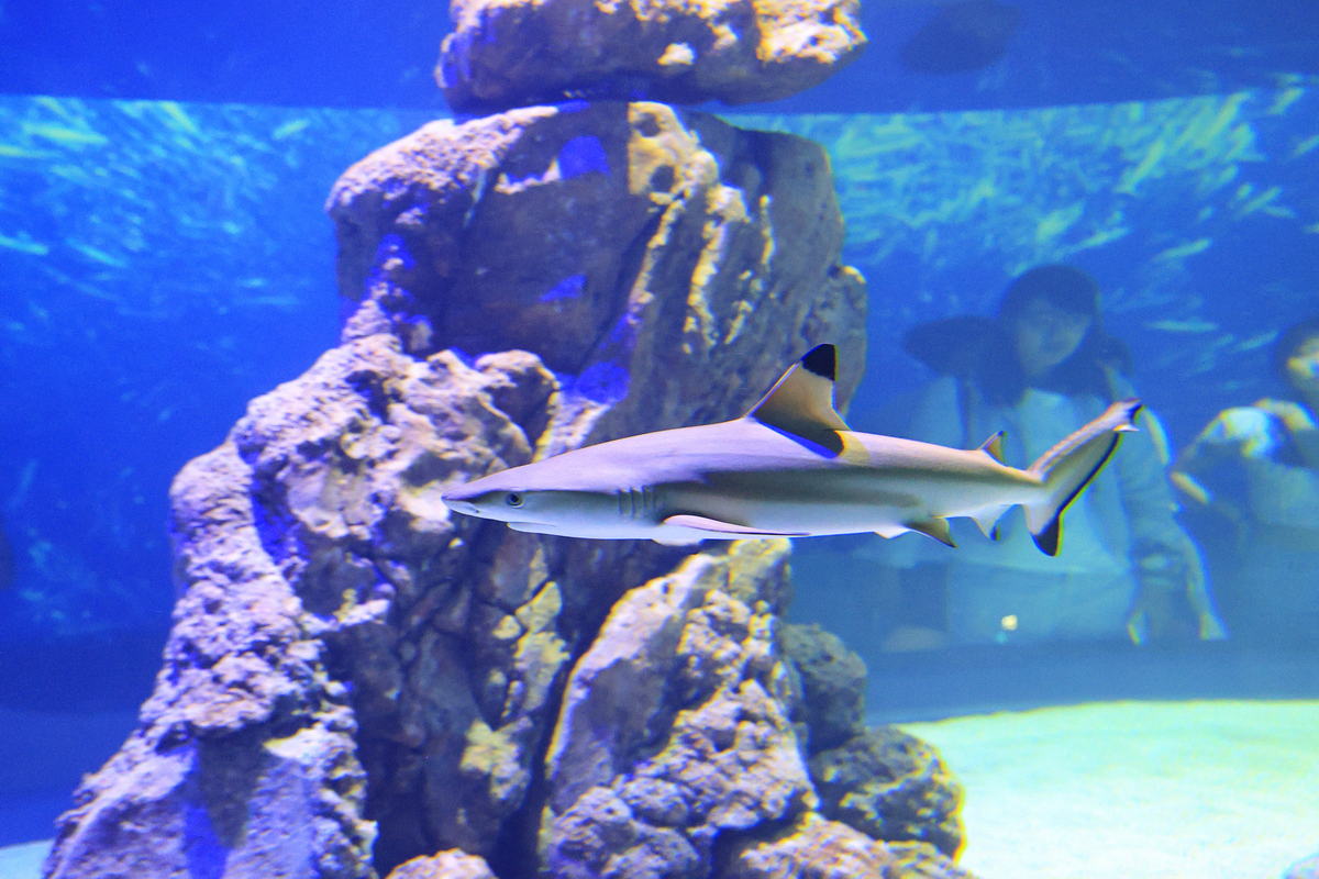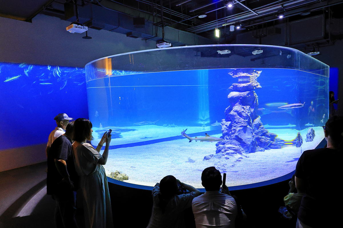 而在2F展示空間的尾聲,眼前一座像是模擬大海獨立礁的展示缸中,更有著汙翅真鯊、條紋狗鯊與灰貂鯊這群生活於近海的【鯊魚巡游區】,在這座獨立礁之中環繞悠遊,而我們也能隨著這座360度的展示缸,與鯊魚們一同來場安全又充滿氣勢的伴游,細細觀察鯊魚作為海中王者的姿態呢。