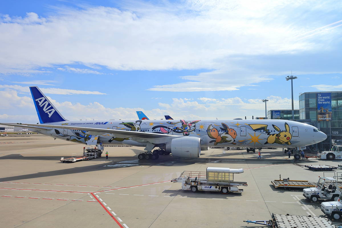 降落於日本東京羽田機場第三航廈時,一旁全日空的波音777-300ER是描繪著寶可夢中伊布進化成各種型態並與皮卡丘一同向前邁進的伊布彩繪機,而這架JA784A的彩繪機航線則是有著羽田來回紐約、芝加哥、舊金山、倫敦,以及成田來回舊金山、芝加哥這6條航線。