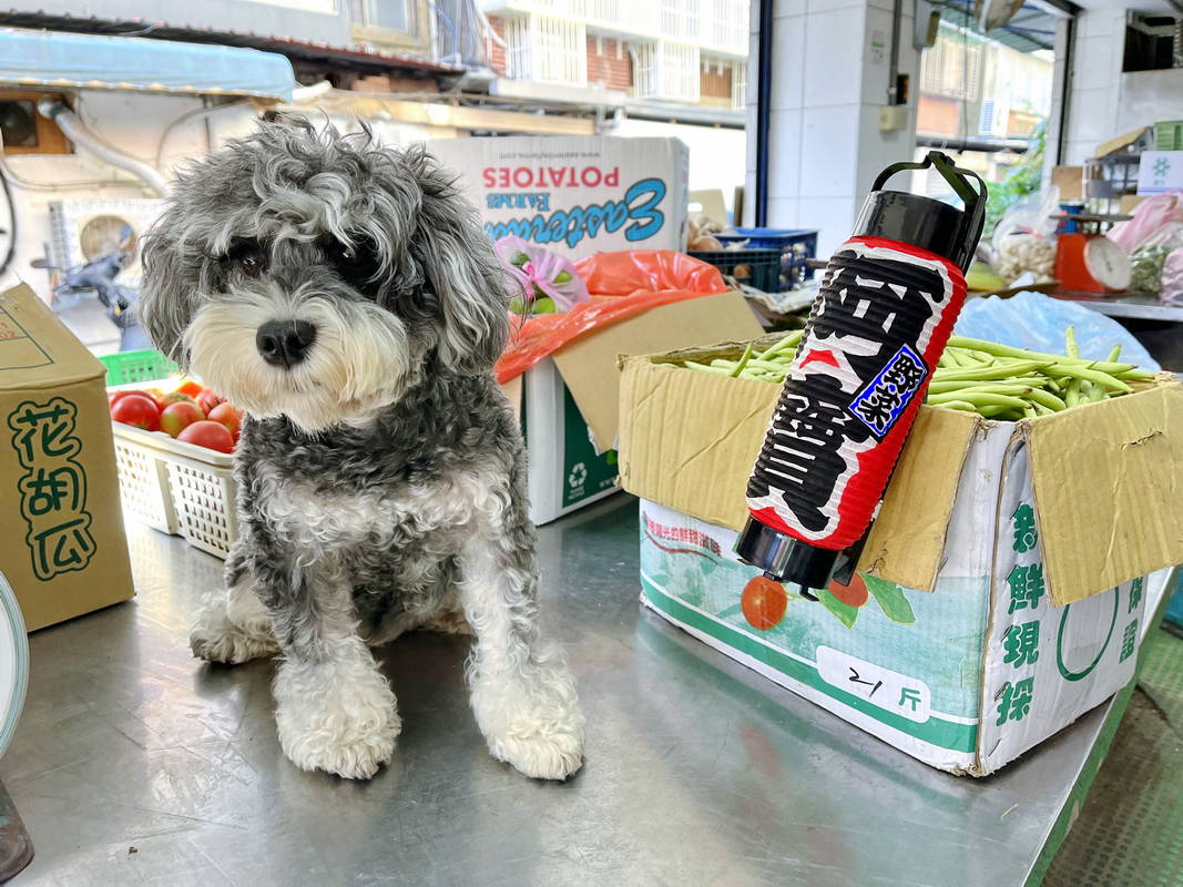 (雖然妞妞已經變成天使,但我很喜歡她與家裏菜攤同樣為招牌招攬客人的合照)