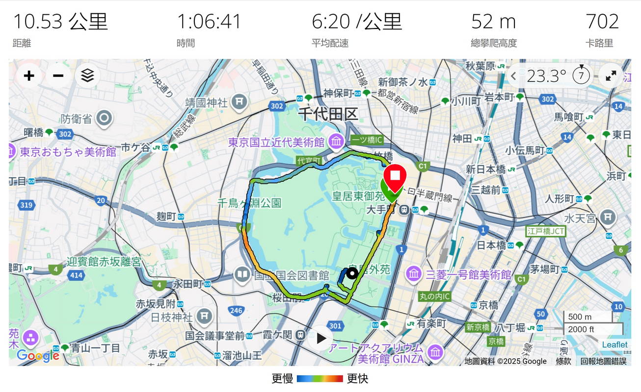在這即將傍晚的午後,欣賞著進出昔日江戶城的高聳大手門遺跡,並隨著自己的雙腿跑動、穩定的呼吸頻率,欣賞著護城河已化為平緩和諧的池水,映襯著連接著江戶城與東京都之間的平川橋、乾門、櫻田門以及有著眼鏡橋之稱的經典二重橋,不僅感受著左手側由德川家康於1457年落成迄今依舊保有其古樸的日本幕府時代氛圍,同時右手側盡是相當摩登時尚的東京都會大樓,透過護城河為界的劃分,跑在這條步道上,就如同淺草寺雷門前的人力車伕一樣,感受著穿梭於古代與現代之前的奇幻感受呢,而且這一圈的步道上,不僅路面相當寬敞平穩好跑,共3間公共廁所也相當平均的座落於這圈步道上,果然是一處跑者友善、風景優美的慢跑聖地呢,因此不知不覺中,輕鬆又愜意地在此跑了2圈共10.53k的皇居Run之旅呢!