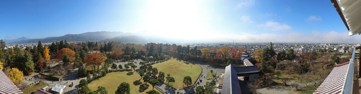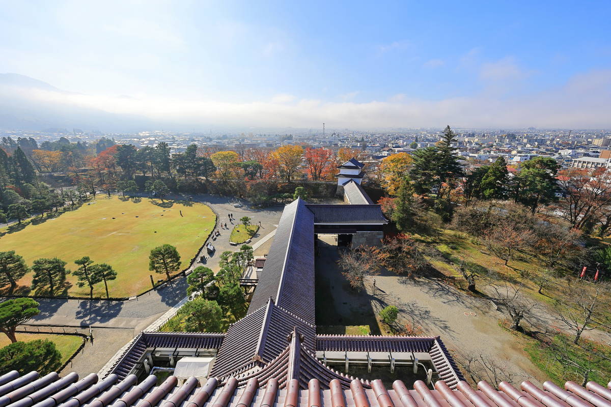 登上天守閣頂樓,隨著通往護城河守望塔的干飯櫓,將視線眺望整個會津若松地區,想像昔日城主於此感受自家領地遼闊的心境,真是特別。