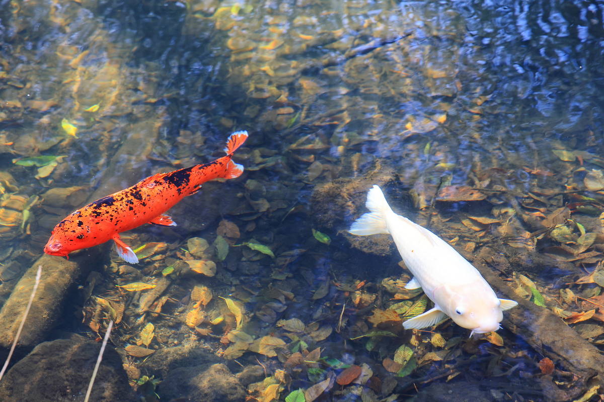 而湖水中還有著許多錦鯉會靠近岸邊觀察著造訪的遊客,相當可愛。