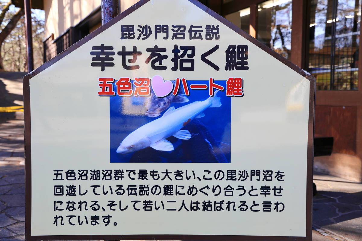 在遊客中心的告示牌中,與造訪五色沼地遊客分享可以試著找尋這位全身白僅腰身一抹如同愛心點綴的錦鯉,看到牠可是會有幸福的加持呢。