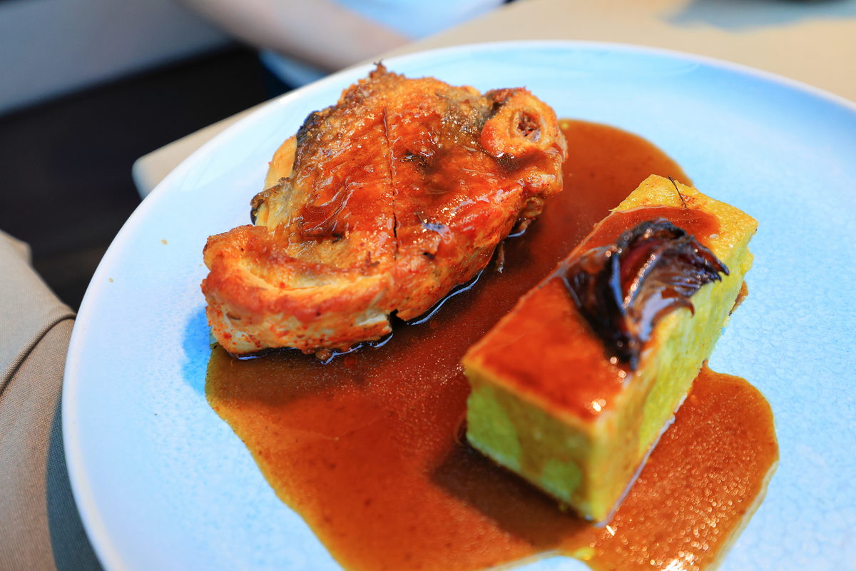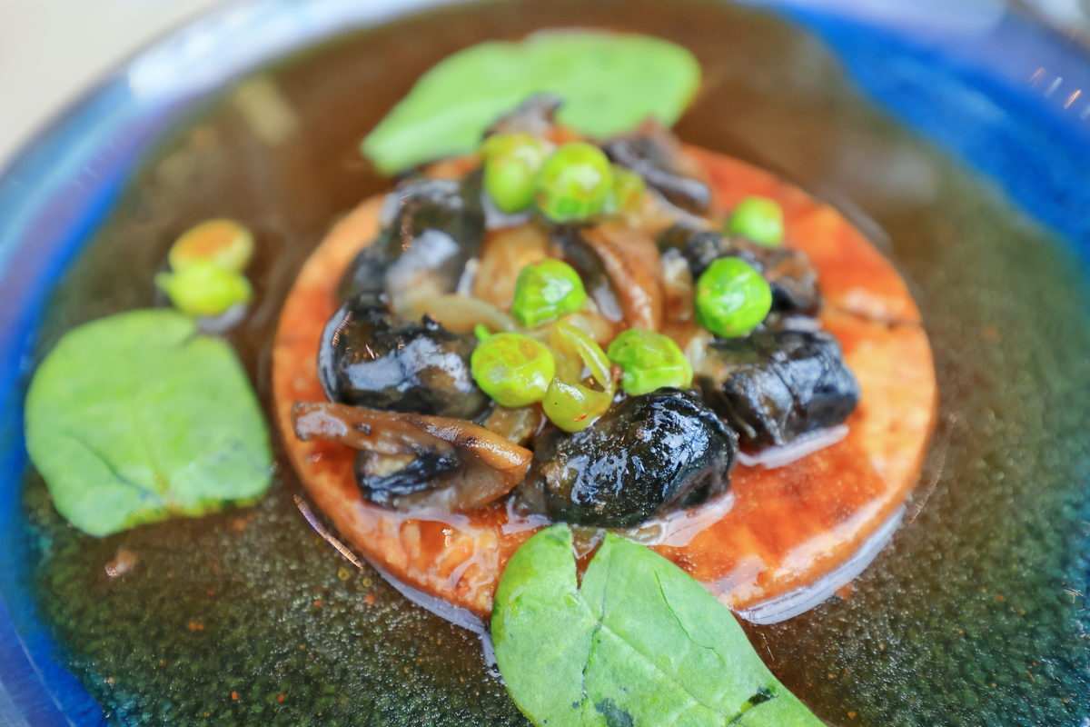 除了台灣熱炒店知名的炒螺肉,在法國必定不能錯過蝸牛料理,因此前菜選擇了這道鹹香軟嫩的蝸牛薄餡餅。