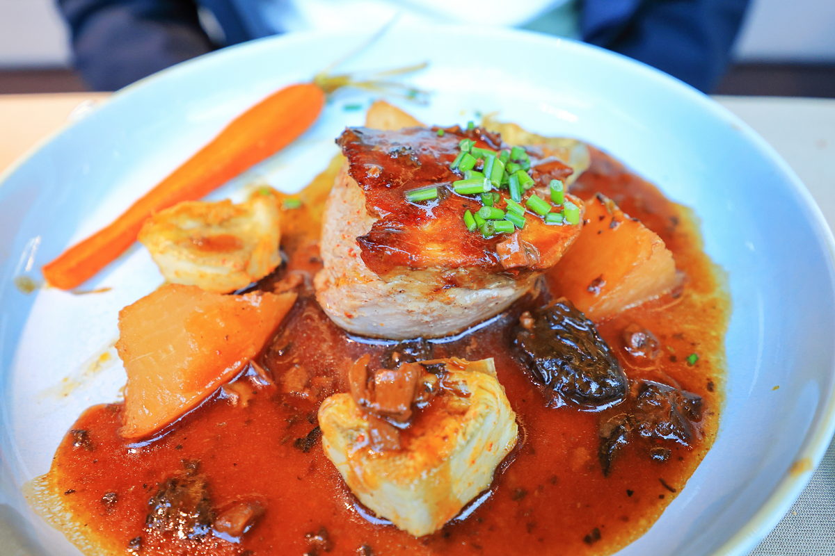 主菜:小牛腿佐羊肚菌醬汁搭配朝鮮薊、紅白蘿蔔。