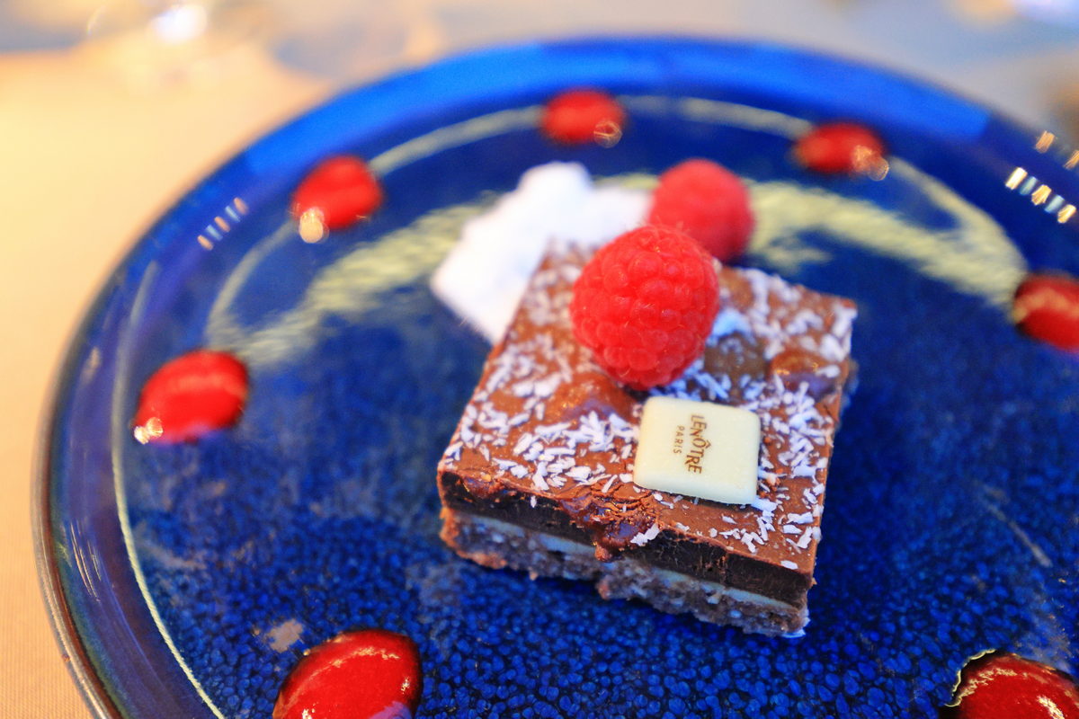 甜點:椰絲覆盆子巧克力蛋糕。