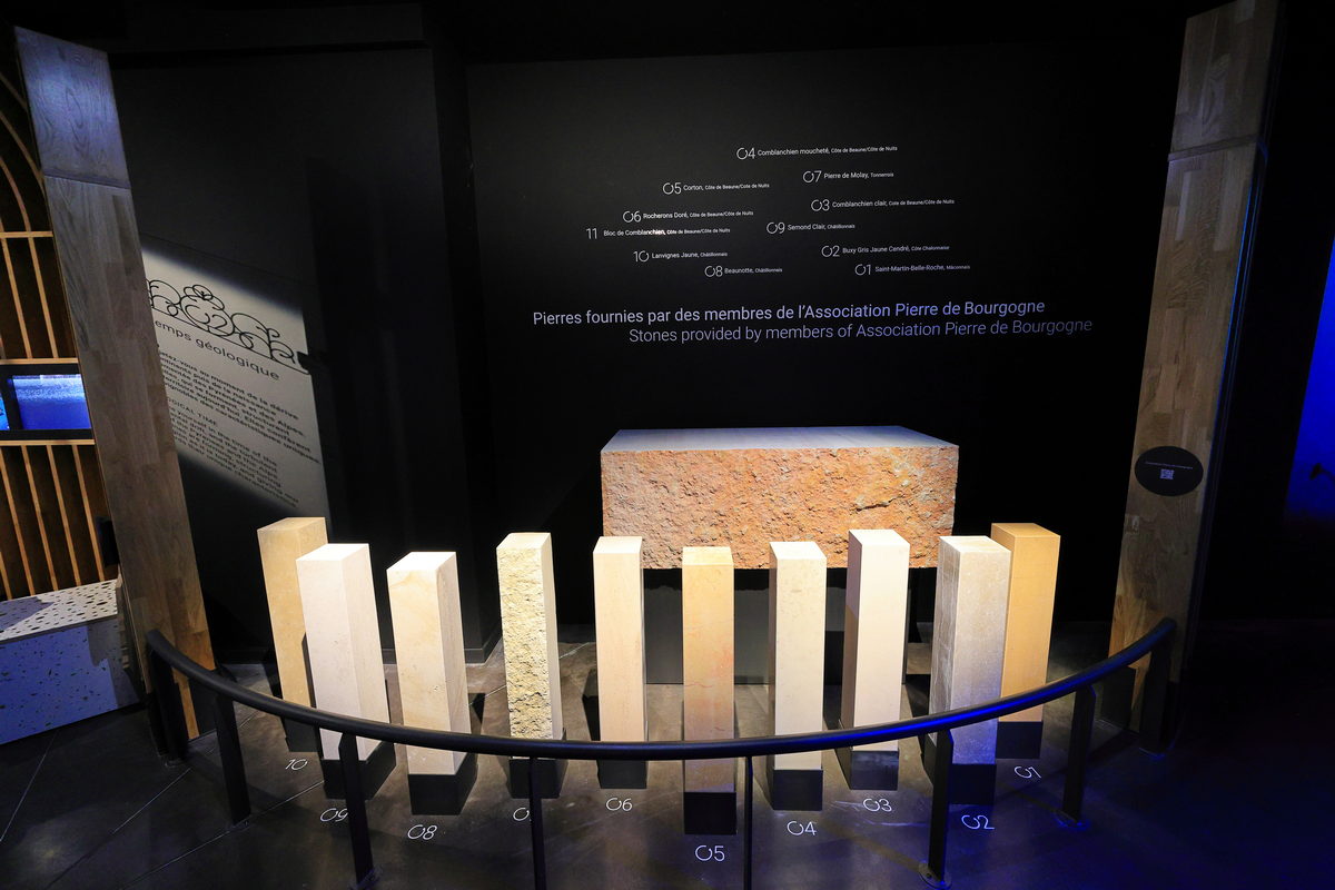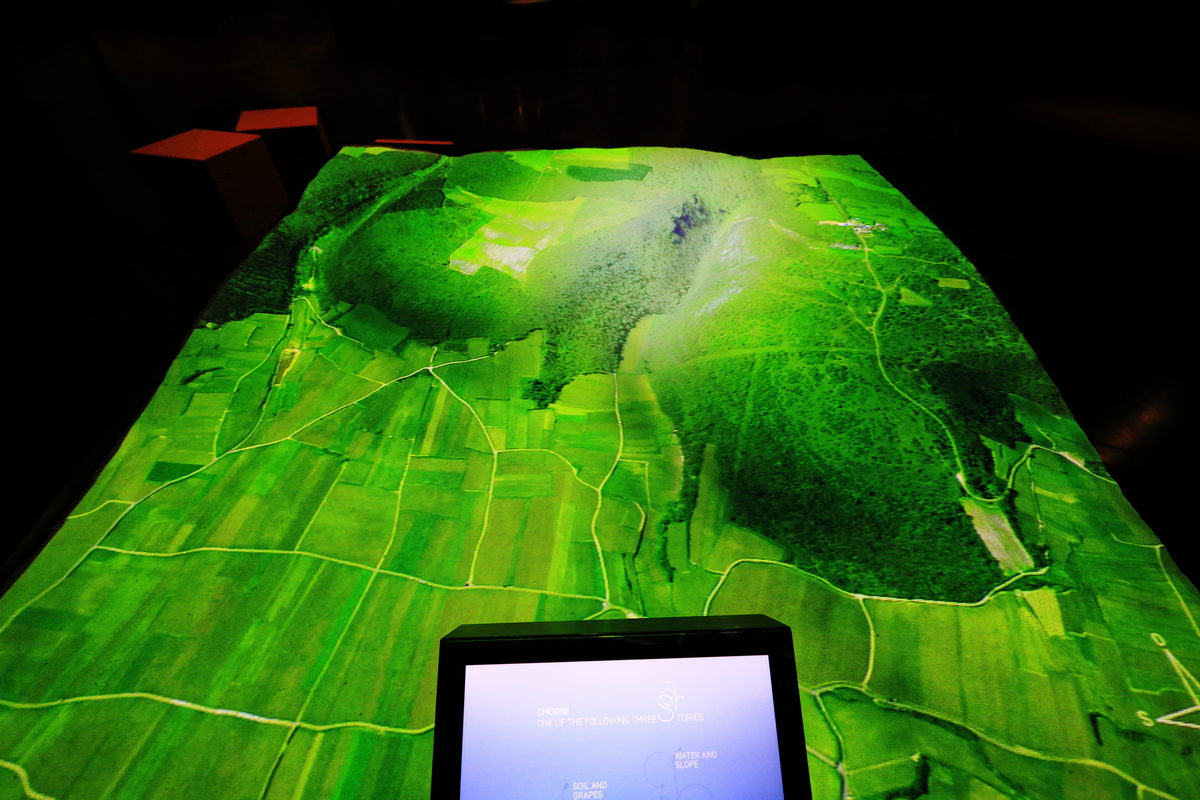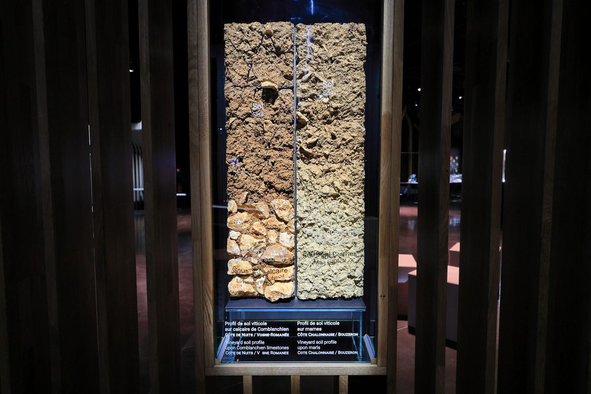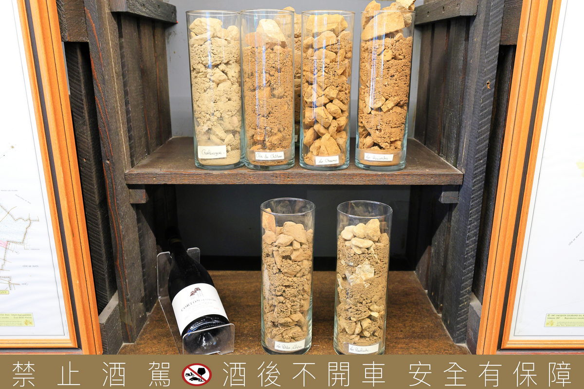 在這座葡萄酒博物館中,僅1樓的展覽空間是需要購買門票參觀的,從5樓依序而下的眺望台、餐廳、葡萄園、紀念品店等環境設施,皆是免費參觀,首先我們買了門票進入1樓的展覽空間,準備開始認識勃根地這塊孕育葡萄酒的土地。首先在博物館陳列的開端,即是介紹著面積僅3萬平方公里的勃根地,其狹長的山谷地形以及南北不同的氣溫、濕度以及土質變化,從北到南分,夜丘(Côte de Nuits)、朋丘(Côte de Beaune)、夏隆內丘(Côte Chalonnaise)與馬孔內(Mâconnais),共四大產區,而我們位於的博訥(Beaune)即是位於朋丘的核心地帶,同時展示著不同產區內土石結構、礦石成分之間差異,進而造就葡萄酒有著不同風土(Terroir)氣息的特色。
