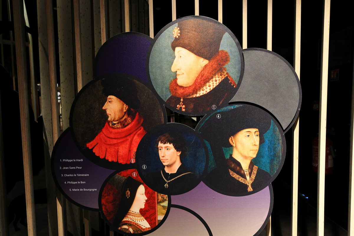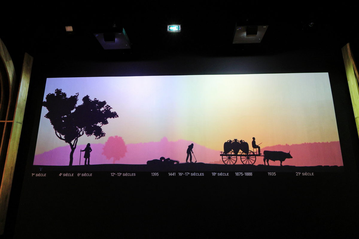 接著眼前像是跑馬燈的投影幕,引領著造訪的遊客從西元1世紀開始,了解勃根地隨著西羅馬帝國的天主教信仰之中,透過修道院的修士/修女們以種植葡萄樹,釀造有著耶穌基督寶血之稱的葡萄酒,進而奉獻於教會,於此開啟了葡萄酒從種植培育到釀造技術的精進開端。而在西元1395年,勃根地公爵菲利浦二世(philippe le hardi)帶著大量的紅酒南下前往亞維濃向教皇敬獻時,這些葡萄酒卻變得相當粗劣的難以入口,於是盛怒之下的他,禁止勃根地境內種植加美(Gamay)這款讓他感到丟臉的葡萄樹品種進行釀酒,同時葡萄樹僅能種植於環境條件良好的山坡地上以維護良好葡萄酒品質,這也就是相當有名的“加美禁令”,而今來看,雖然可以理解為應是運送過程中,保存葡萄酒方式不良導致變質,但由於菲利浦二世限制其葡萄品種以及種植規範,進而造就勃根地迄今紅酒製作以黑皮諾(Pinot Noir)、白酒製作以夏多內(Chardonnay)為主要的品種。