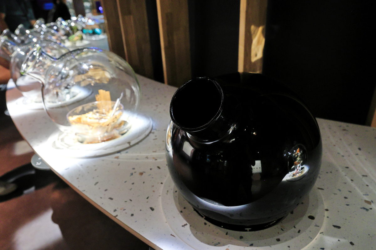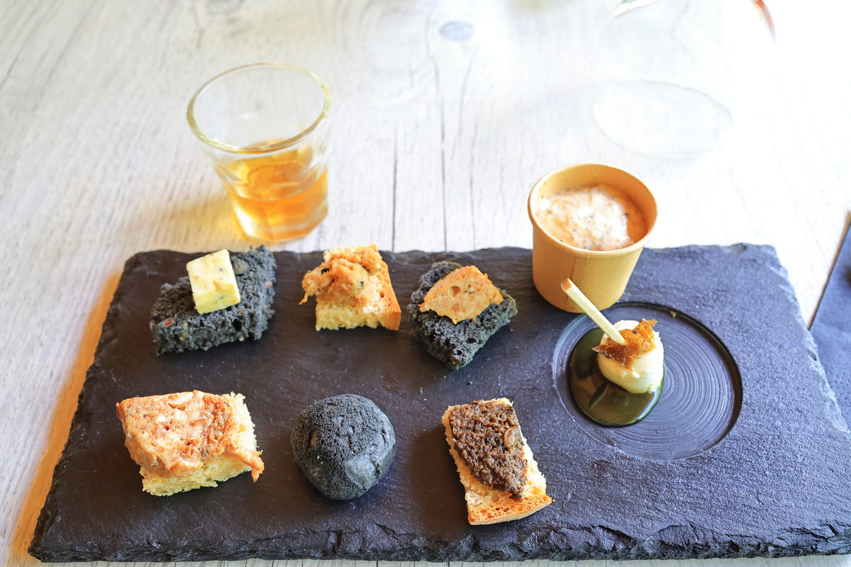 在森林裡尋找完松露後,旅程的最後我們回到餐廳,來場各種松露搭配鹹食/甜點的體驗,而這一盤以麵包、乳酪等食材搭配著松露共計8樣一口食的菜式,以及相當濃郁卻帶點類似紹興酒風味的松露酒,每一口像是濃郁的蒜末薰香卻沒有蒜辣的口感,但每樣一口食所呈現的松露風味卻又些許的不同,富有層次,雖然在這短時間內品嘗如此厚重的口感,但味蕾卻不太有負擔,這樣有趣的味覺體驗搭配著先前看著獵犬可愛的尋找松露模樣,實在新奇有趣呢!