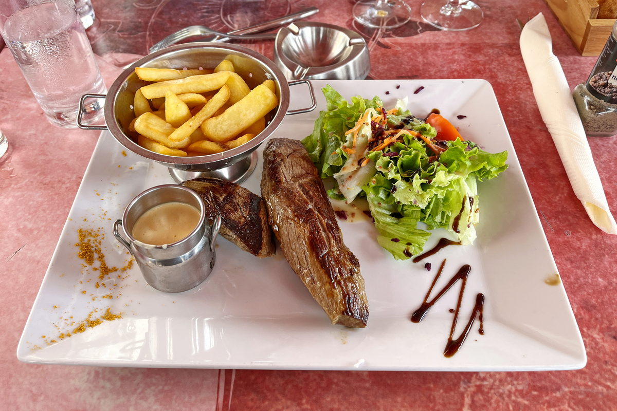 上午在酒莊【Chateau de Corton Andre】感受了一場充滿中世紀巡禮的品酒體驗後,其實從來沒有在上午時光甚至是沒吃早餐的狀態下,品嚐這麼多酒,所以此時此刻其實已經稍微有點慵懶萎靡的狀態,剛好也到了中午用餐時刻,我們一行人前往距離下午品酒體驗酒莊周圍的Hôtel-Bar de l’Étoile來場簡單的午餐時刻,隨著這沁涼的驟雨坐在撐起大傘的餐廳戶外,吃著牛排、薯條以及恢復醒腦的可樂、紅茶,倒也相當舒適愜意。
