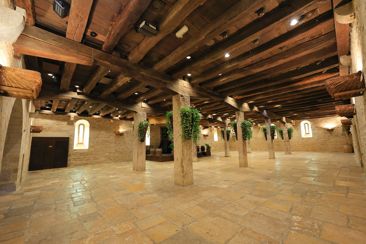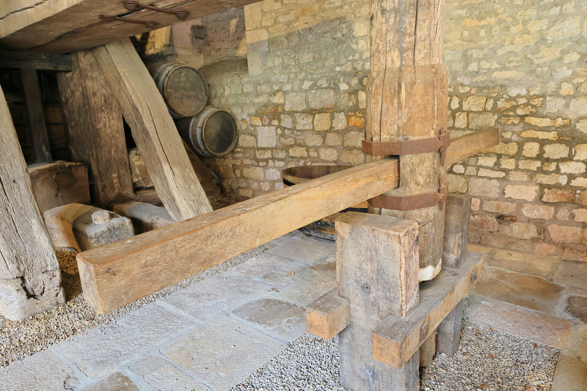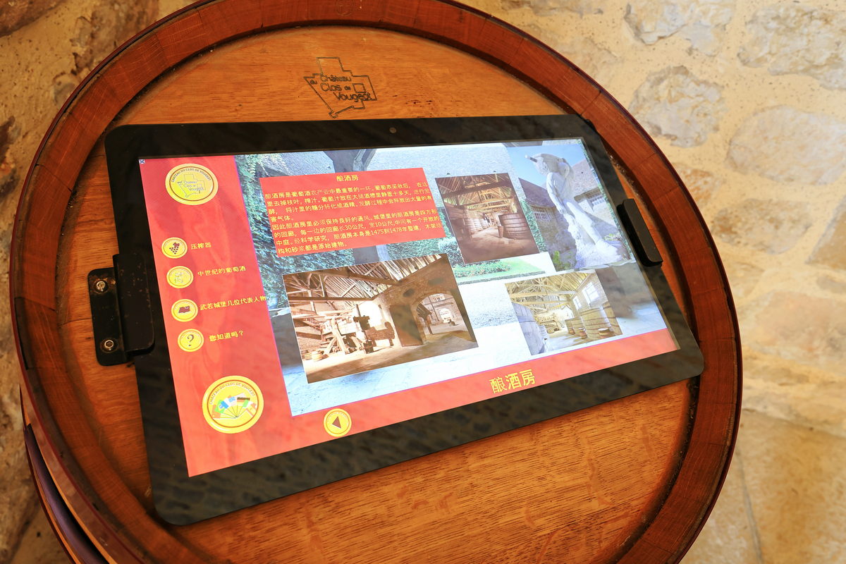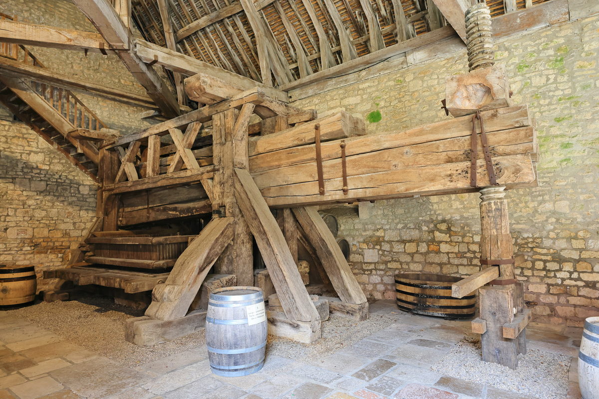 買了門票,穿過古老的大門,走進莊園之中,首先映入眼簾的即是寬敞的內院廣場與中世紀已留存迄今的釀酒房、酒窖等建築,光是在此欣賞著眼前以石材、木料所構築的建築,即便歷經超過900年,還能保存得如此完善,一度以為這是拍攝中世紀故事的電影場景那樣不真實感呢。接著隨著中文導覽的指引一路走進充滿歷史的釀酒房,而早在這座莊園蓋成如今眼前的城堡樣貌之前,這座釀酒房已於西元1475-1478年間利用砂漿、木材等建材構築完畢,並保留迄今,因此可一窺15世紀時,勃根地釀製葡萄酒時所使用的木桶、水井、刻畫著昔日工人採摘葡萄的雕像等物件,其中最令人感到震撼的則是需要眾多男人一同奮力轉動絞盤,進而將收成達到4噸重的黑皮諾葡萄,完成壓榨成汁,進而後續發酵釀酒的4座巨大木製壓榨器,接著前往昔日修士們將酒桶進行存放的酒窖空間,就像是在前一日上午的酒莊地窖裡品酒一樣,有著石柱與木頭的中世紀建築特色,但卻變得更為明亮寬敞,而且相當難以想像的是,在當時,這樣的空間中,修士們利用這長25米、寬15米的空間,儲存著2000桶228公升的儲酒桶於此,不僅訴說著昔日葡萄酒在宗教上,有著相當重要的地位,同時也訴說著昔日釀酒技術已是相當純熟,有著相當充沛的自給自足產量呢。
