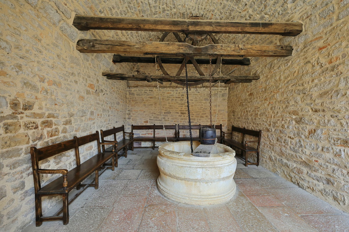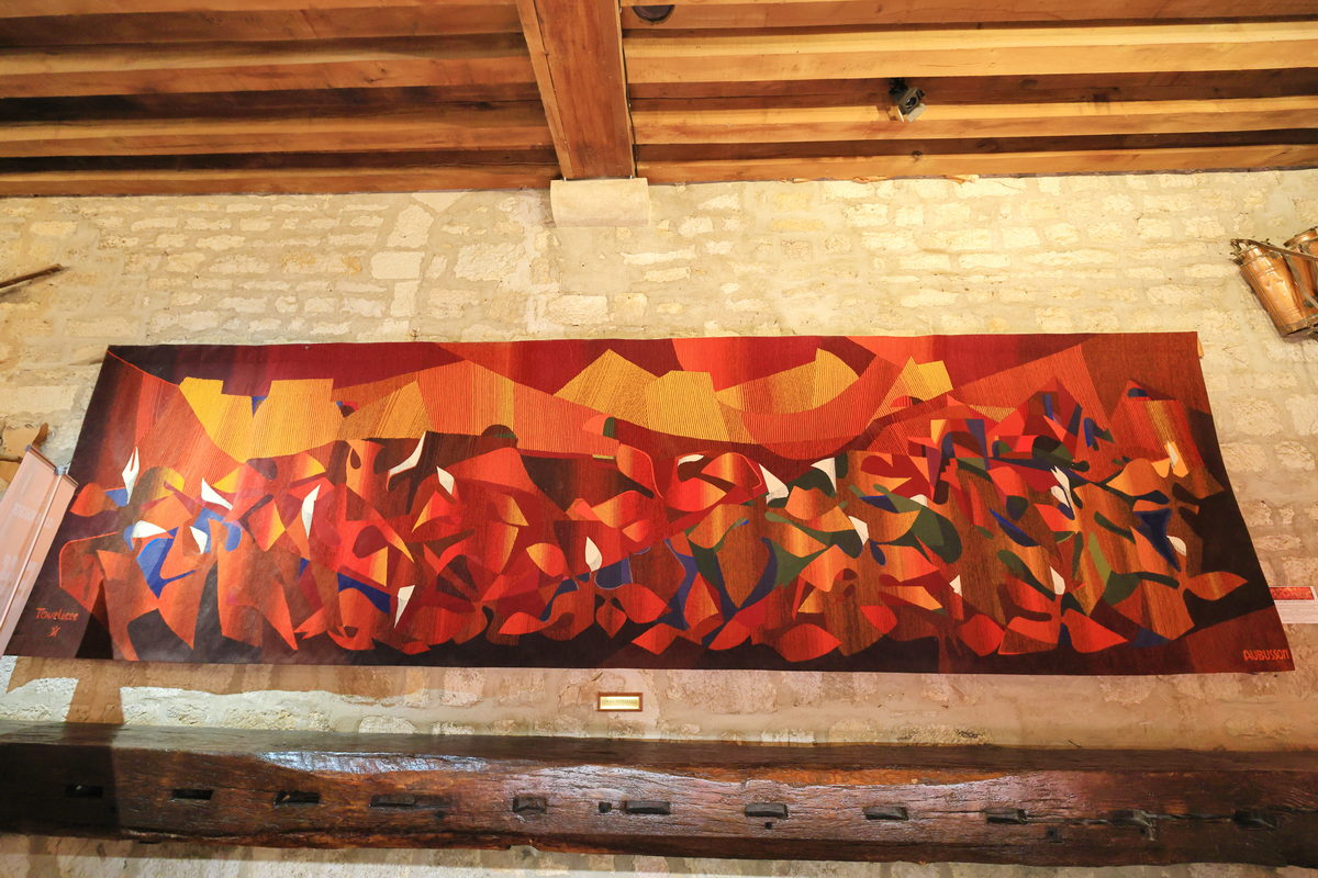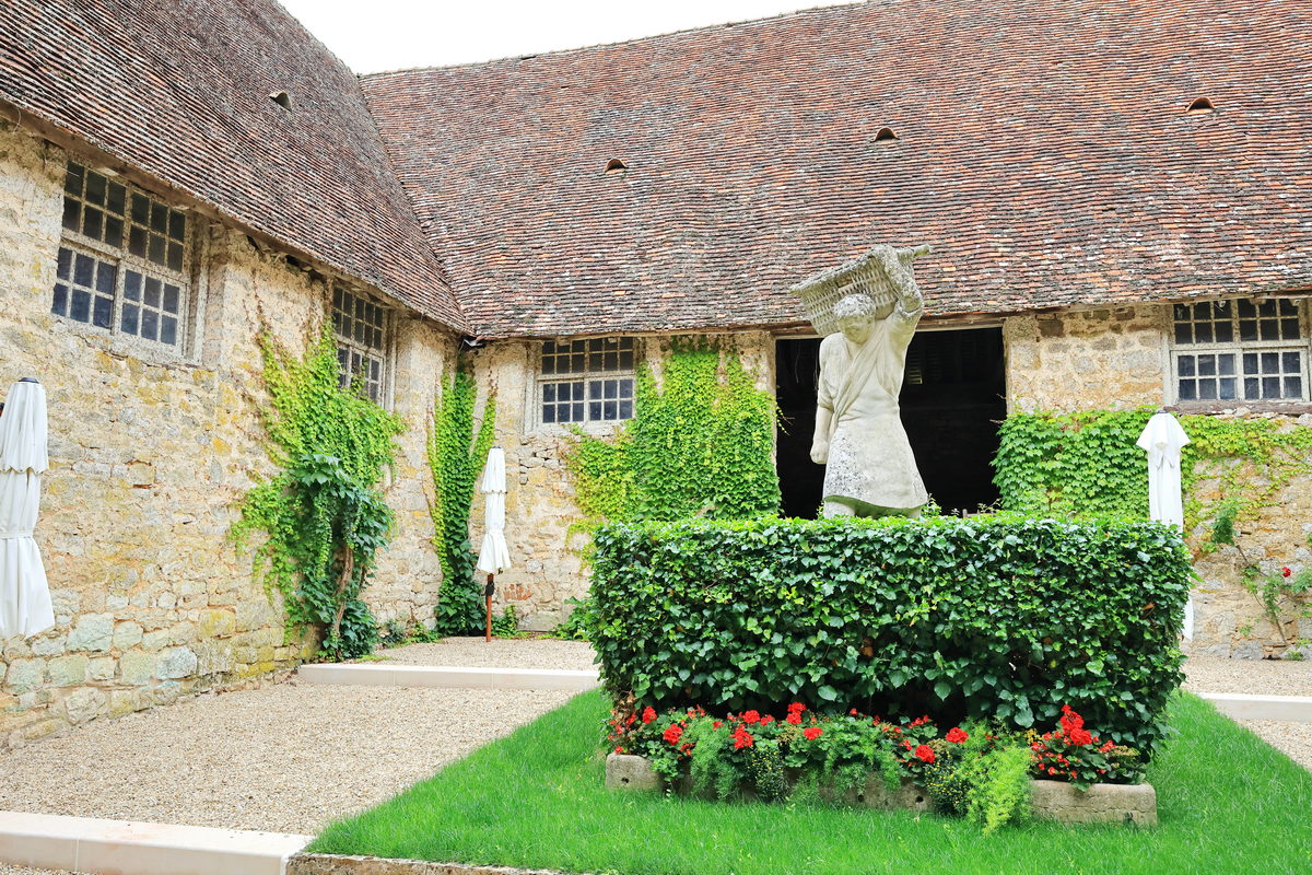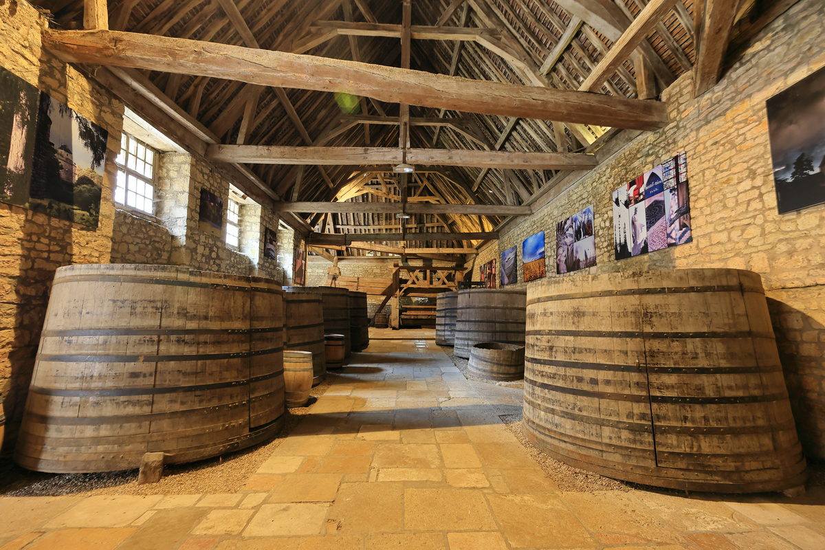 買了門票,穿過古老的大門,走進莊園之中,首先映入眼簾的即是寬敞的內院廣場與中世紀已留存迄今的釀酒房、酒窖等建築,光是在此欣賞著眼前以石材、木料所構築的建築,即便歷經超過900年,還能保存得如此完善,一度以為這是拍攝中世紀故事的電影場景那樣不真實感呢。接著隨著中文導覽的指引一路走進充滿歷史的釀酒房,而早在這座莊園蓋成如今眼前的城堡樣貌之前,這座釀酒房已於西元1475-1478年間利用砂漿、木材等建材構築完畢,並保留迄今,因此可一窺15世紀時,勃根地釀製葡萄酒時所使用的木桶、水井、刻畫著昔日工人採摘葡萄的雕像等物件,其中最令人感到震撼的則是需要眾多男人一同奮力轉動絞盤,進而將收成達到4噸重的黑皮諾葡萄,完成壓榨成汁,進而後續發酵釀酒的4座巨大木製壓榨器,接著前往昔日修士們將酒桶進行存放的酒窖空間,就像是在前一日上午的酒莊地窖裡品酒一樣,有著石柱與木頭的中世紀建築特色,但卻變得更為明亮寬敞,而且相當難以想像的是,在當時,這樣的空間中,修士們利用這長25米、寬15米的空間,儲存著2000桶228公升的儲酒桶於此,不僅訴說著昔日葡萄酒在宗教上,有著相當重要的地位,同時也訴說著昔日釀酒技術已是相當純熟,有著相當充沛的自給自足產量呢。