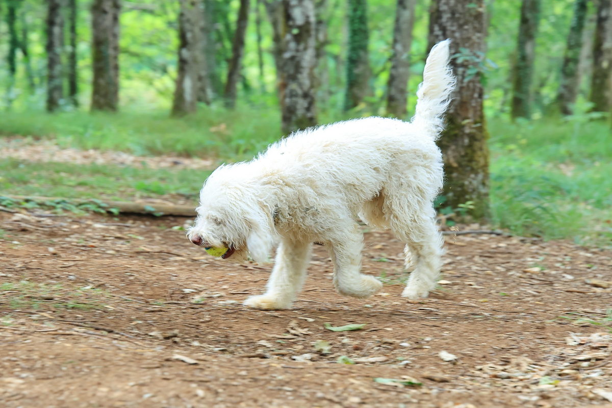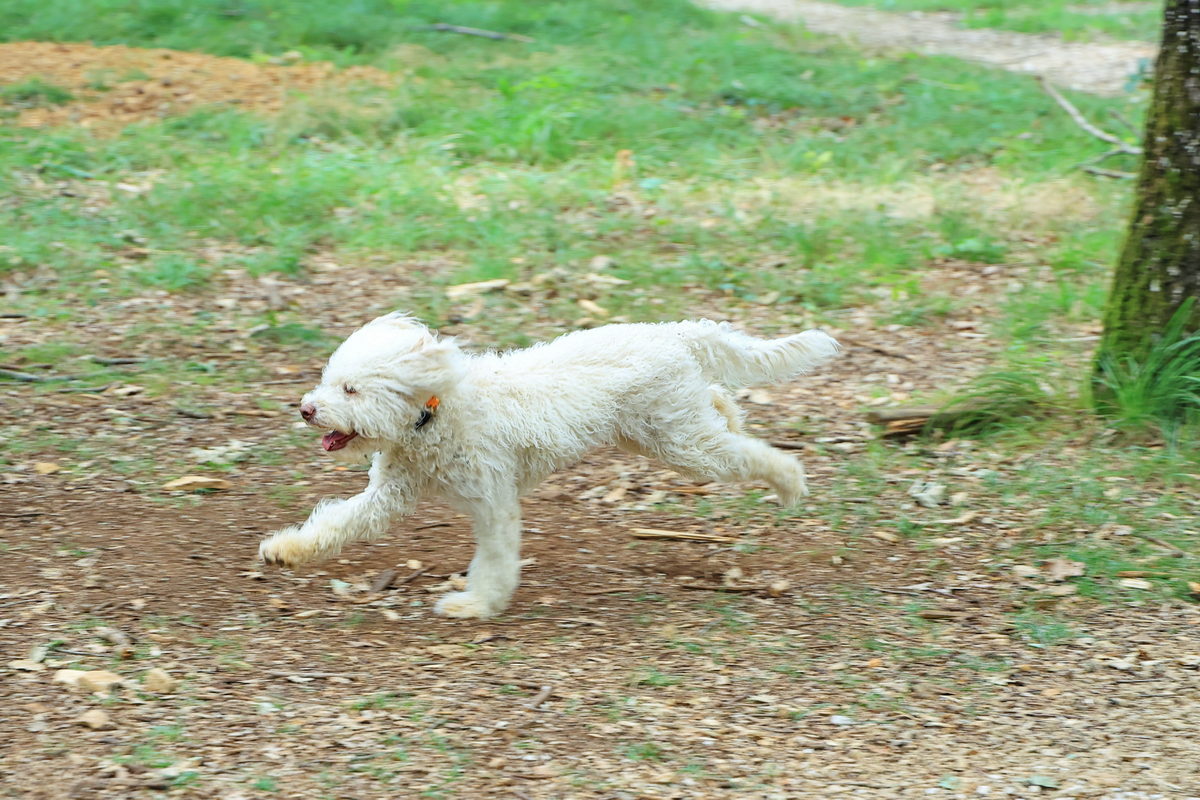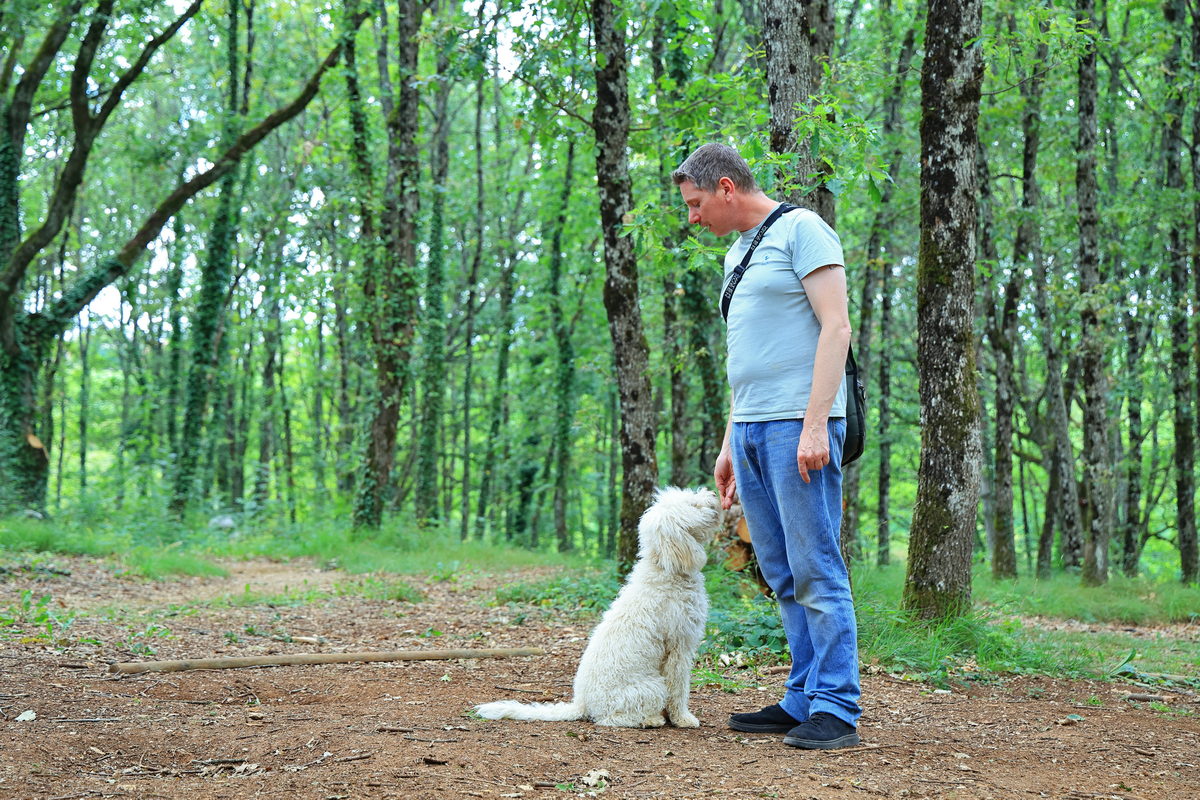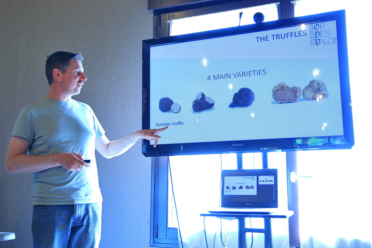在餐廳櫃檯報到完畢後,首先松露獵人帶著我們進行活動前的簡報,簡報的內容從認識各種松露的風味、盛產的季節等資訊之外,接著分享獵犬尋找松露的訓練技巧,以及利用豬隻尋找松露之間的差異,而獵人所養的這隻像是絨毛娃娃的可愛獵犬Taïga,除了從小開始豢養之外,利用犬隻喜歡玩拉扯與你丟我撿的遊戲,先將網球、毛布塗上些許松露油,讓獵犬有著聞到松露就可以玩遊戲的記憶,接著再進入野外,將網球、毛布埋藏於松露樹下,訓練獵犬挖掘尋找,最後再更換成小顆松露直到完成訓練,至於獵人分享為何不利用嗅覺更敏銳的豬隻來挖掘,原因在於除了訓練更為困難之外,豬隻有著相當高的機率將挖到的松露吃到,造成白忙一場,因此訓練獵犬尋找松露,最後再給予獎勵是最有效率的做法。