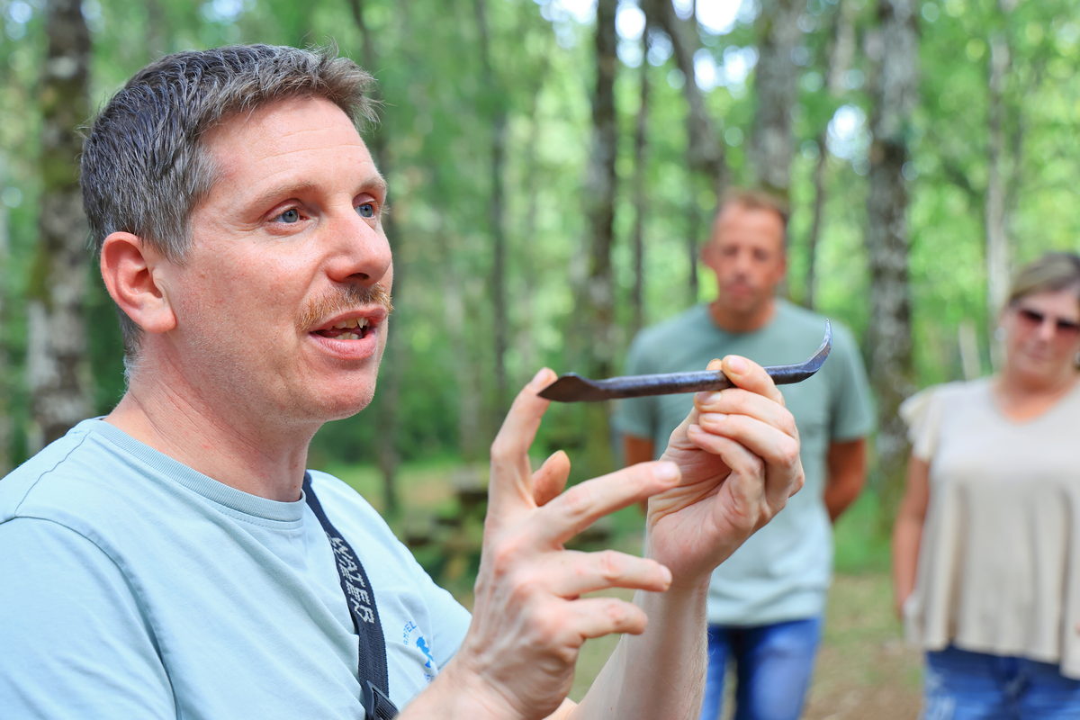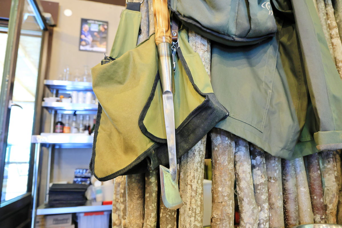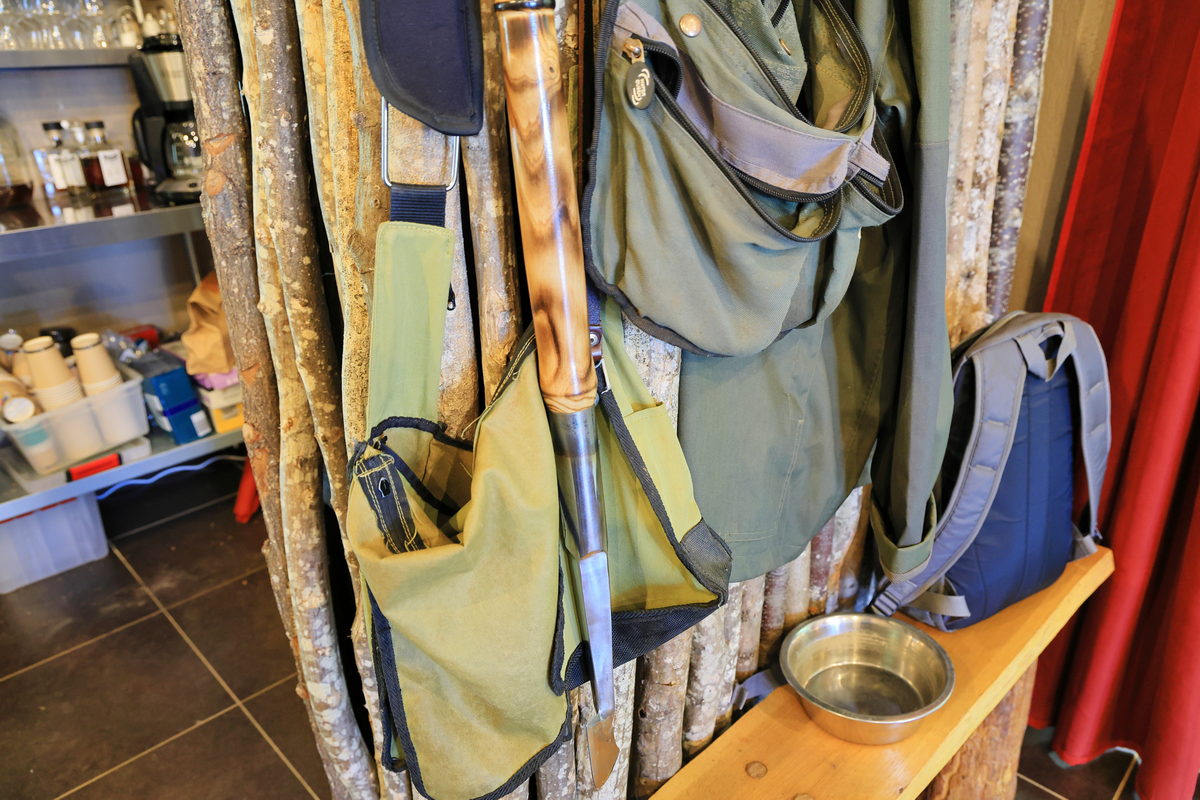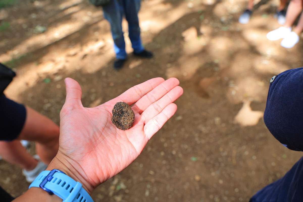 簡報完畢後,獵人背上裝備,帶著獵犬與我們一同進入餐廳後方的森林,此時他跟我們分享,一進入森林後,獵犬與他就是彼此照料的共同夥伴,因此盡可能不要打擾與接近他們,而對我們這些外行人來說,看著獵人帶著Taïga穿梭於樹林之間就像是在玩一場戶外的你丟我撿遊戲,Taïga不斷地嗅著地面可能有松露的氣息,進而透過前腳挖掘地面,找到松露後再給予獵人換取餅乾零食以及討摸摸騷肚的獎勵,看著這可愛的一幕,讓我也想跟我的狗狗一起這樣在玩樂中訓練起找松露的本領了呢!