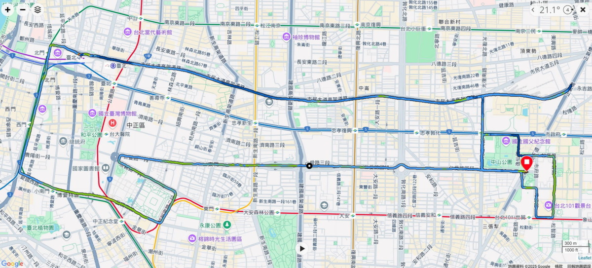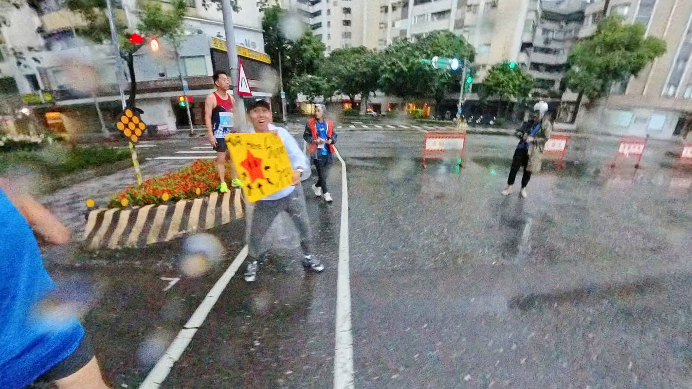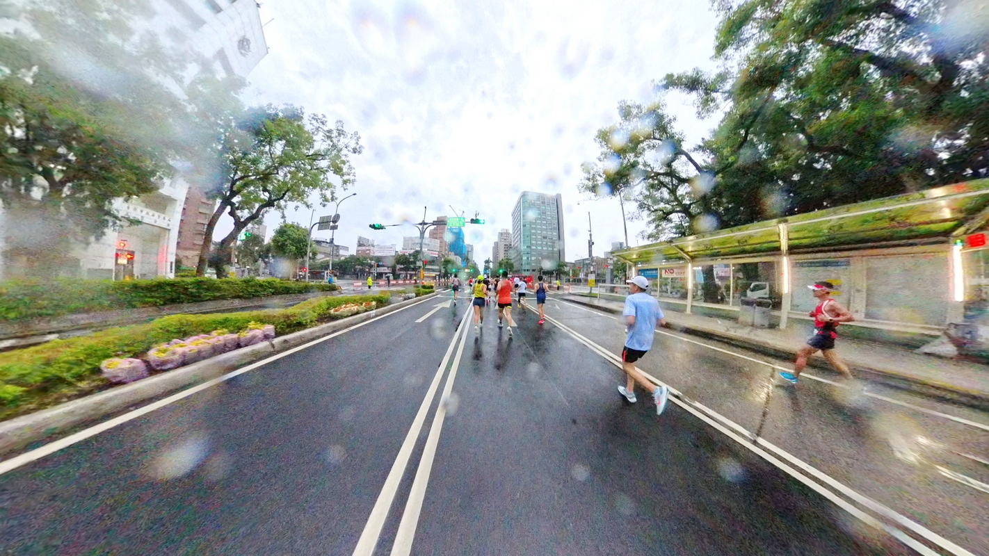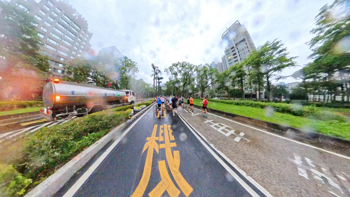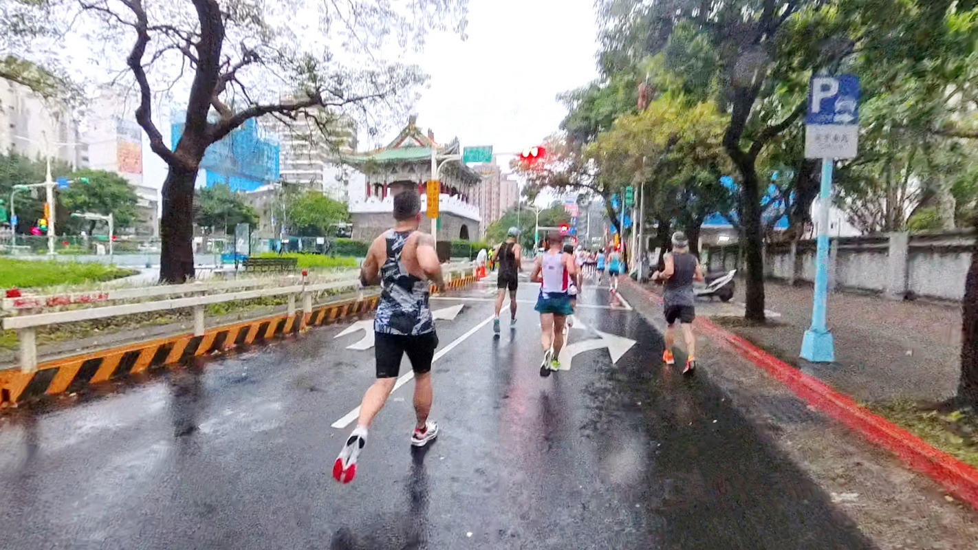 在信義都會區跑完將近4k的繞圈後,接著是在筆直的仁愛路上通往景福門也約4k的經典路段,在這段相當翠綠的寬敞林蔭大道上,不僅透過綠樹為我們遮蔽許多天上降下的細雨,同時此時帶來清新的空氣與舒適的視覺感,跑起來實在是非常舒服,途經仁愛路/安和路交叉口時看見跑步教練梁哲睿舉著無敵星星的加油牌為大家加油打氣,進入遼闊的仁愛圓環後,以27分18秒的時間完成5k,接著經過此時此刻不太需要降溫的灑水車洗禮,一路穩定且舒服的頻率下,讓我不知不覺地越跑越快,一路抵達昔日台北城東門的【景福門】,在左迴轉進入信義路,沿著中正紀念堂繞行。