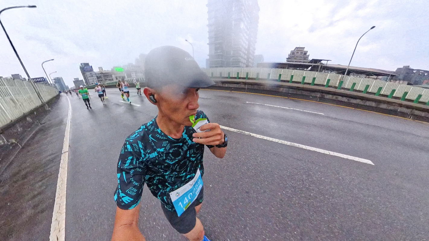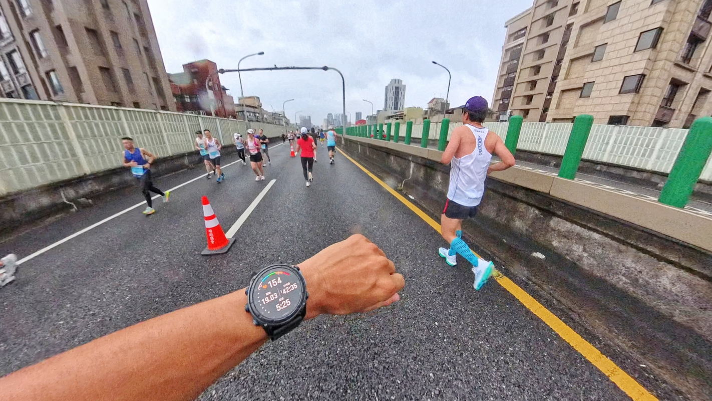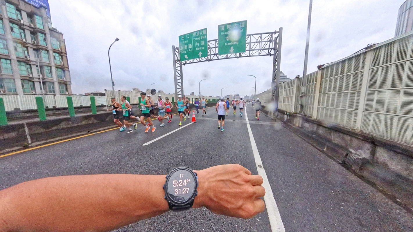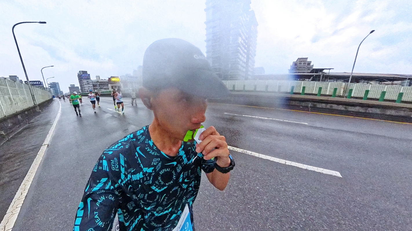 與大家一同從中華路轉進市民大道後,內心想著終於可以在大樓林立的市民大道高架路段上,透過雙腳享受台北路跑賽歷史中首次於市民大道舉行的慢跑風景了,殊不知,從12.5k位於機場捷運A1出口的匝道開始進入市民大道高架路段開始,一路前往位於18k處的折返點,這一段將近6k的路程中,不僅從有著15m的垂直爬升落差之外,同時在這段由西向東的路線中,更是一路緩上坡並伴隨著逆風的吹拂的天氣型態,因此我從原本欣賞風景的期待心情,隨著這段逆風上坡,逐漸消弭享受的期待感,取而代之的是,更為專注自己在上坡路段時,腳步、呼吸以及心率之間的節奏,同時因應體力已將消耗殆盡的後半賽段,避免被這6k的上坡拖垮而爆掉,改變策略,提早於15k進行第2次的果膠補給。